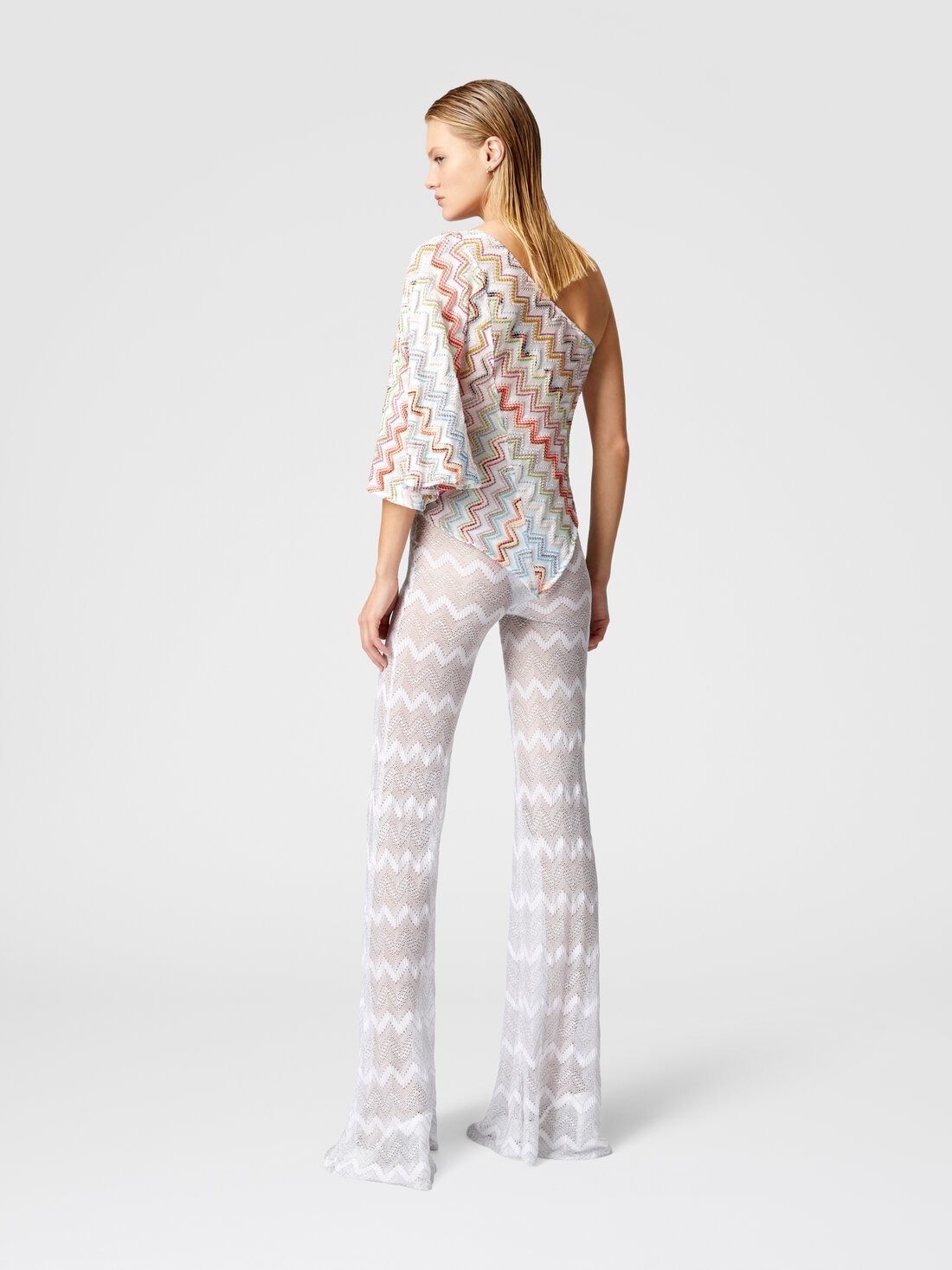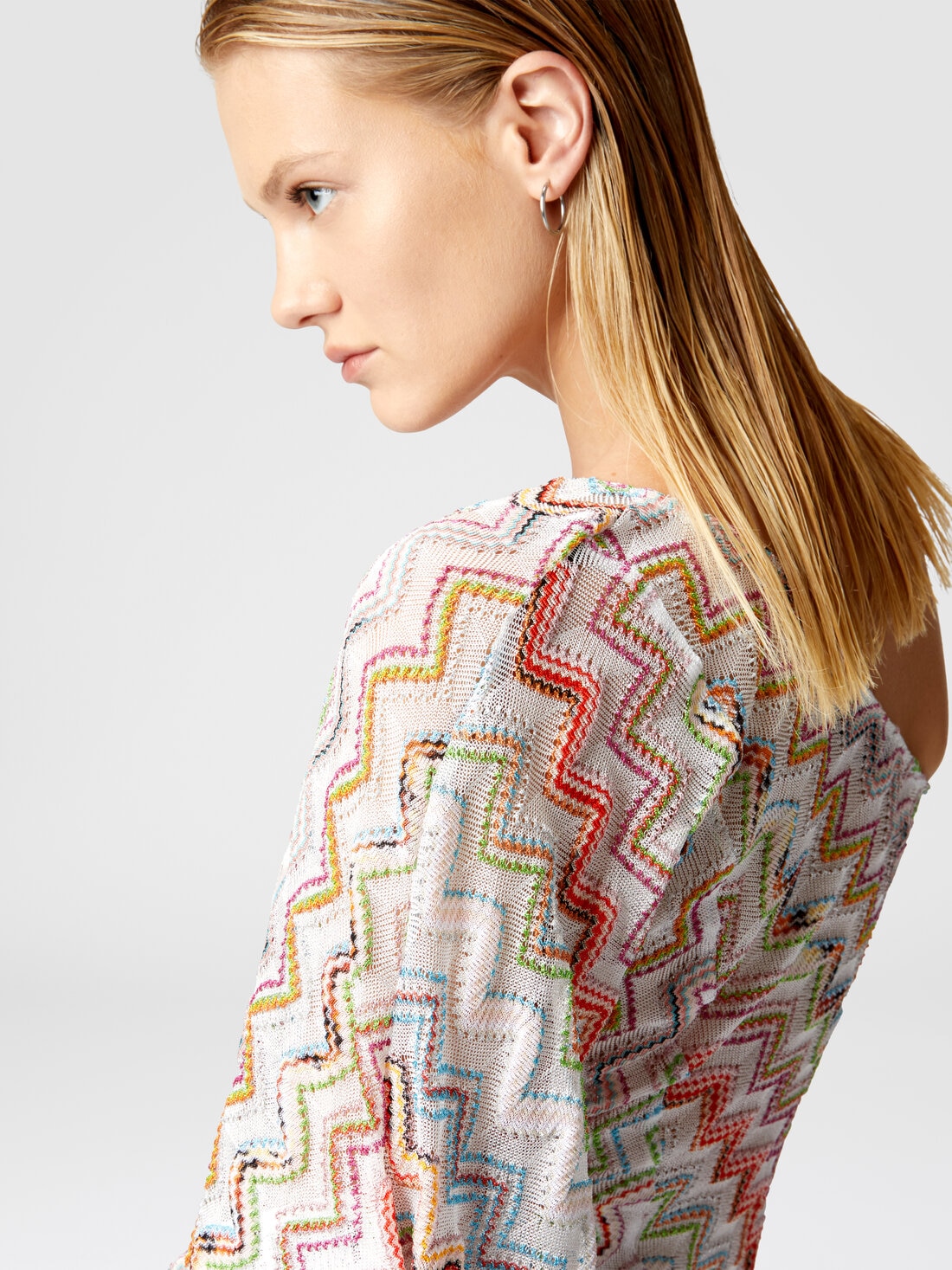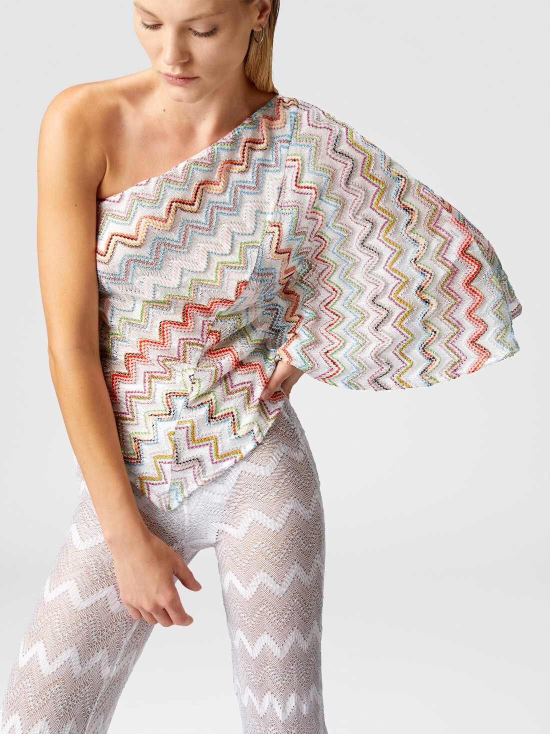 Top monospalla con l'iconico motivo zig-zag in lamé 3D, espressione dello stile raffinato di Missoni. Realizzato con lavorazione Raschel, presenta una manica ampia e un orlo asimmetrico, che aggiungono movimento e carattere al design. Un capo unico che unisce dettagli ricercati e vestibilità confortevole.