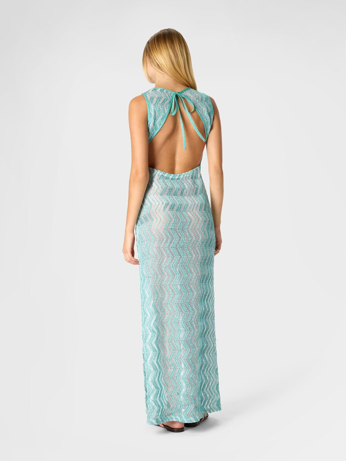 Il motivo a rete zig zag con paillettes anima questo abito copricostume lungo da donna in viscosa lamé, impreziosito da un dettaglio cut-out posteriore e da uno spacco laterale. Un capo che unisce luminosità, artigianalità e l’inconfondibile eleganza Missoni.