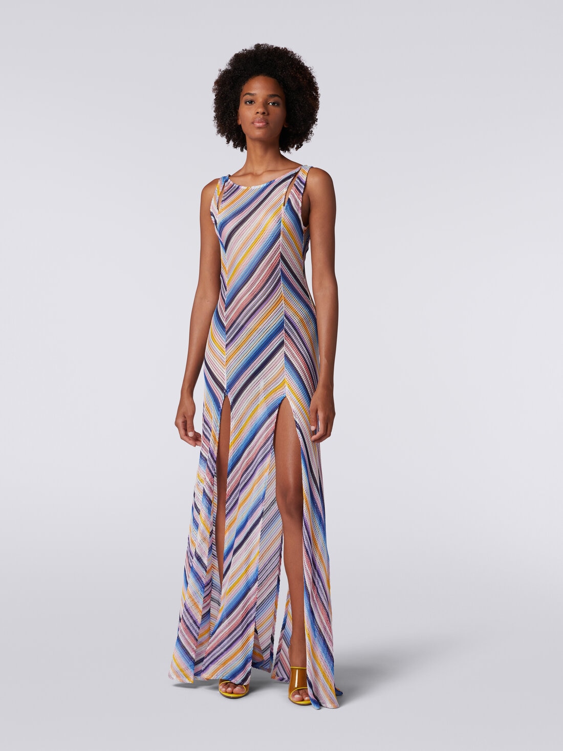 Punta tutto sul raffinato gioco di dettagli cut out e spacchi, l'abito copricostume lungo da donna. Realizzato in maglia di viscosa crochet con motivo rigato, il capo è composto assemblando lembi di tessuto in cui l'orientamento delle righe genera un inedito effetto ottico.