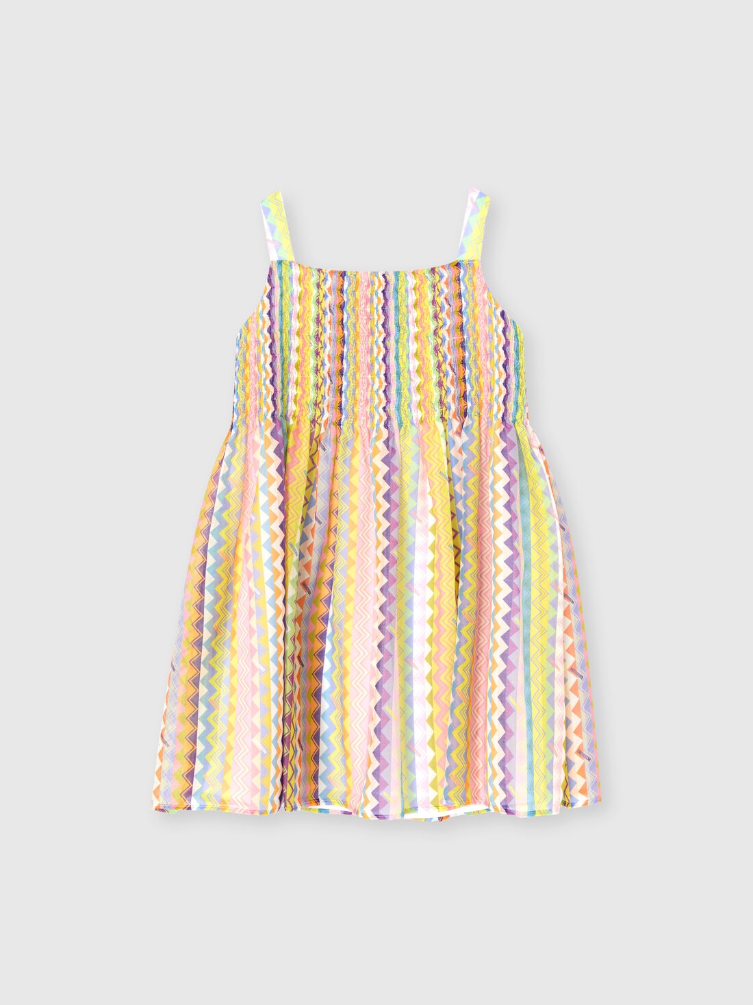 Vivace e sofisticato, questo vestito da bambina celebra lo stile iconico di Missoni con la sua stampa zig zag dall’irregolare geometria. La parte superiore elasticizzata assicura una vestibilità confortevole, mentre la gonna svasata dona leggerezza e movimento. Un capo perfetto per un look giocoso ma raffinato, ideale per ogni occasione speciale.