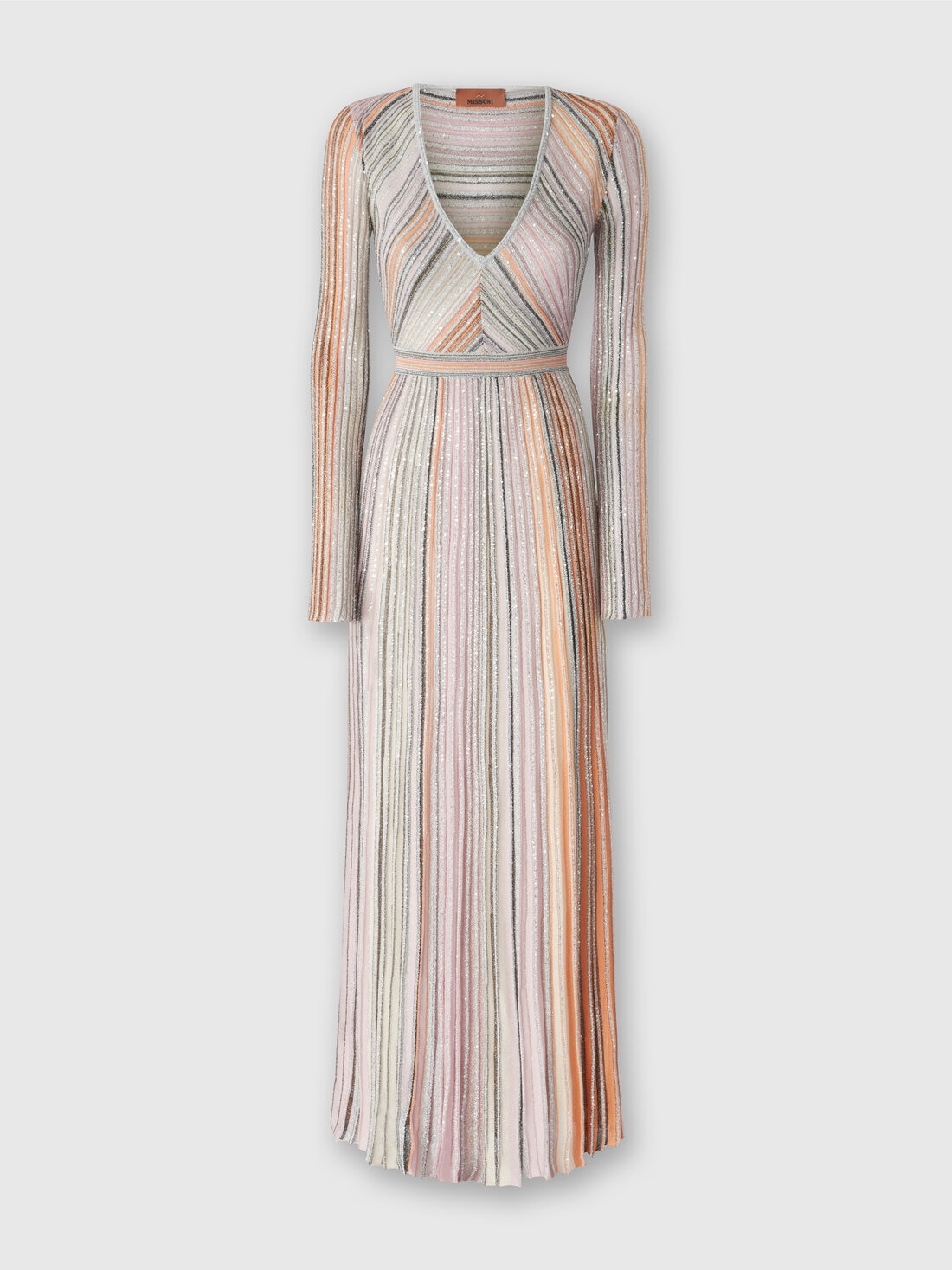 La particolare lavorazione parzializzata, che infonde alla maglia un effetto plissettato, impreziosisce l'abito lungo con profonda scollatura a V. Realizzato in misto viscosa lamé, il capo è illuminato da una pioggia di paillettes applicate.