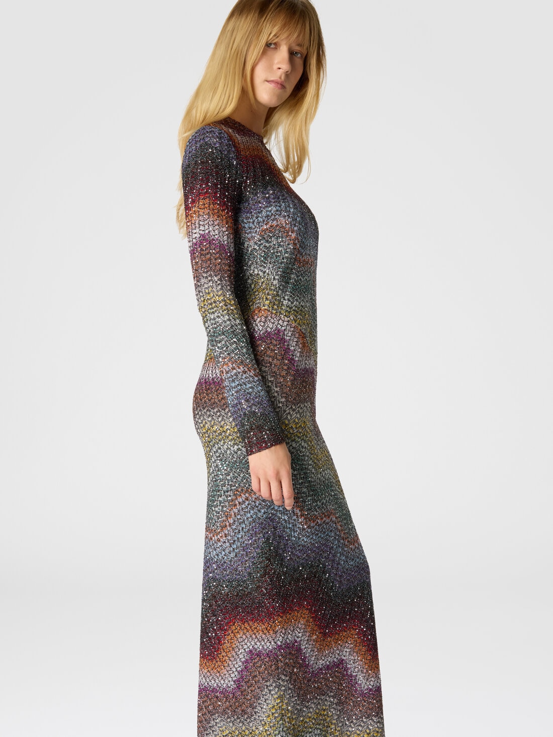 Abito lungo manica lunga in maglia zig zag greca con paillettes
