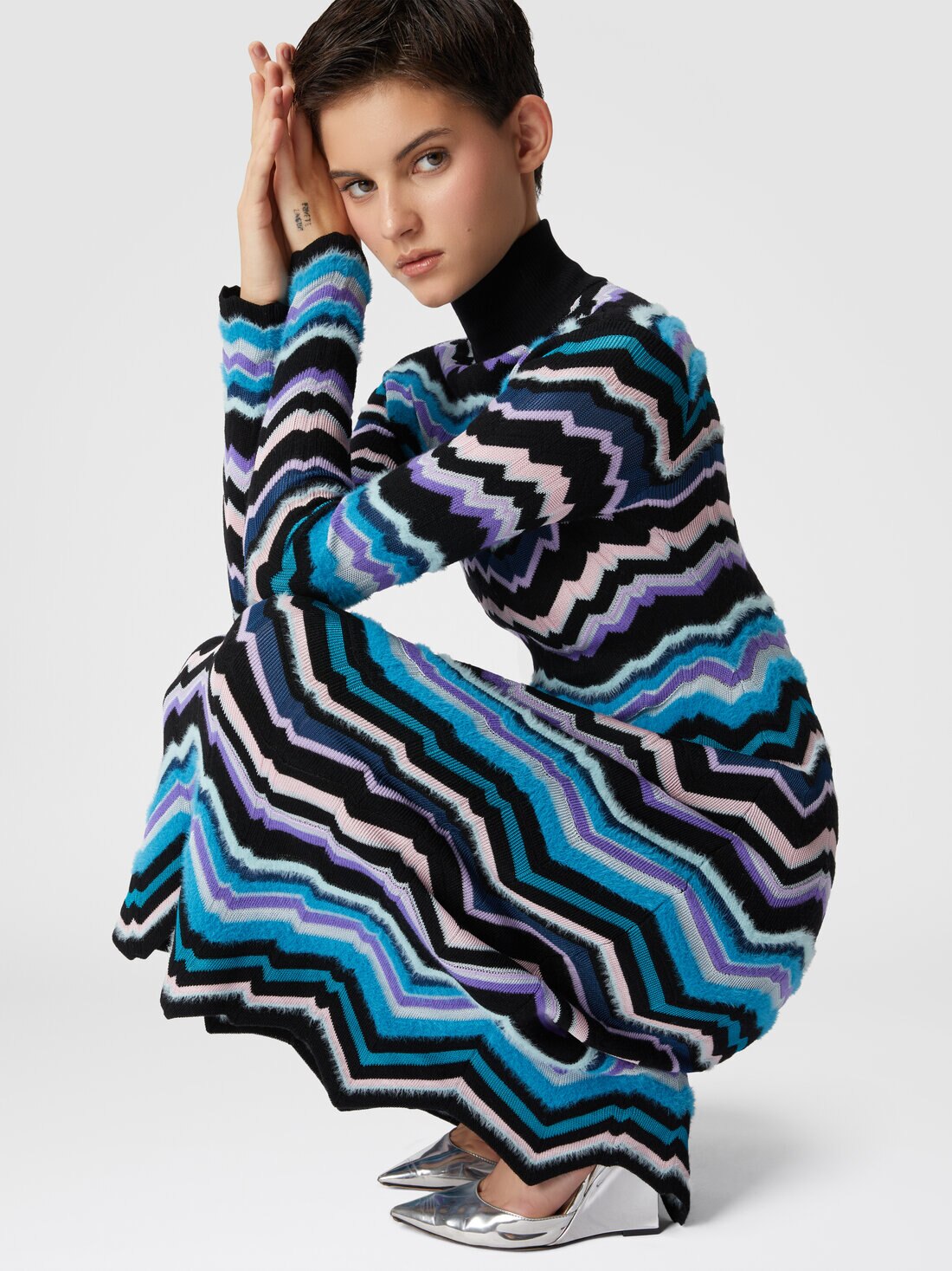 L'everyday couture firmata Missoni si rinnova grazie alla fantasia con motivo greca a zig zag che caratterizza l'abito midi. Il filato di lana, reso soffice dalla viscosa, offre la base perfetta al modello con collo alto e fondo svasato.
