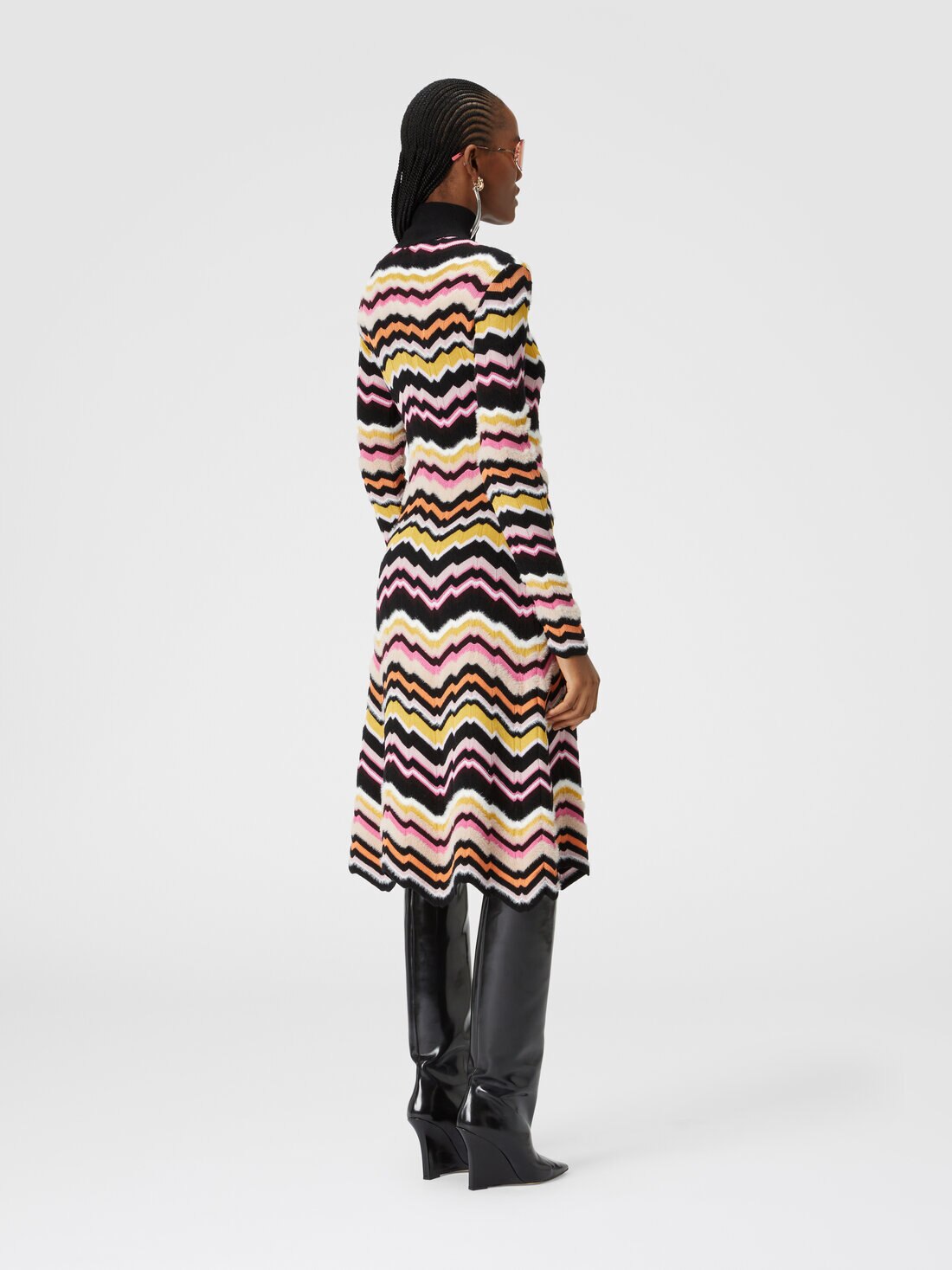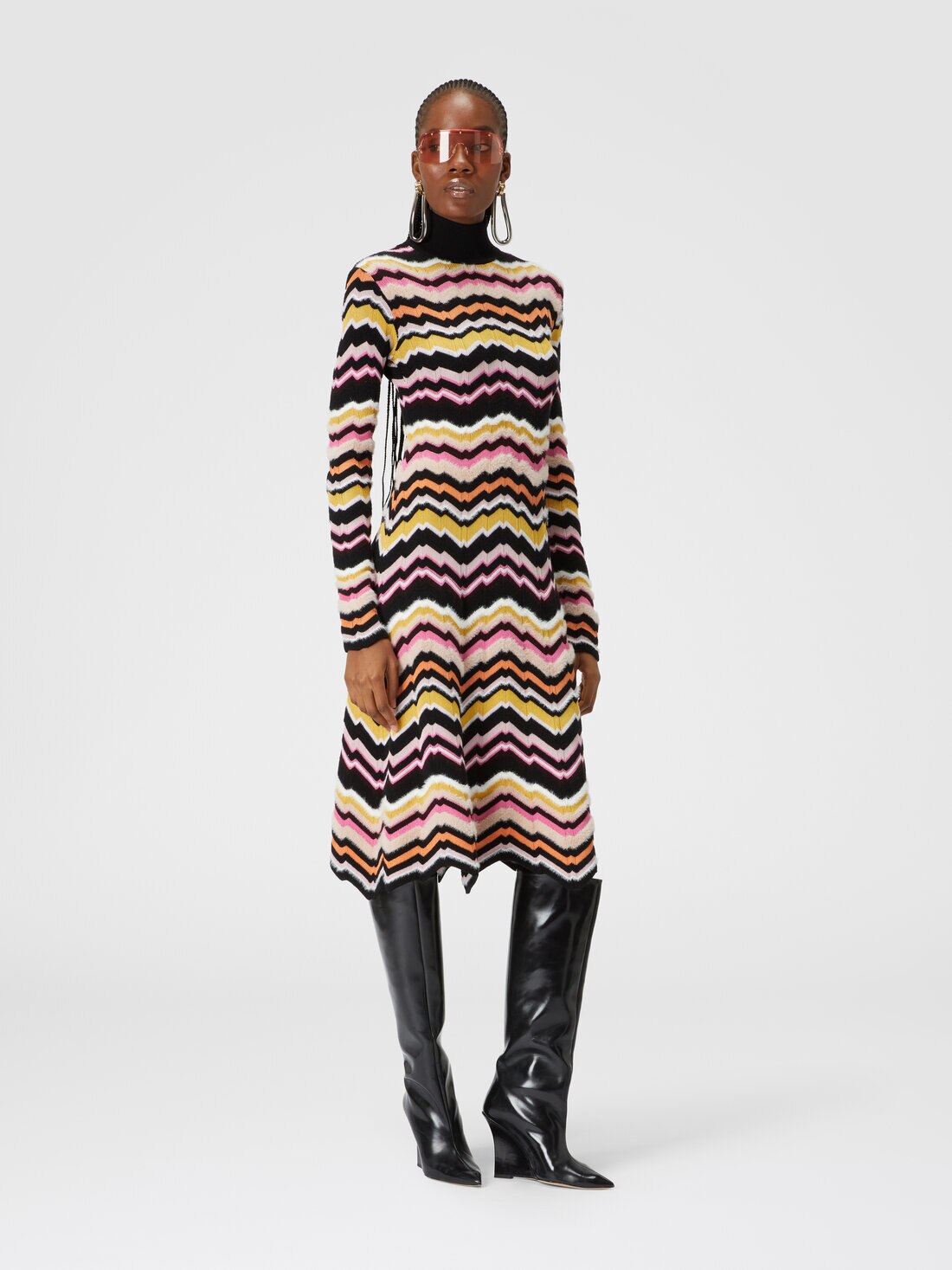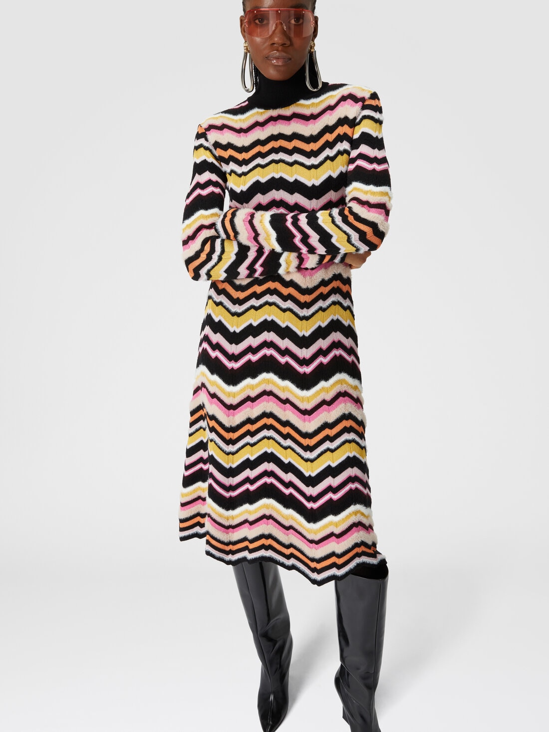 L'everyday couture firmata Missoni si rinnova grazie alla fantasia con motivo greca a zig zag che caratterizza l'abito midi. Il filato di lana, reso soffice dalla viscosa, offre la base perfetta al modello con collo alto e fondo svasato.