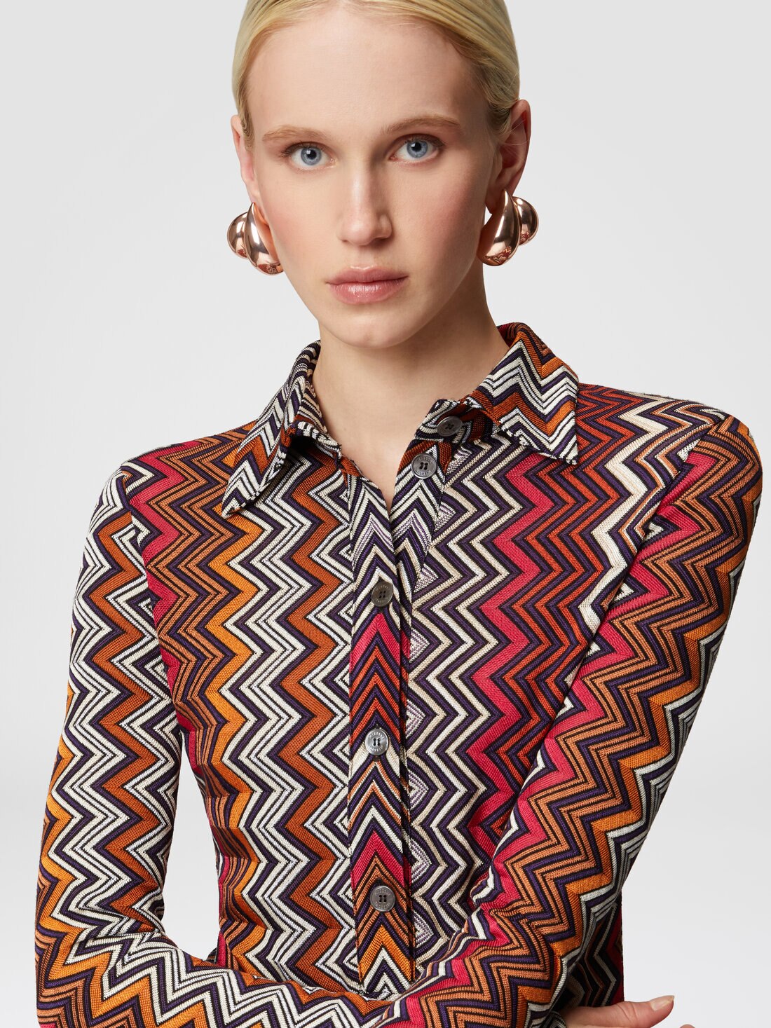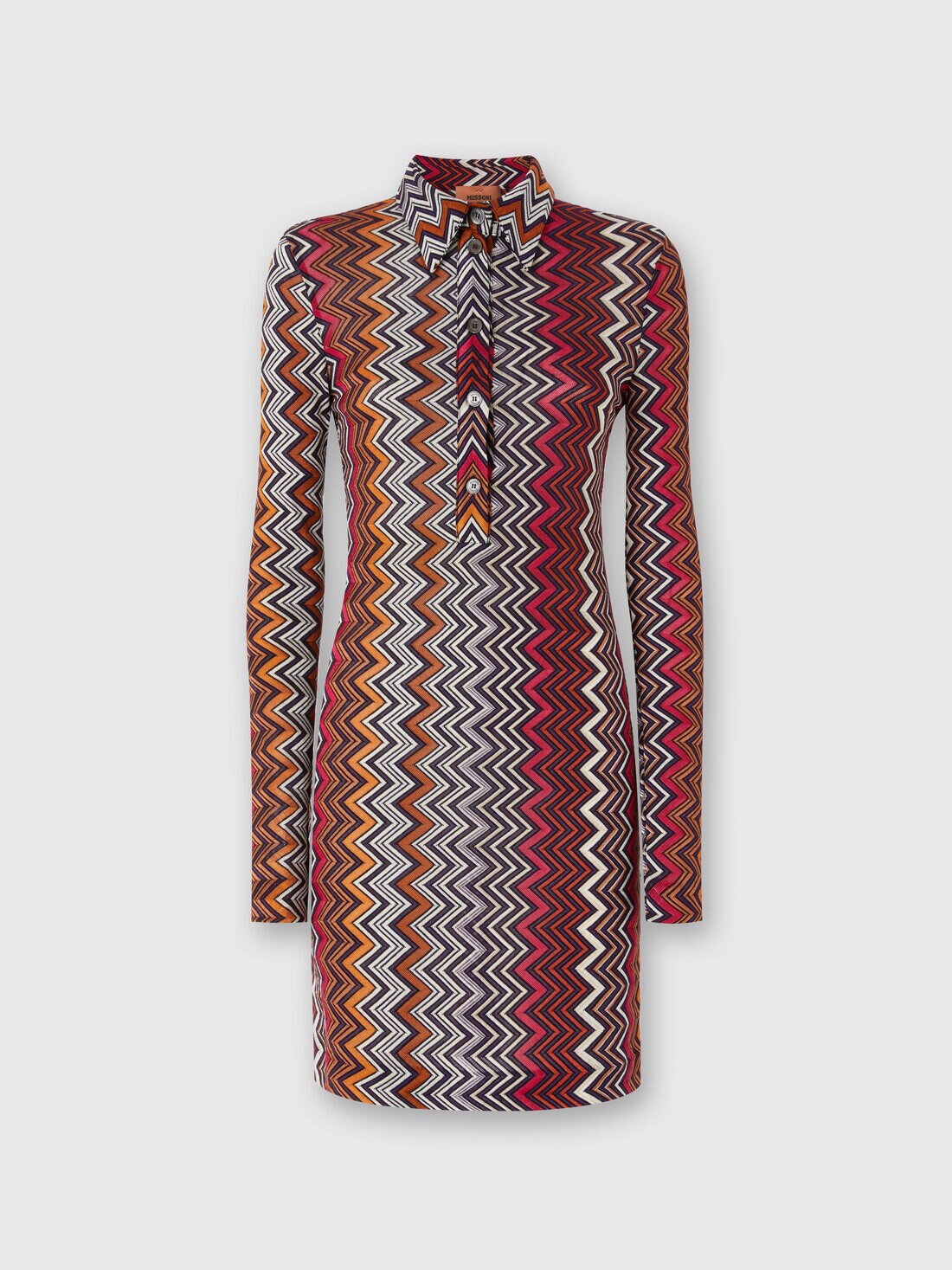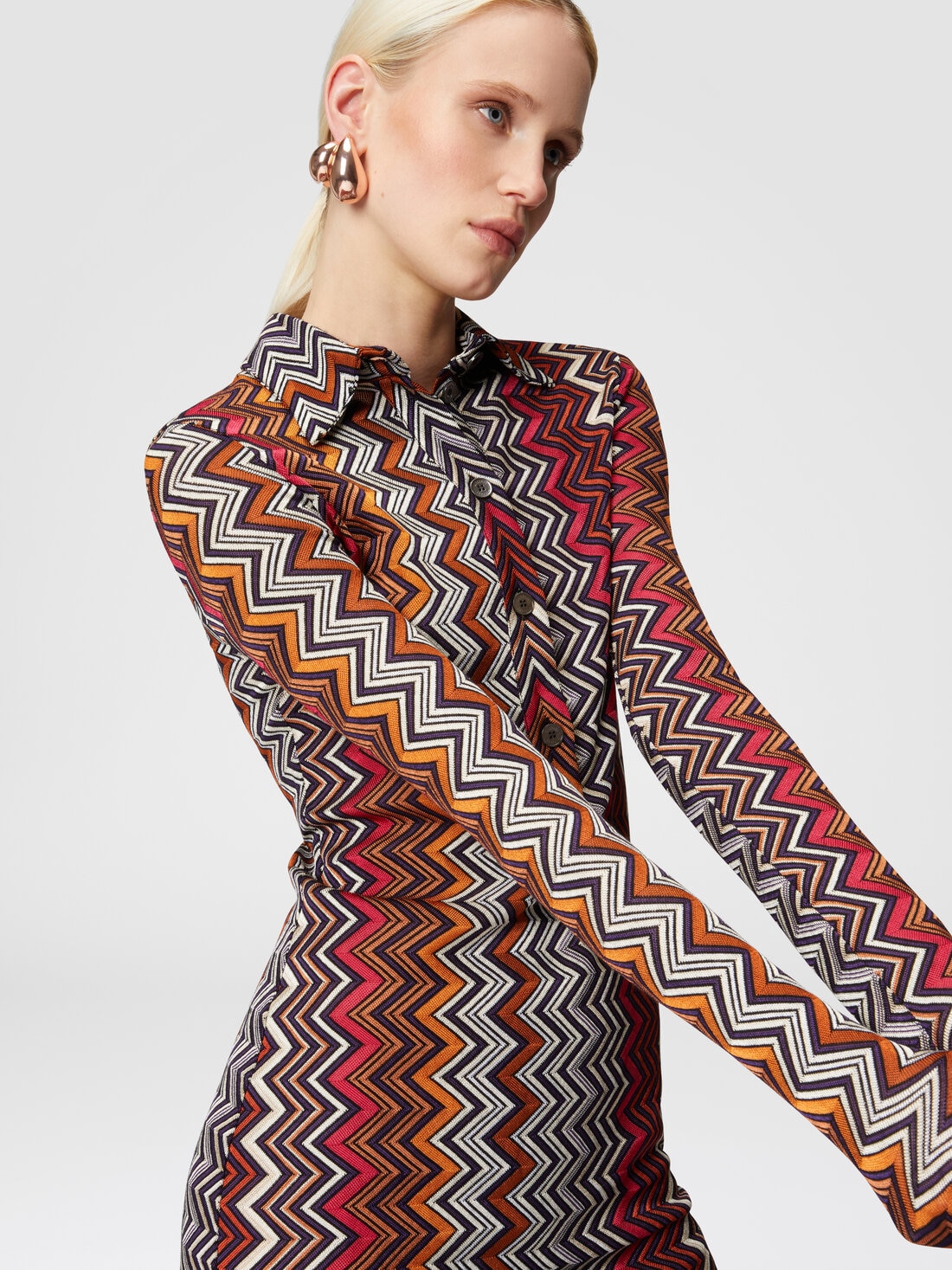 L'abito corto con colletto a polo e maniche lunghe zig zag è illuminato dalla sapiente lavorazione raschel, che garantisce al blend di viscosa e lana un finish lucido/opaco perfetto per dare un tocco inedito al daily look.