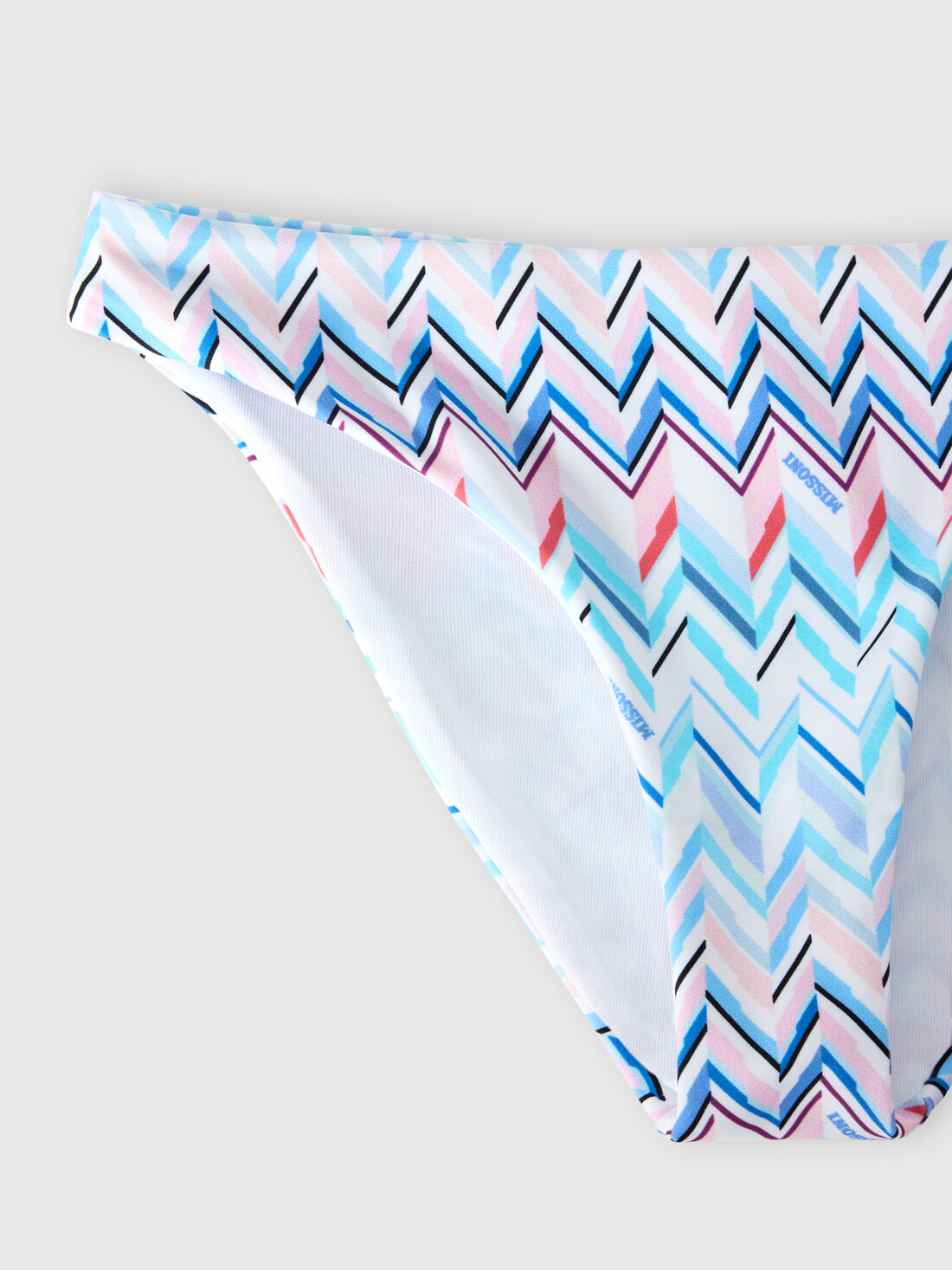 Un design fresco e iconico per la stagione estiva: questo bikini a triangolo da bambina è caratterizzato dalla stampa zig zag e dalla micro stampa del logo, discreto segno identitario della maison.