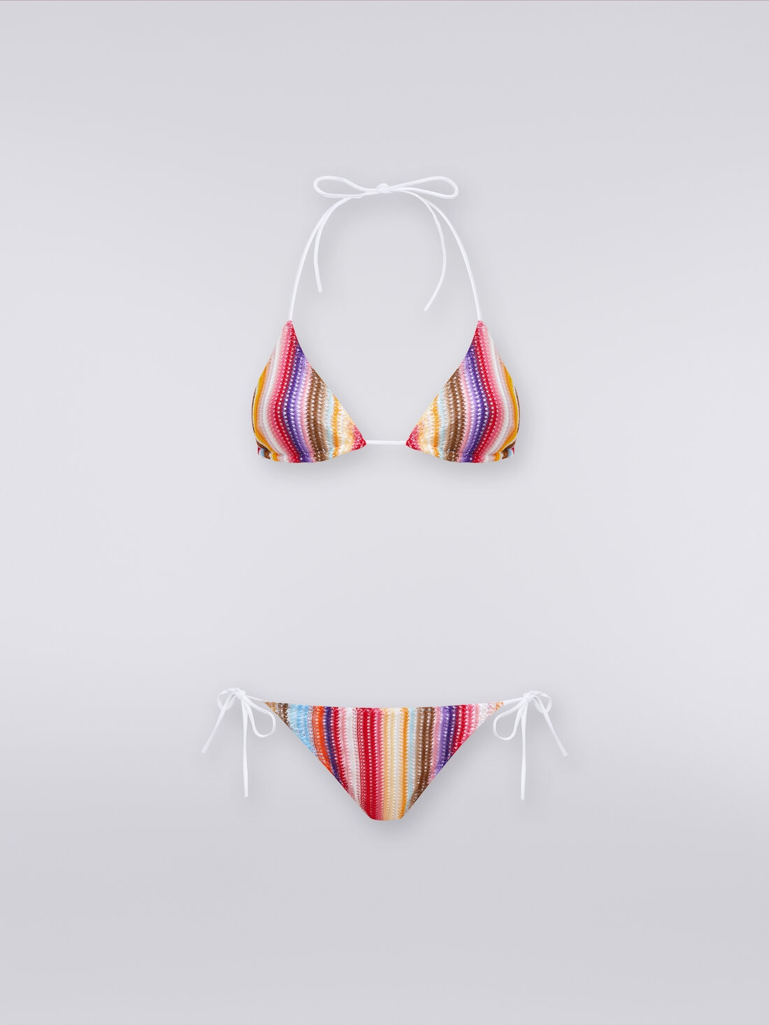 Il carattere artigianale delle creazioni Missoni è enfatizzato dalla lavorazione effetto crochet nel bikini da donna in maglia di viscosa a righe verticali. Il due pezzi classico, composto da top a triangolo e slip con laccetti, acquista così un tocco originale e pop.