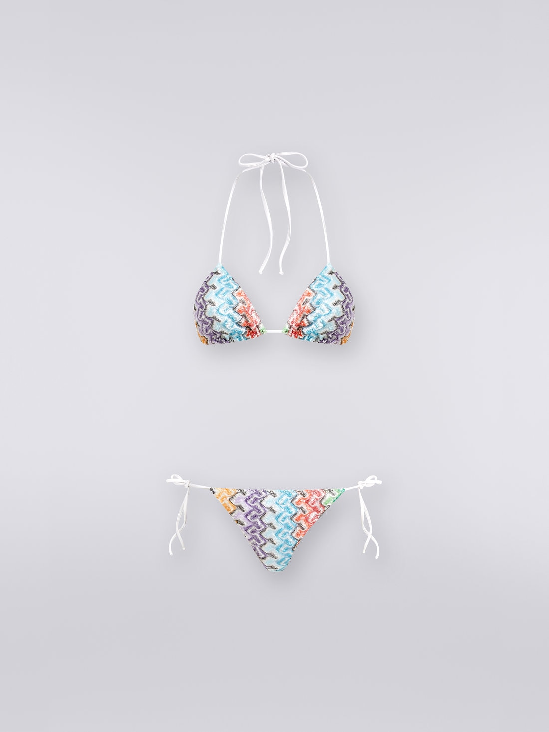 Leggera maglia di viscosa con lavorazione effetto pizzo per il bikini da donna composto da bra a triangolo e slip con laccetti. Il due pezzi firmato Missoni, versatile e contemporaneo, è la perfetta incarnazione dell'estate 2023.
