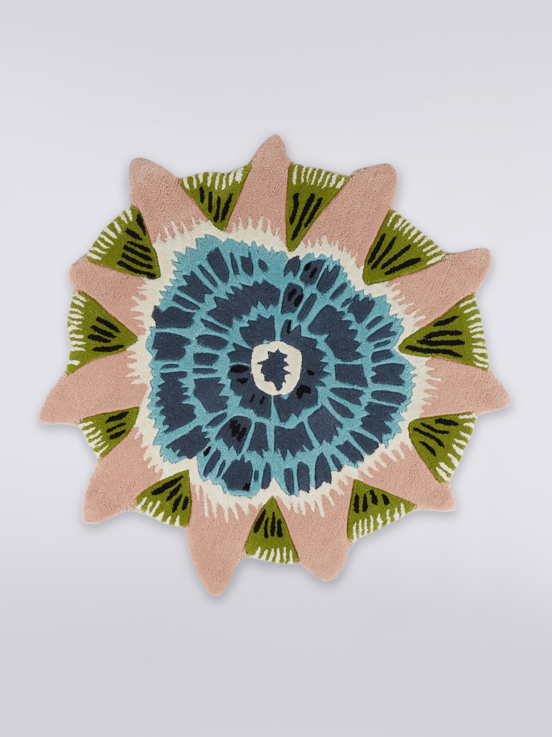 Un blend tessile di lana e viscosa impreziosisce l'allegra personalità del tappeto rotondo Botanica. Il diametro di 110 cm è perfetto per dare spazio a tutta la creatività di Missoni, che offre una versione di questo accessorio per la casa di forte ispirazione floreale.
