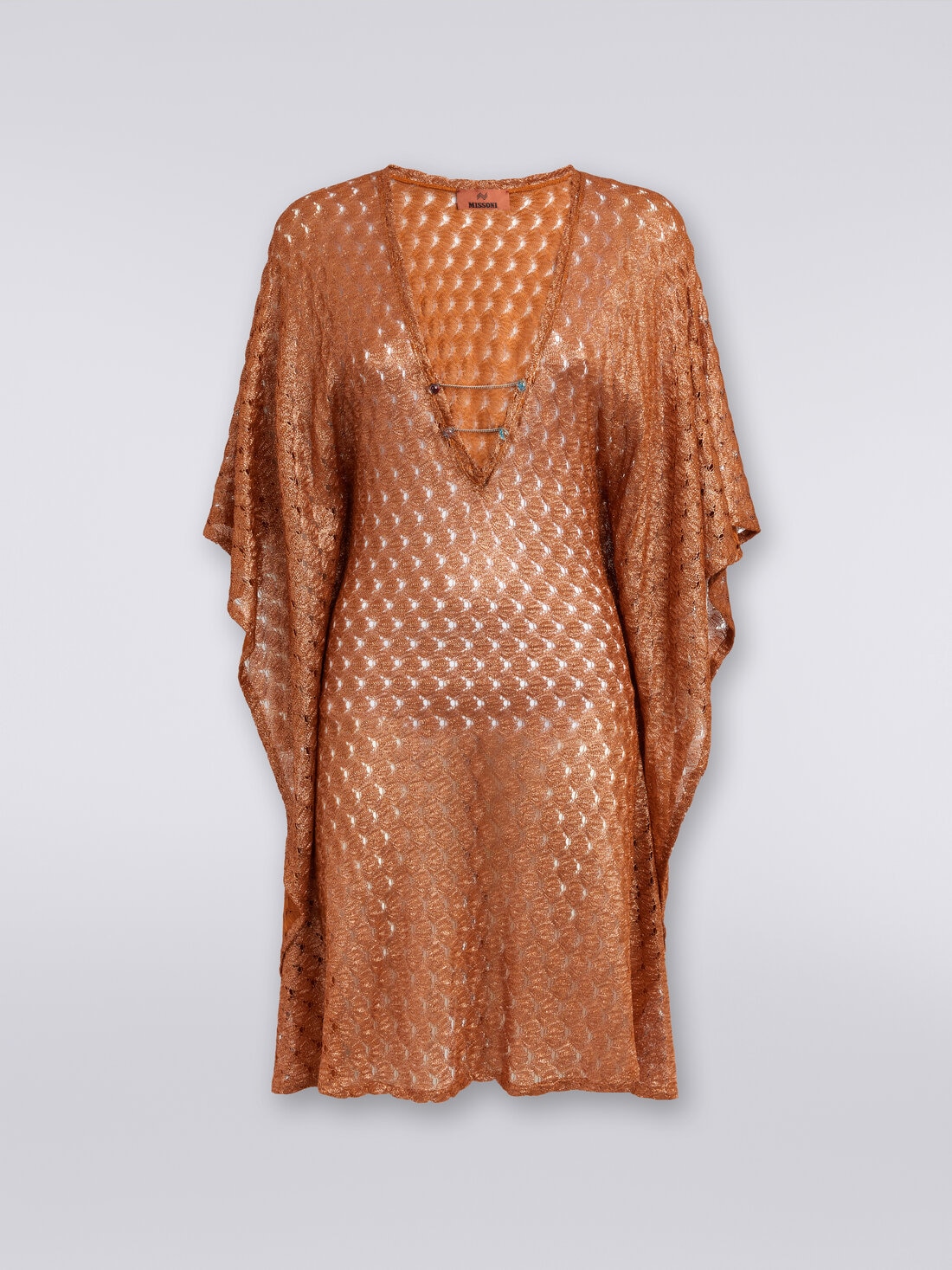 Impreziosito dalla scollatura a V, i cui lembi sono tenuti insieme dall'applicazione a catena con pietre, il caftano copricostume corto da donna è un capo perfetto per il summer look anche fuori dalla spiaggia. Merito della maglia di viscosa con lavorazione effetto pizzo, accesa da bagliori lamé.