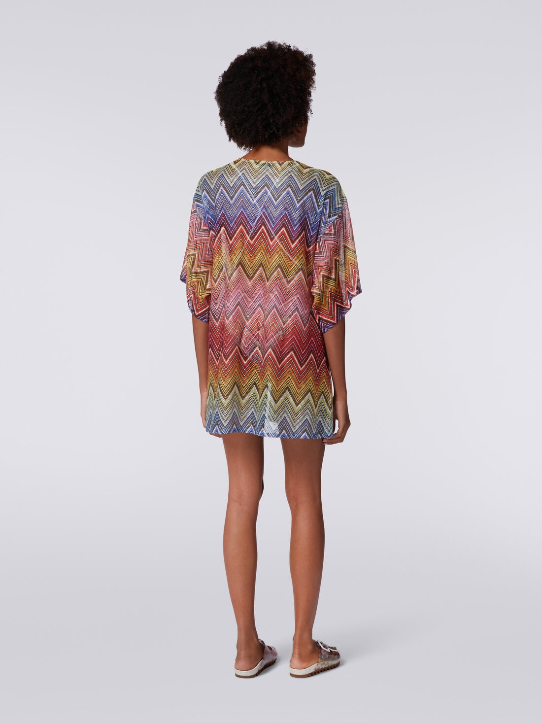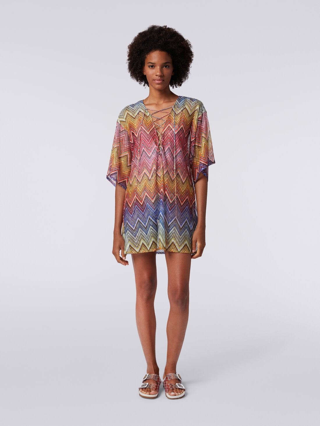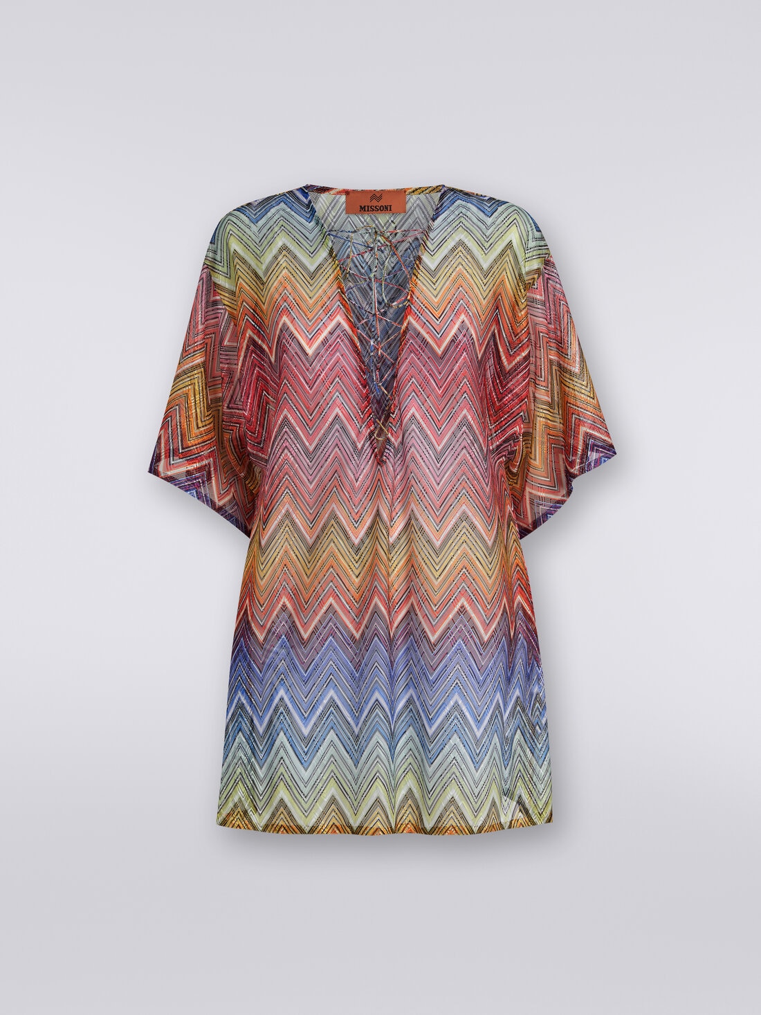 Una versione mini e sbarazzina del caftano da donna per il copricostume corto in tessuto stampa zig zag con maniche a tre quarti. La generosa scollatura a V, modulabile grazie al laccetto intrecciato, consente styling sempre diversi per questo classico del beachwear targato Missoni.