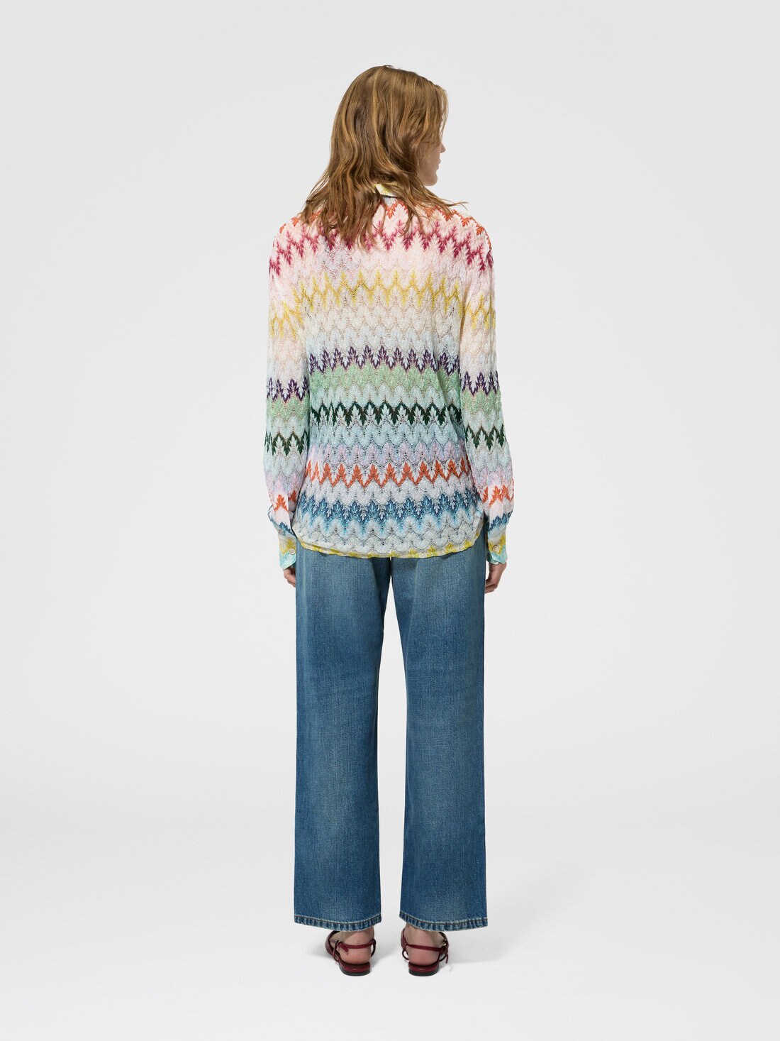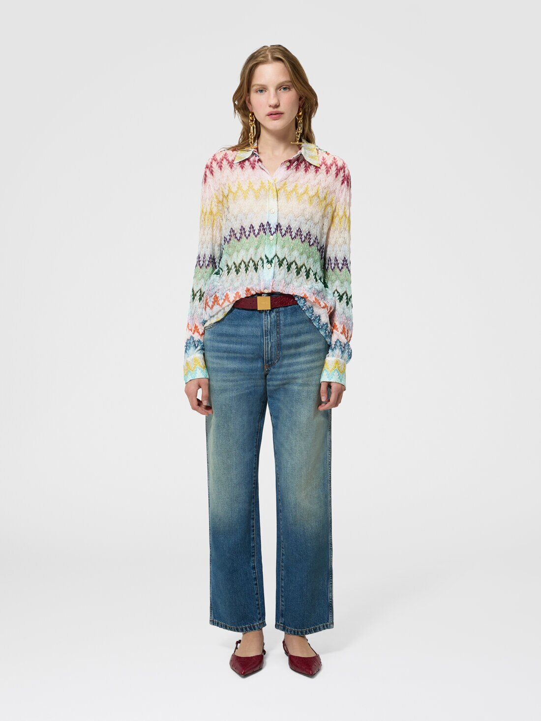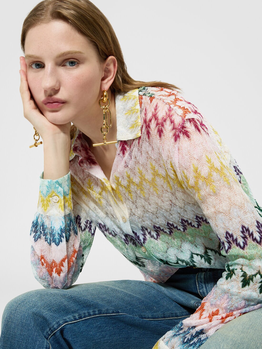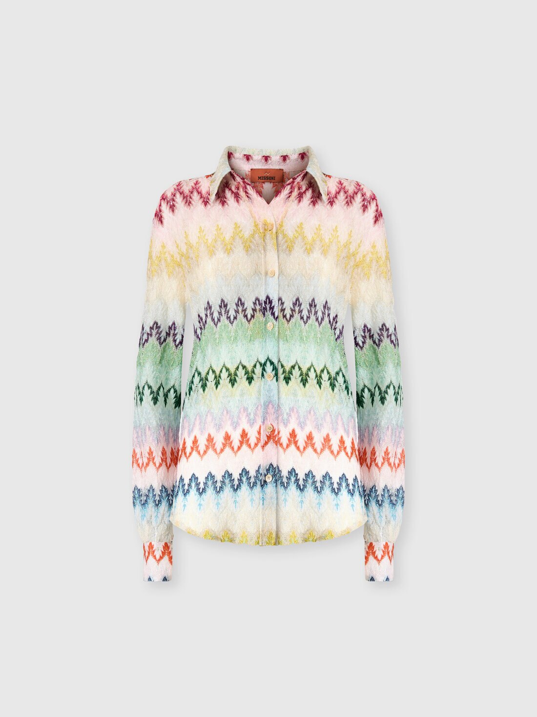 Un’eleganza luminosa caratterizza questa camicia da donna a maniche lunghe, realizzata in lavorazione raschel in pizzo zig zag in misto viscosa lamé. Un capo raffinato che valorizza la trama grafica con leggerezza e femminilità.
