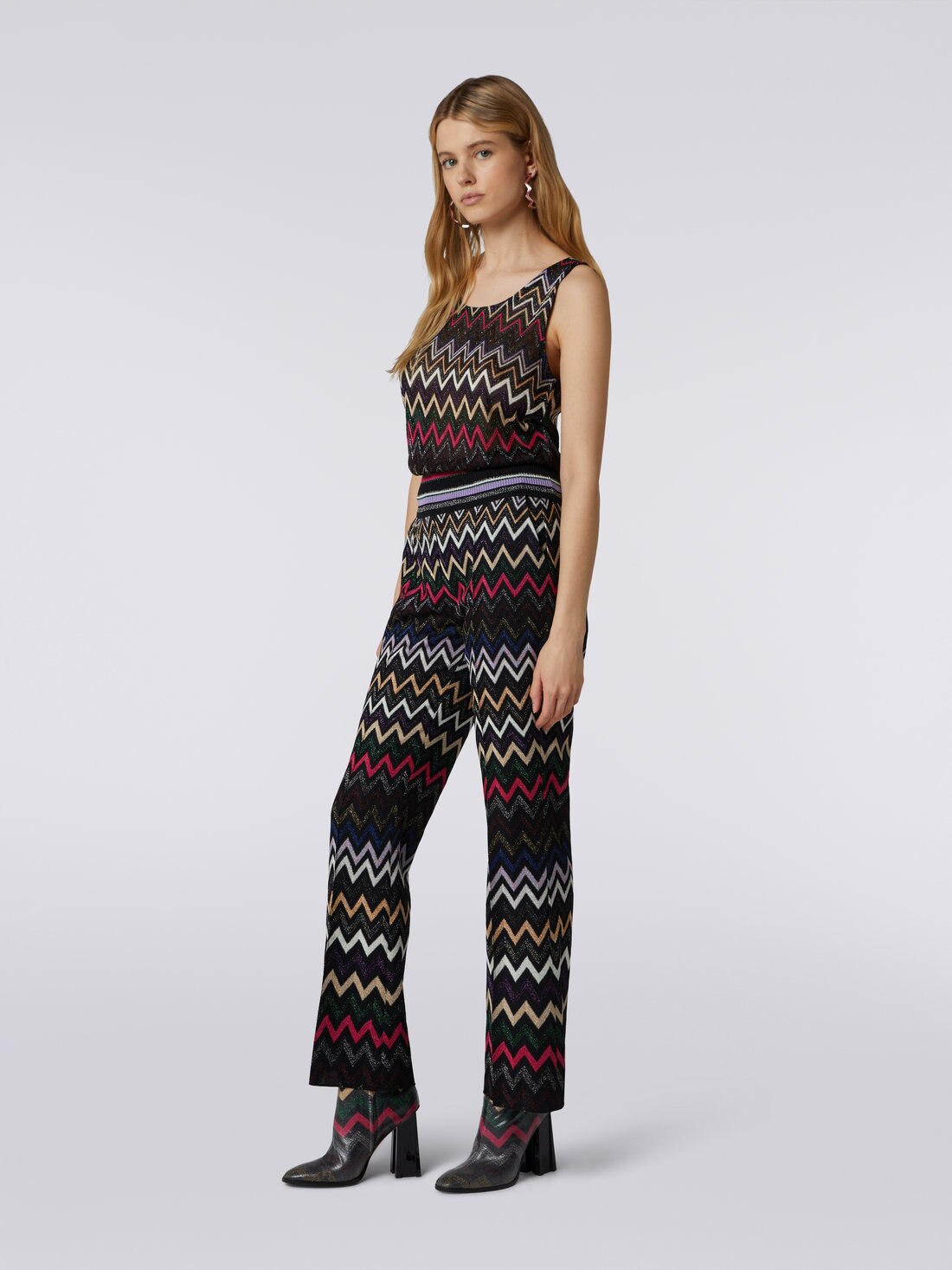 Scollatura rotonda per la canottiera da donna in maglia di viscosa. Il modello, interamente percorso da zig zag multicolore, presenta profilo in vita a contrasto che enfatizza i brillanti cromatismi, amatissima e riconoscibile cifra stilistica del brand.