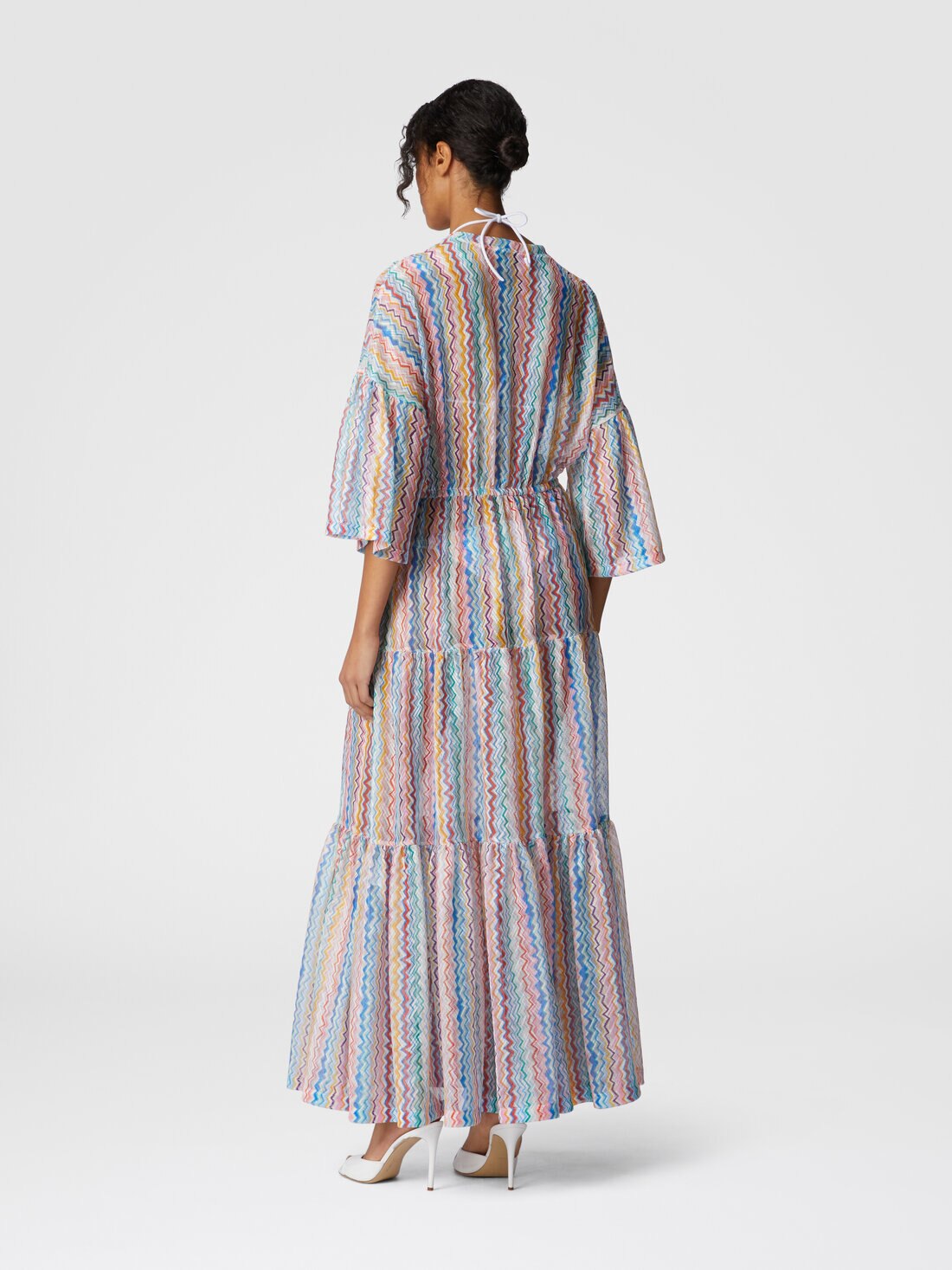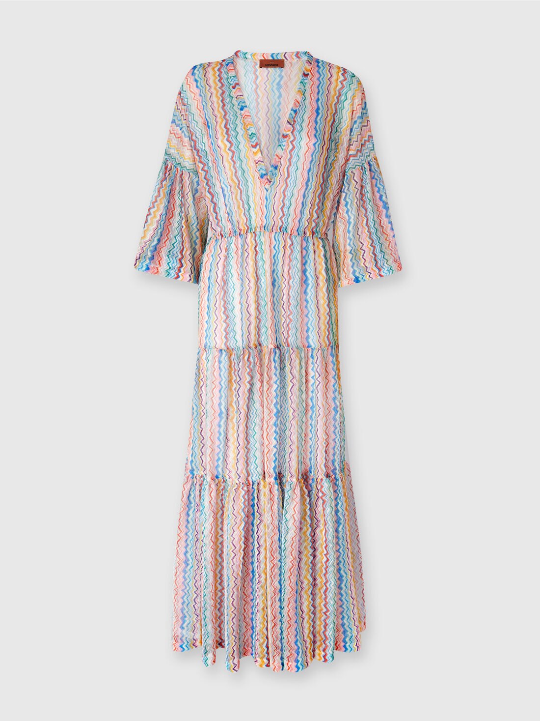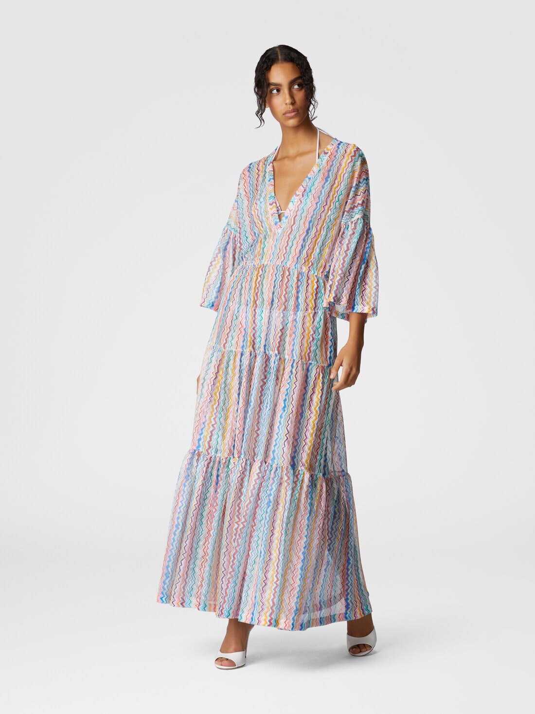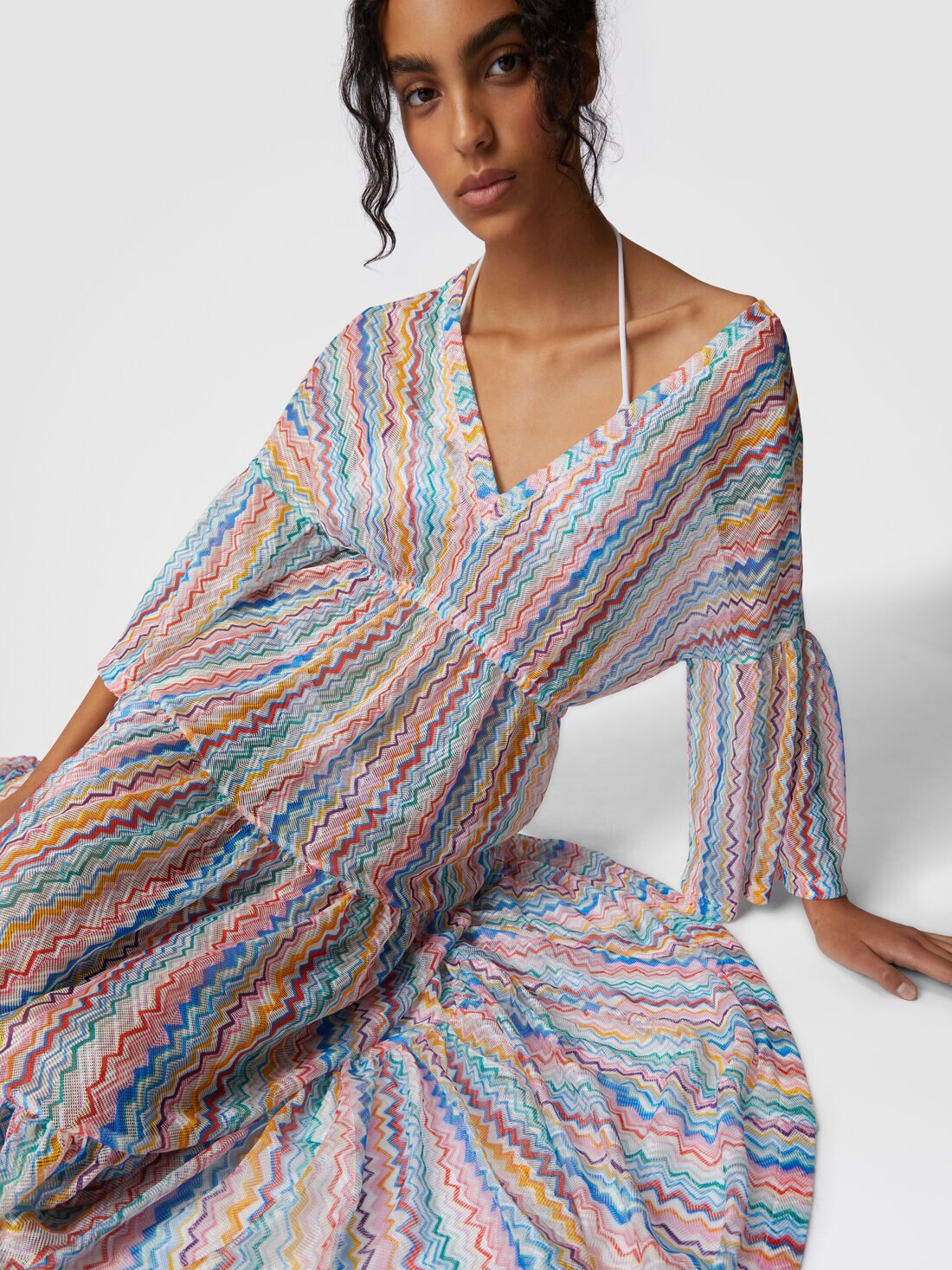 Un capo dal fascino classico, il copricostume lungo con scollo a V unisce la praticità del design cardigan alla raffinatezza dell’iconico motivo a zigzag. La lavorazione in raschel stampato e la silhouette fluida lo rendono perfetto per un look estivo elegante e disinvolto.
