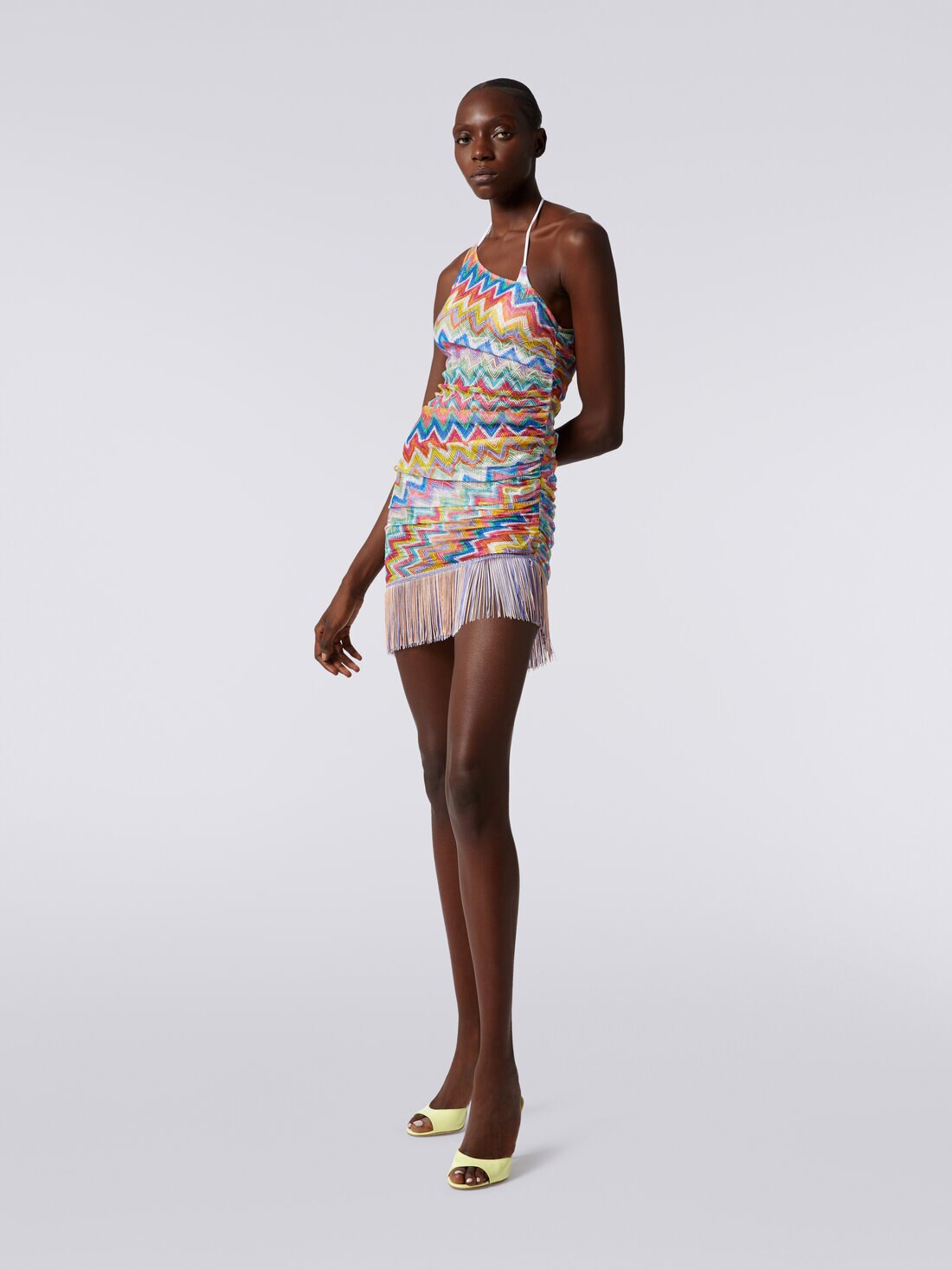 Il copricostume corto con frange cattura lo spirito estivo con una raffinata armonia di dettagli. La silhouette monospalla evoca un'aura di eleganza contemporanea, mentre le frange aggiungono un tocco giocoso e vivace. L'arricciatura laterale con coulisse conferisce un'allure di femminilità, creando un capo che unisce con maestria stile e praticità.
