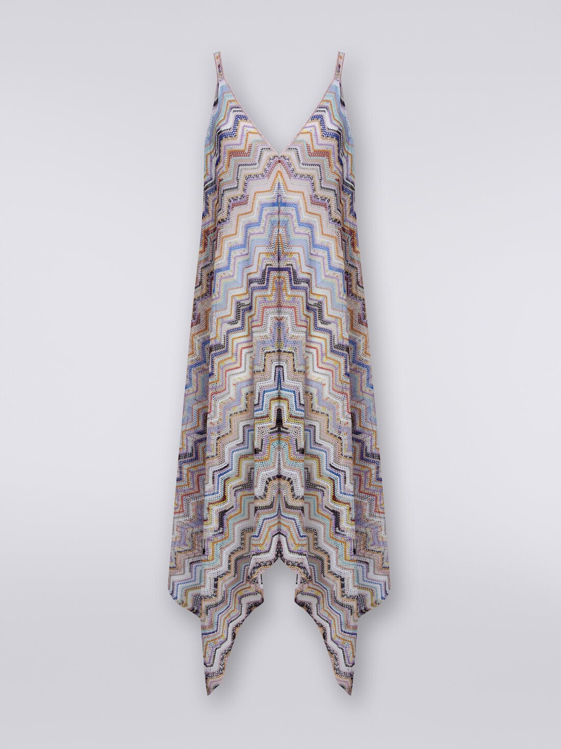 Volteggia nell'aria lasciando una scia brillante a ogni movimento il copricostume lungo da donna. Il modello a fazzoletto, sorretto da spalline sottili, è realizzato in maglia di viscosa con lavorazione crochet e motivo zig zag.