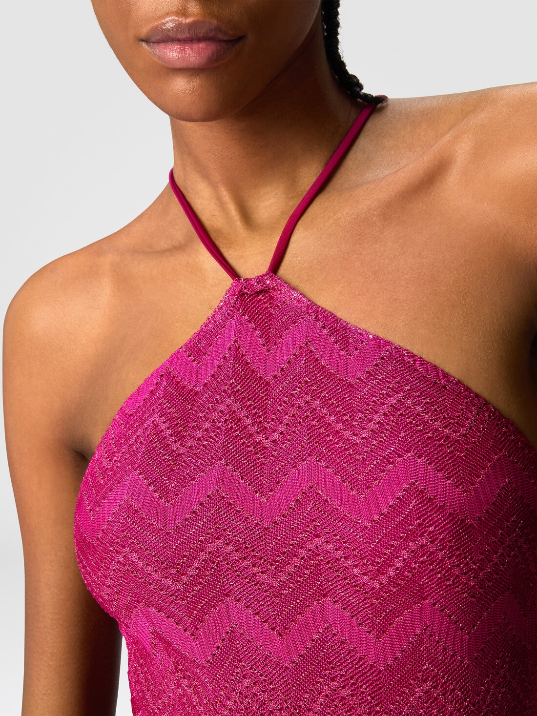 Increspato dall'iconico motivo zig zag e dai riflessi metallici del lamé, il costume intero in viscosa firmato Missoni presenta un elegante scollo all'americana, esaltando spalle e décolleté. Il fit aderente valorizza la silhouette, mentre l'allacciatura regolabile dietro il collo garantisce comfort e vestibilità perfetta. Un capo versatile, ideale per un look estivo che unisce stile e raffinatezza.