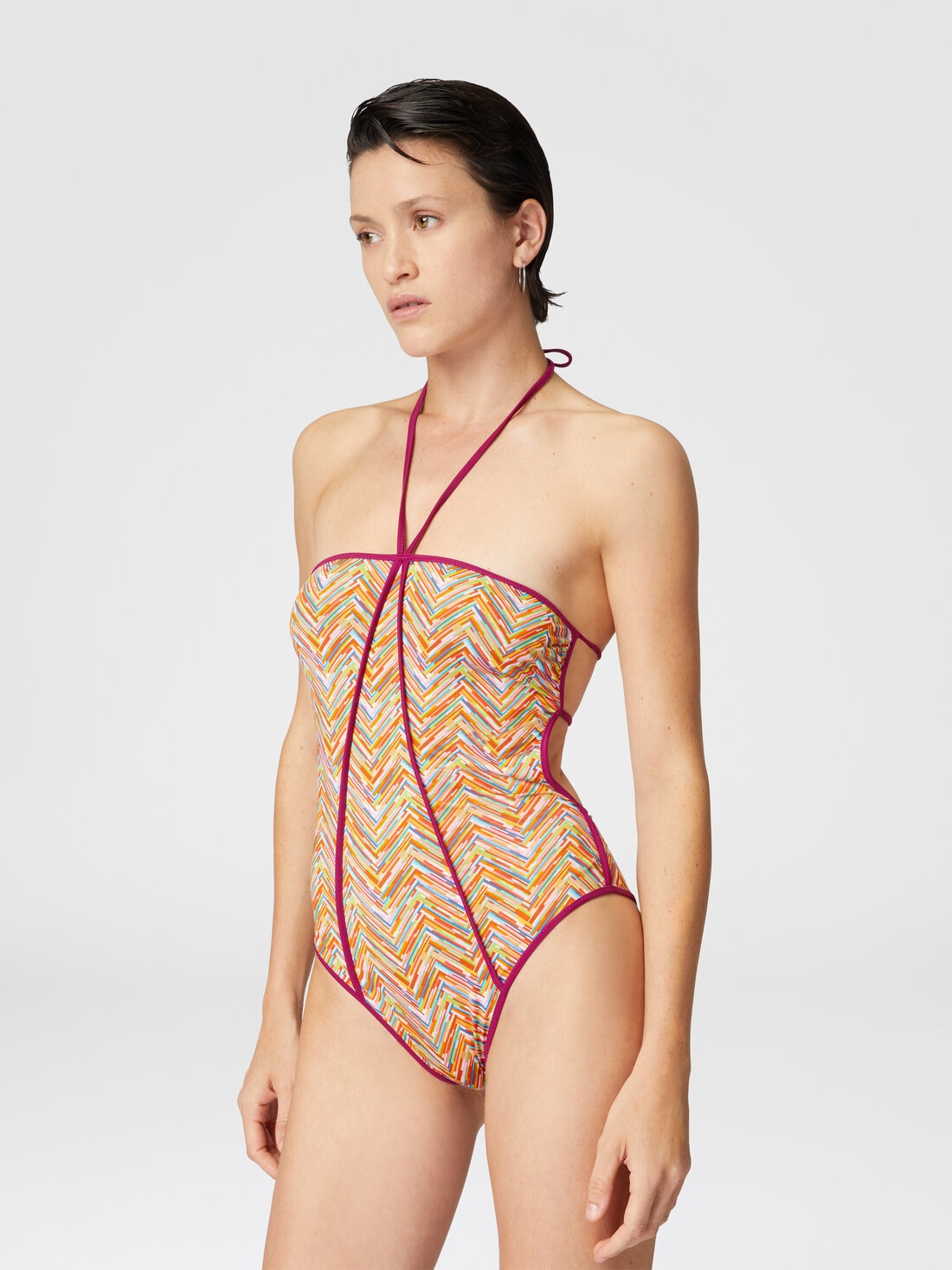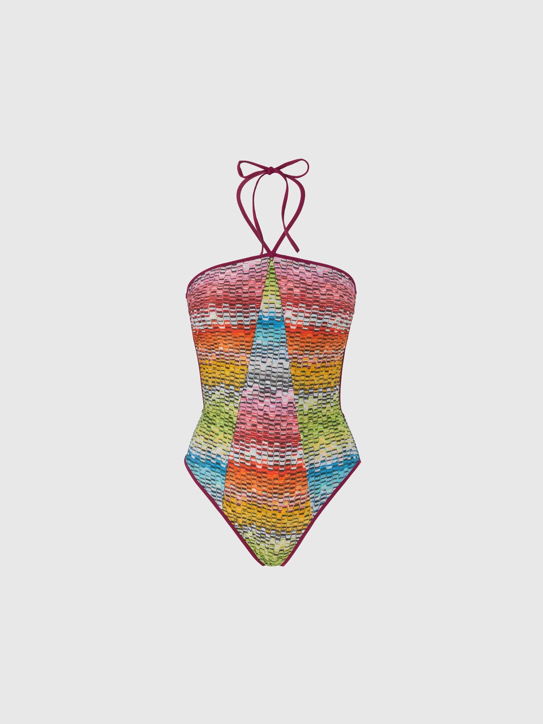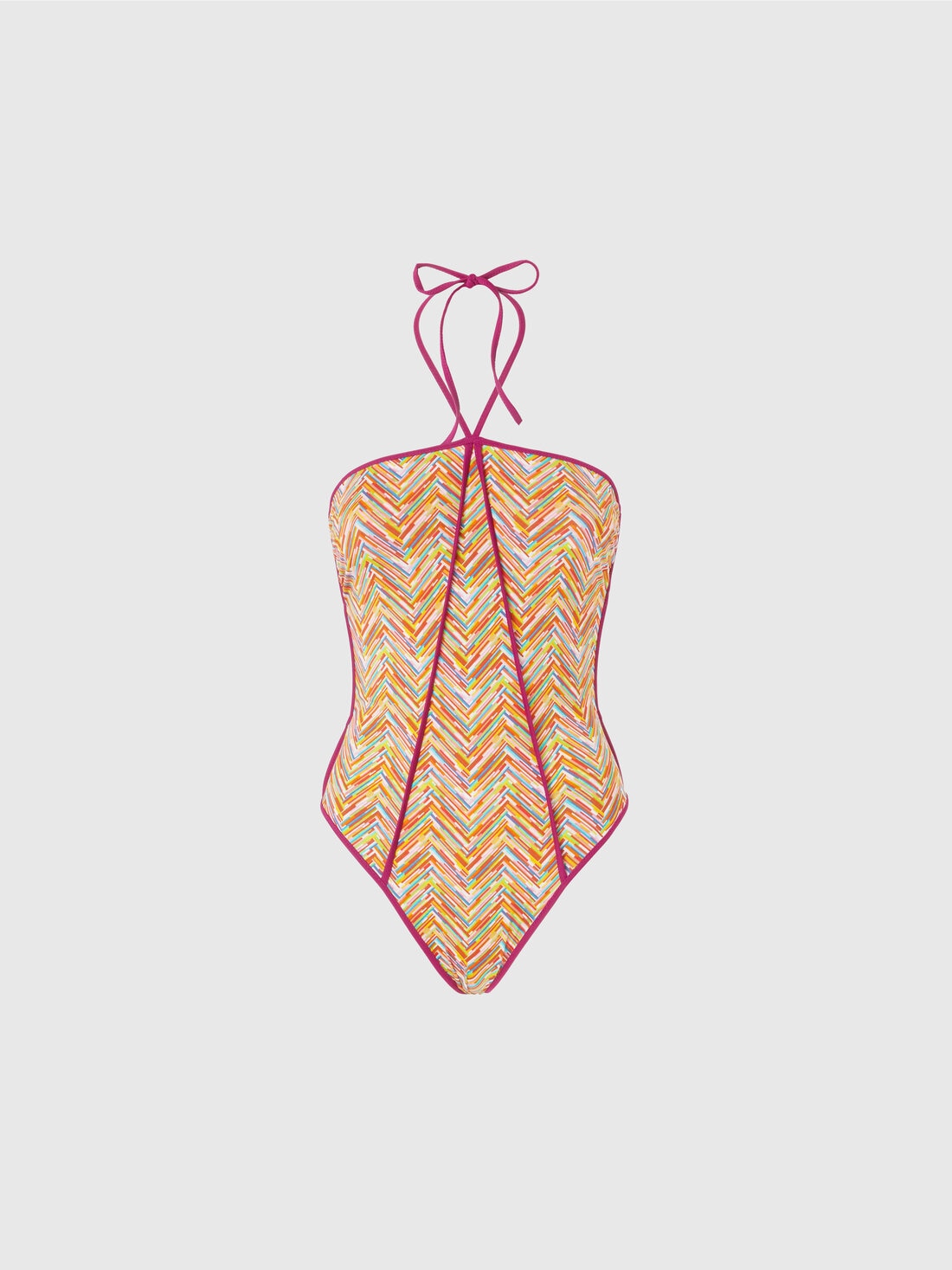 Costume da bagno intero reversibile con stampa, impreziosito dagli iconici motivi zig-zag della maison Missoni. I profili a contrasto definiscono con eleganza la silhouette, mentre il design reversibile offre una doppia opzione di stile, ideale per chi cerca versatilità e raffinatezza. Il laccio dietro al collo completa il look con un tocco sofisticato, garantendo una vestibilità personalizzata e confortevole.