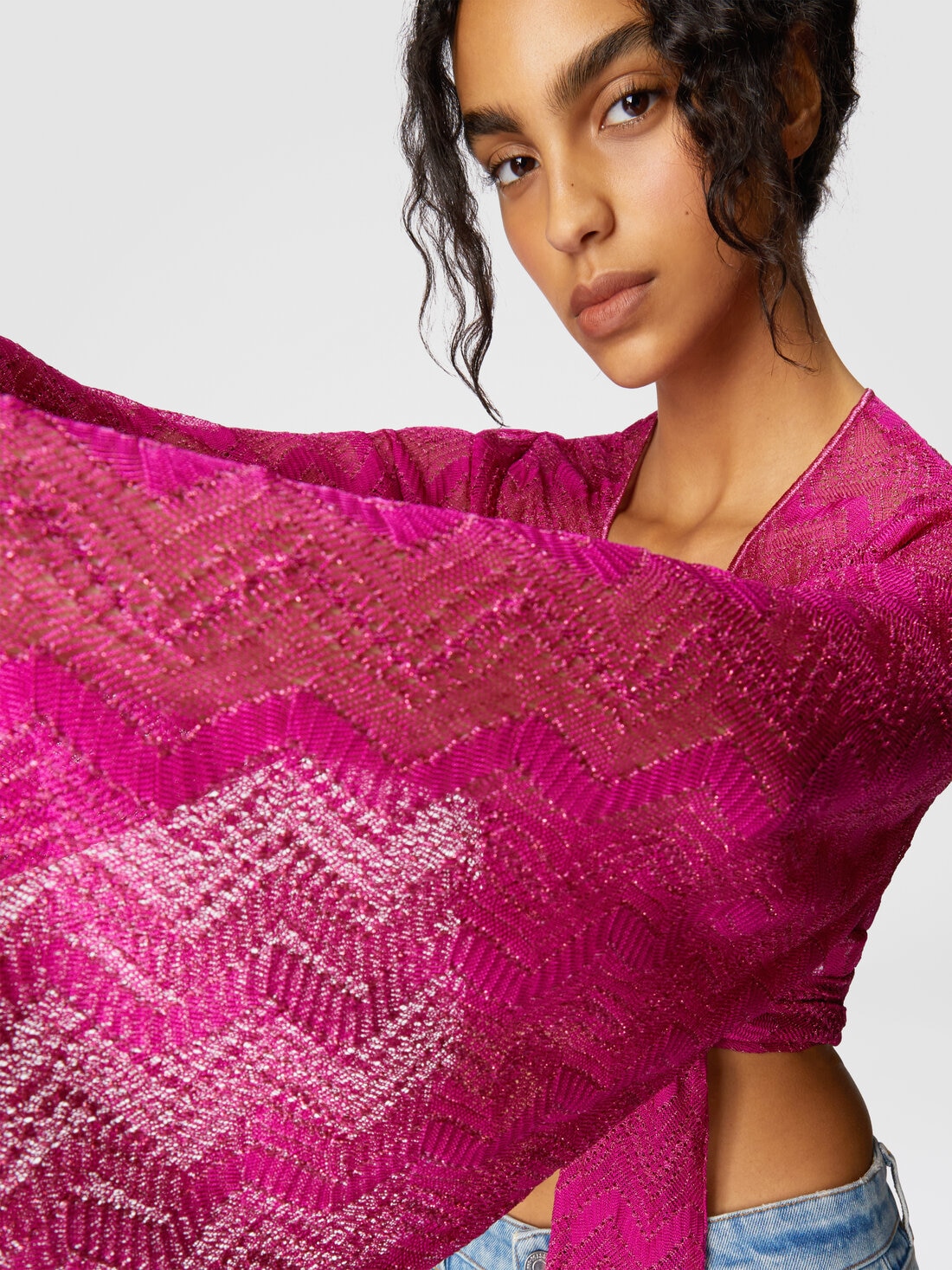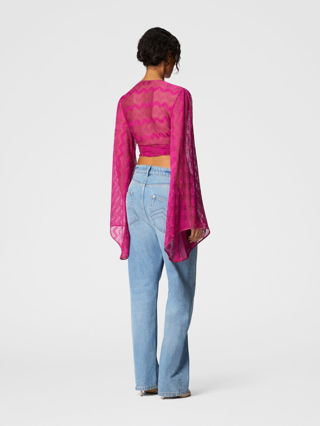 Gioca con volumi audaci e dettagli sensuali il crop top da donna in viscosa e iconico motivo zig-zag della maison. Le ampie maniche aggiungono un tocco di teatralità, mentre il nodo frontale esalta il punto vita, creando un contrasto di proporzioni. Il tessuto leggero, arricchito dai bagliori metallici del lamé, dona al capo un’eleganza luminosa e raffinata.