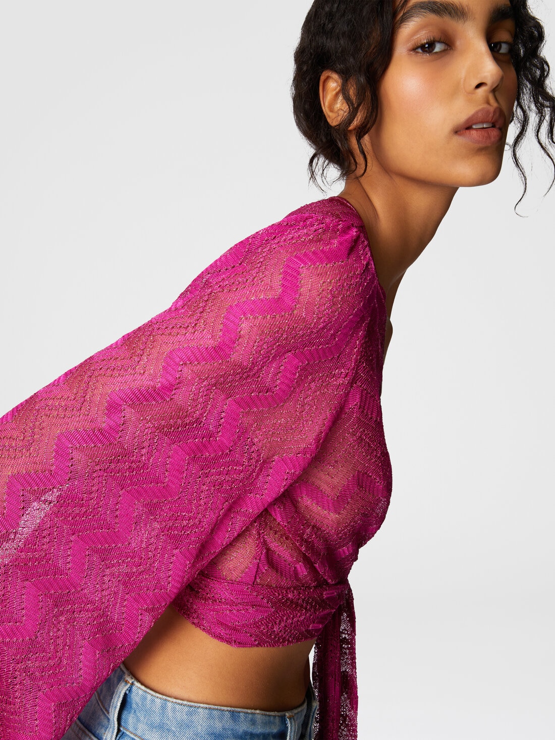 Crop top con maniche ampie e nodo frontale in viscosa zig zag lamé