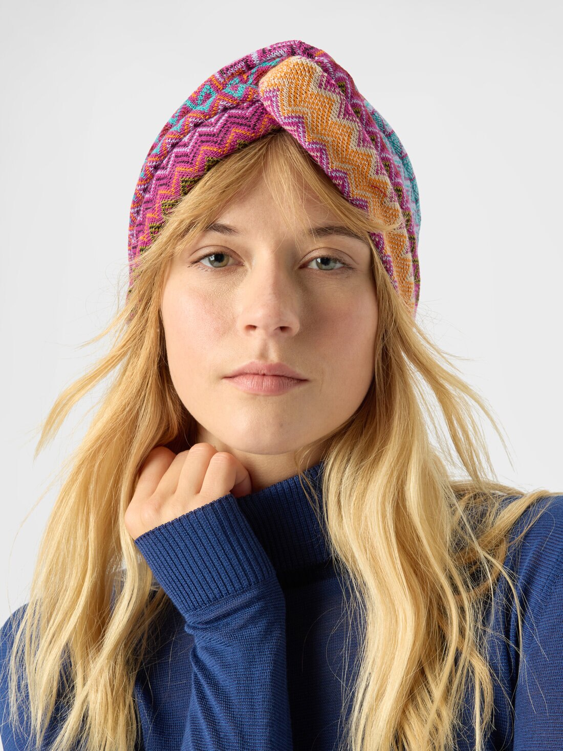 Duplice risultato, stare al caldo e aggiungere un tocco di brio al look, con la fascia per capelli da donna firmata Missoni. Inconfondibile nel suo iconico zig zag che arricchisce la morbida maglia in misto lana.