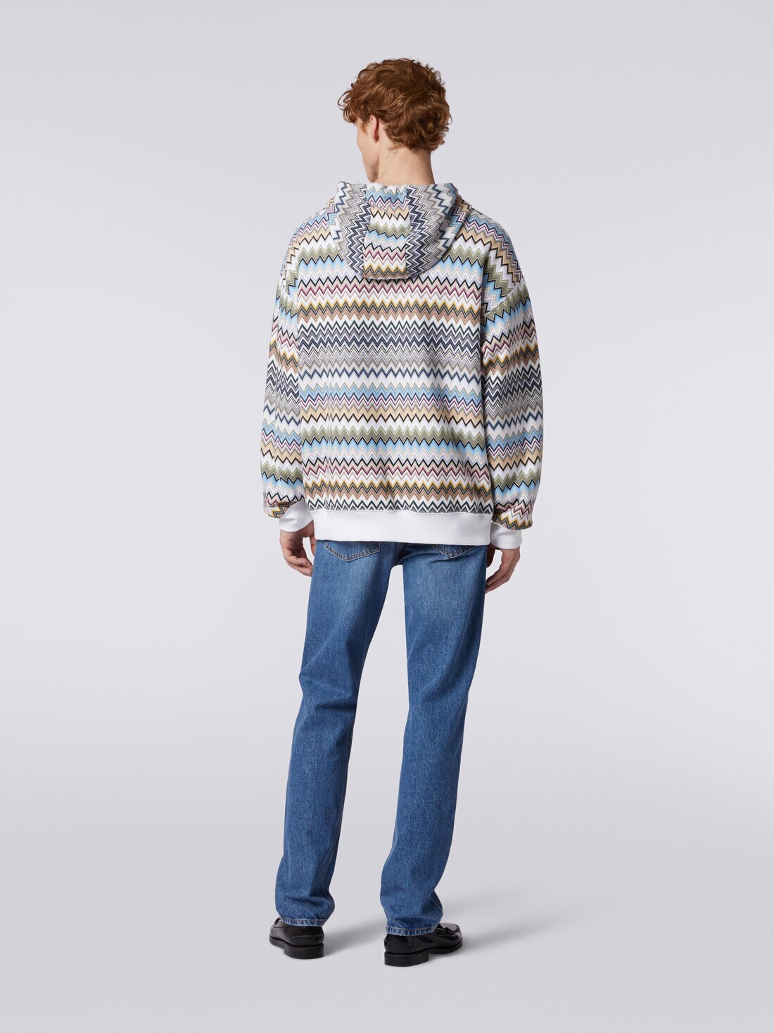 Da sempre icona senza tempo del look casual, la felpa con cappuccio da uomo subisce una straordinaria trasformazione sotto la magia di Missoni. Il risultato? Un capo che abbraccia audacemente lo stile pop. Merito della lavorazione raschel zig zag che caratterizza il french terry di cotone con cui è realizzata.