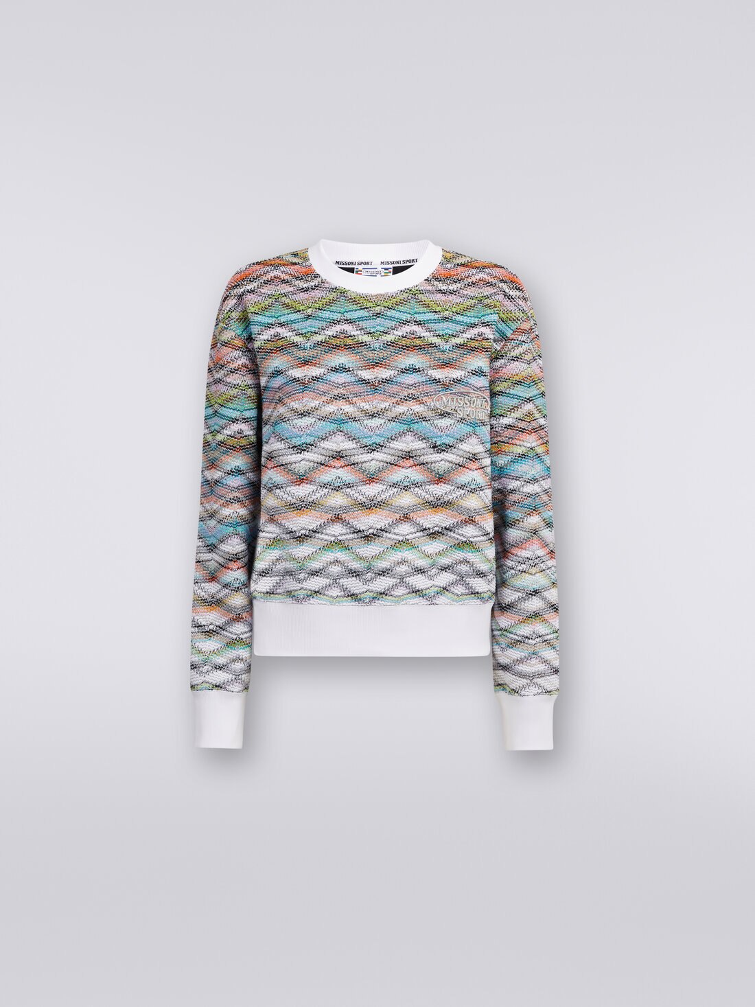 La felpa girocollo da donna, caposaldo del casualwear, viene proposta da Missoni in una versione assolutamente inconfondibile. Il capo è infatti realizzato in maglia con motivo caperdoni, e rifinito da profili tinta unita. Il logo ricamato completa il modello.