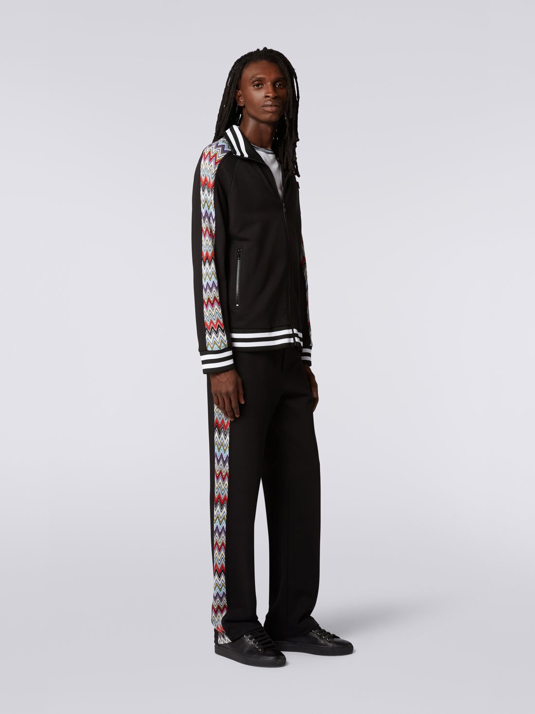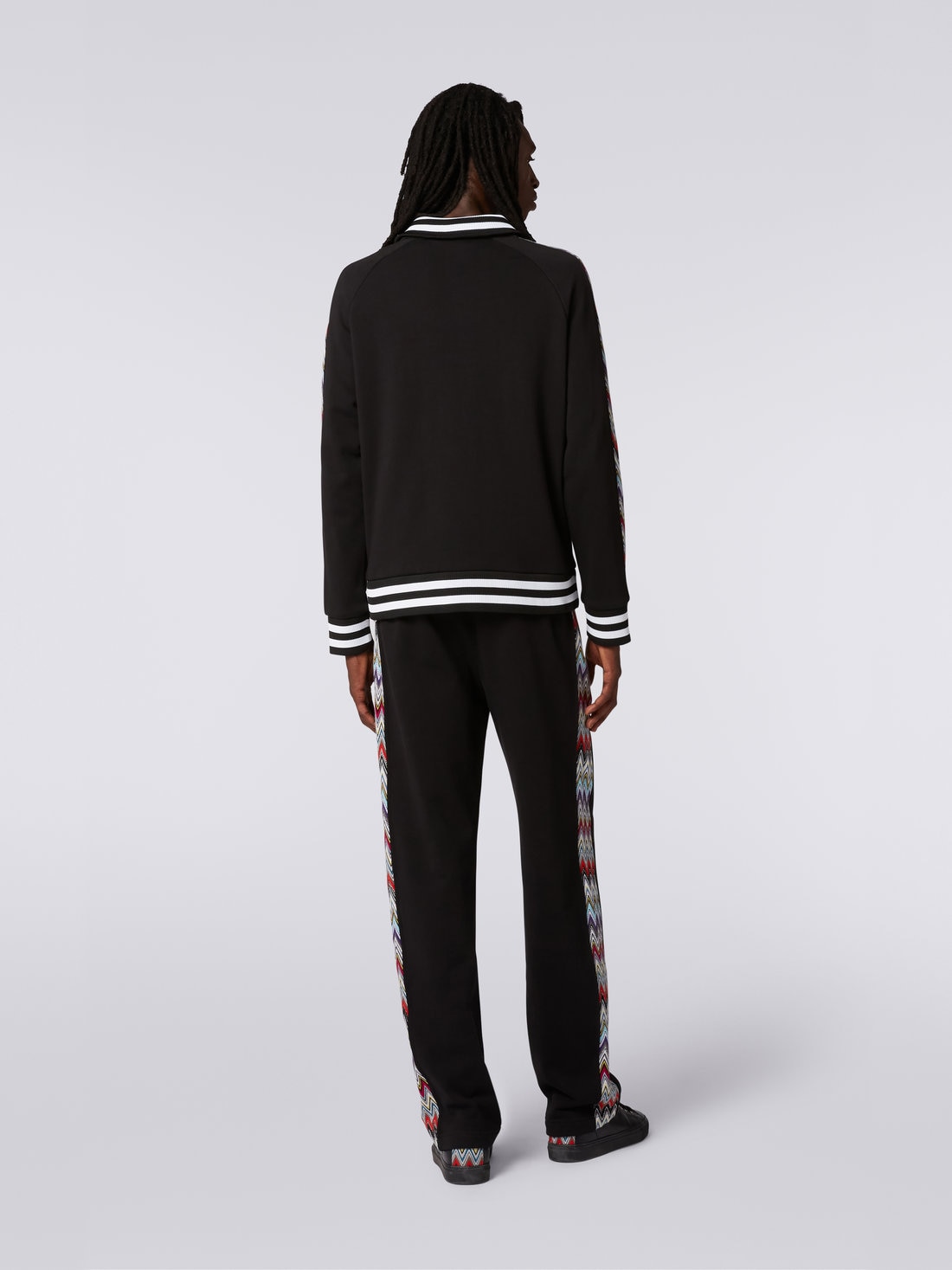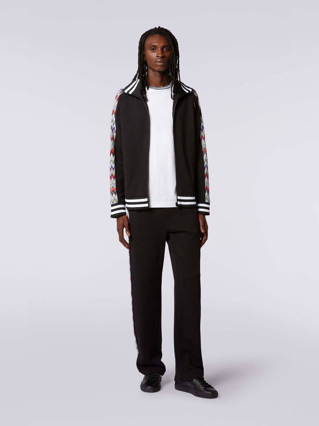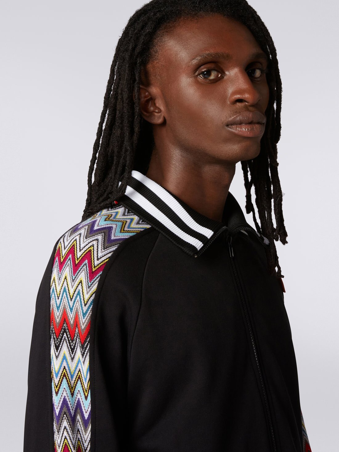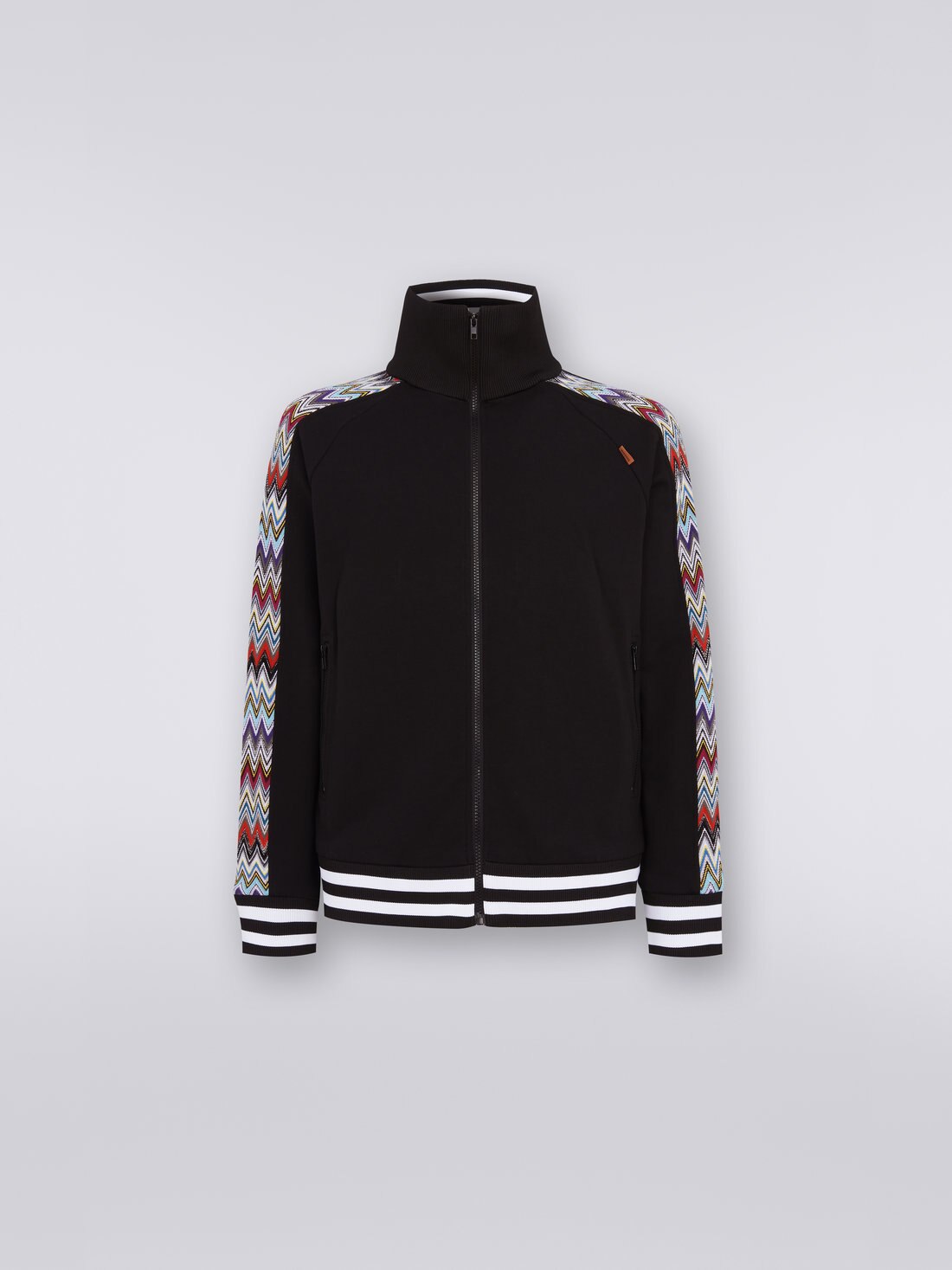 Gli inserti in maglia raschel con motivo a chevron multicolore che percorrono le maniche sono il punto di forza della felpa da uomo in puro cotone con collo alto. Il modello con zi frontale presenta tasche laterali con cerniera, interno del colletto e bordo inferiore a costine bicolore e maniche taglio raglan. A personalizzare il look, l'etichetta logo a contrasto.