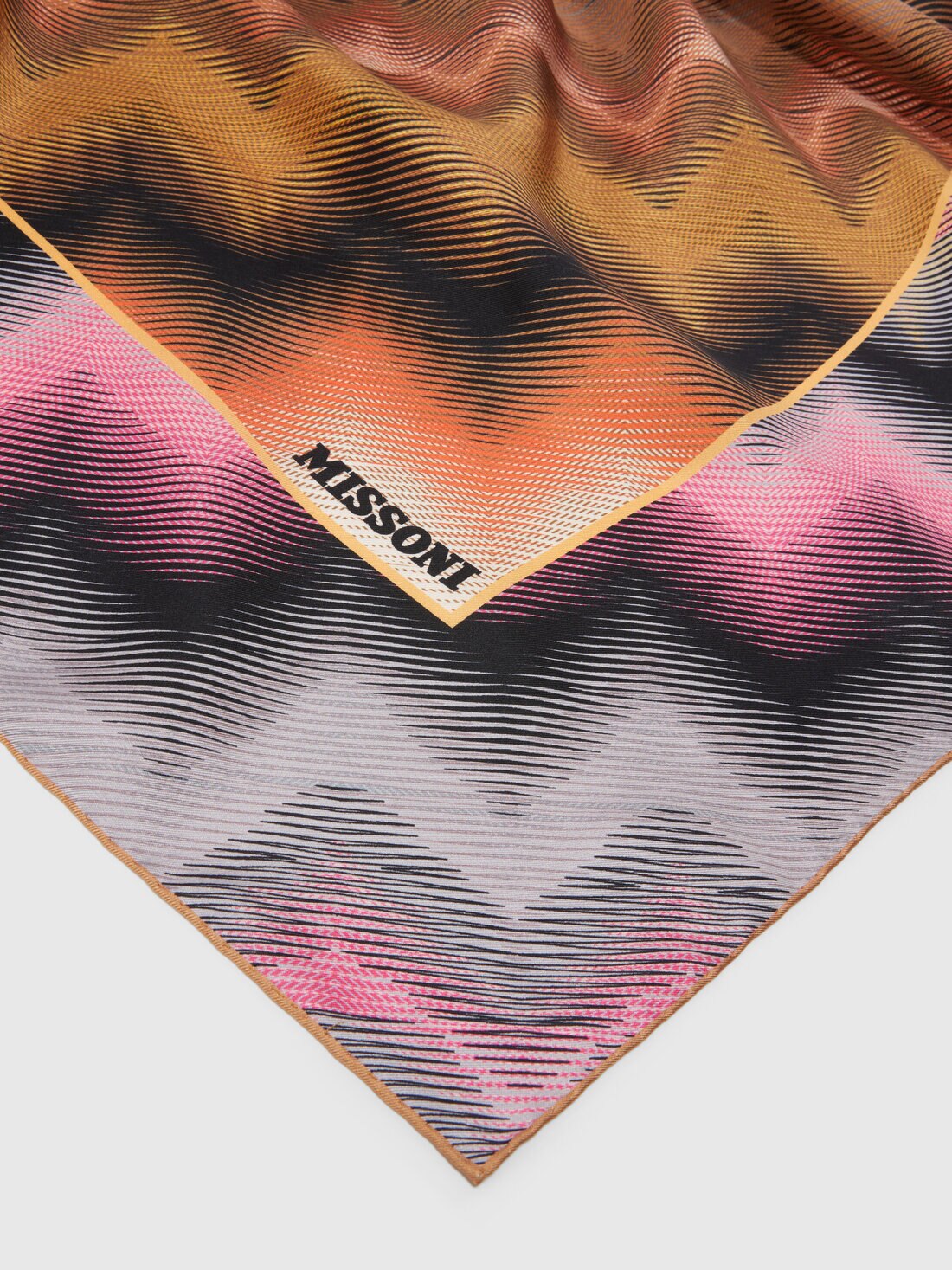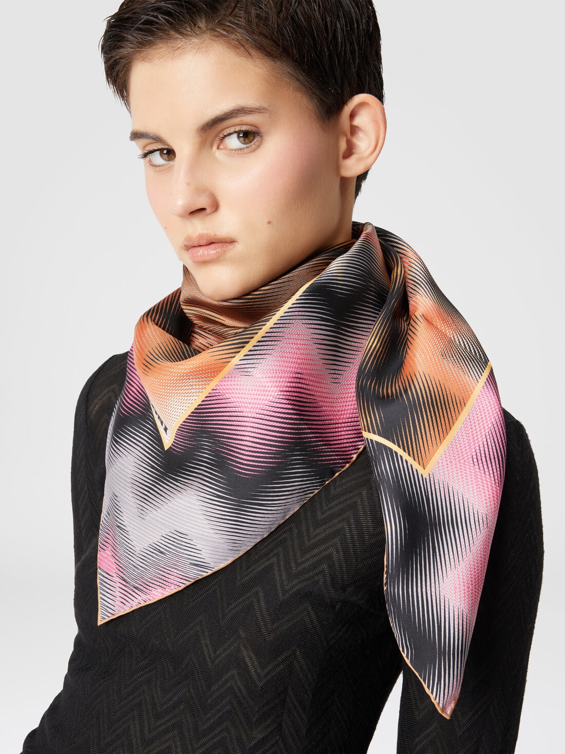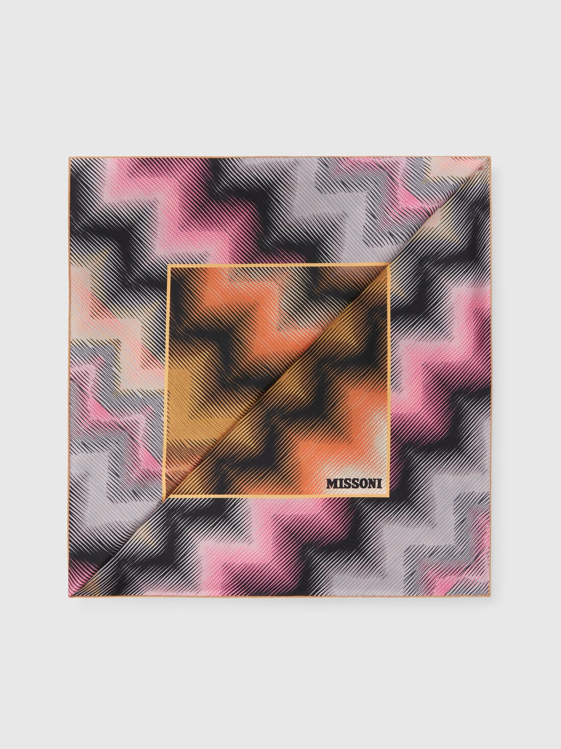 Una stampa zig zag a effetto fiammato caratterizza il foulard quadrato in seta. Personalizzato dalla scritta logo, l'accessorio presenta piping a contrasto.