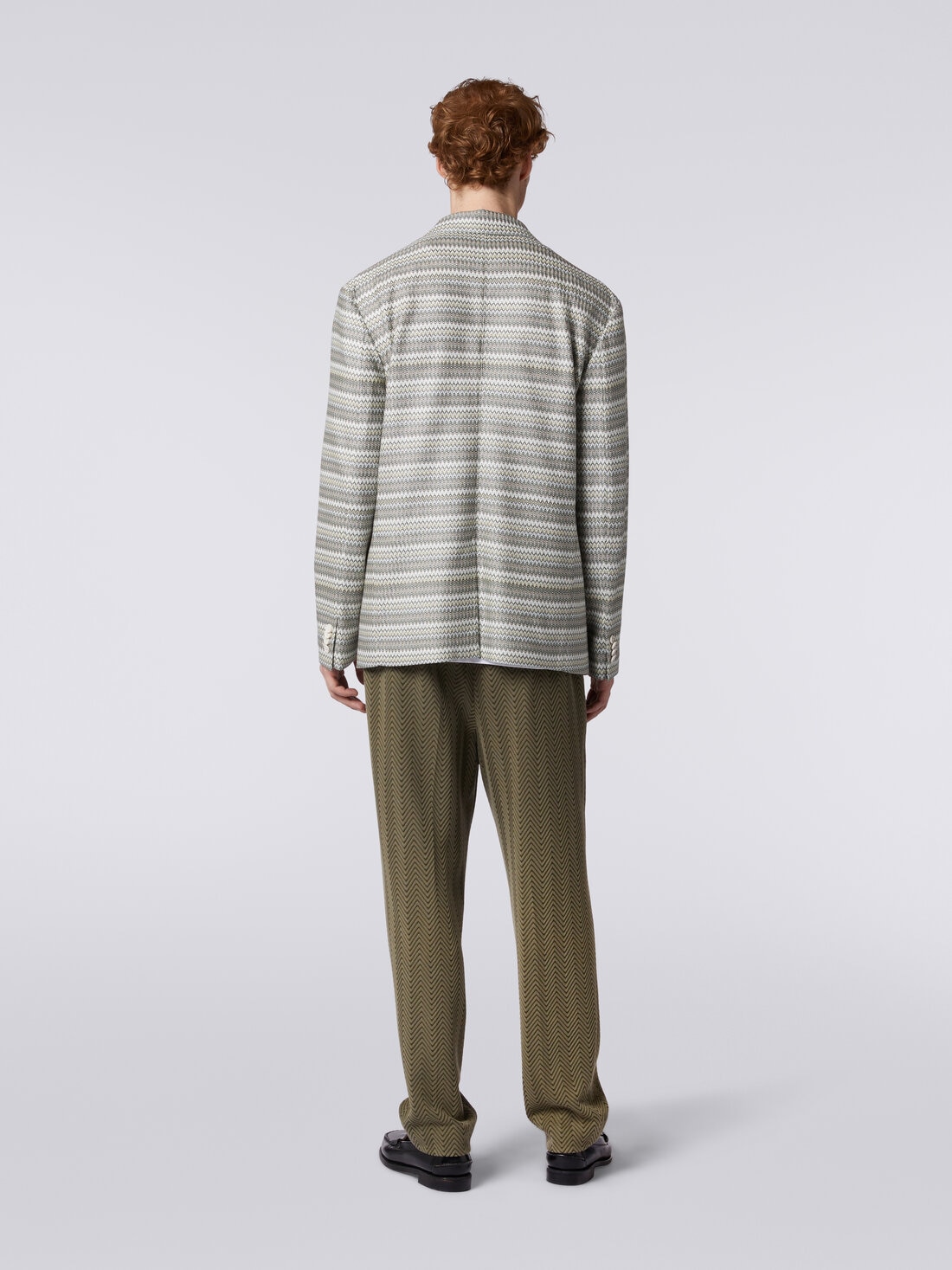 Il blazer da uomo, capo che rappresenta a tutto tondo il formal wear diventa, con il tocco di Missoni, un capo che unisce coolness e lussuosità. Il blazer è infatti realizzato in un blend di cotone e viscosa a cui il motivo chevron con micro zig zag dona caratteristiche di assoluta originalità.
