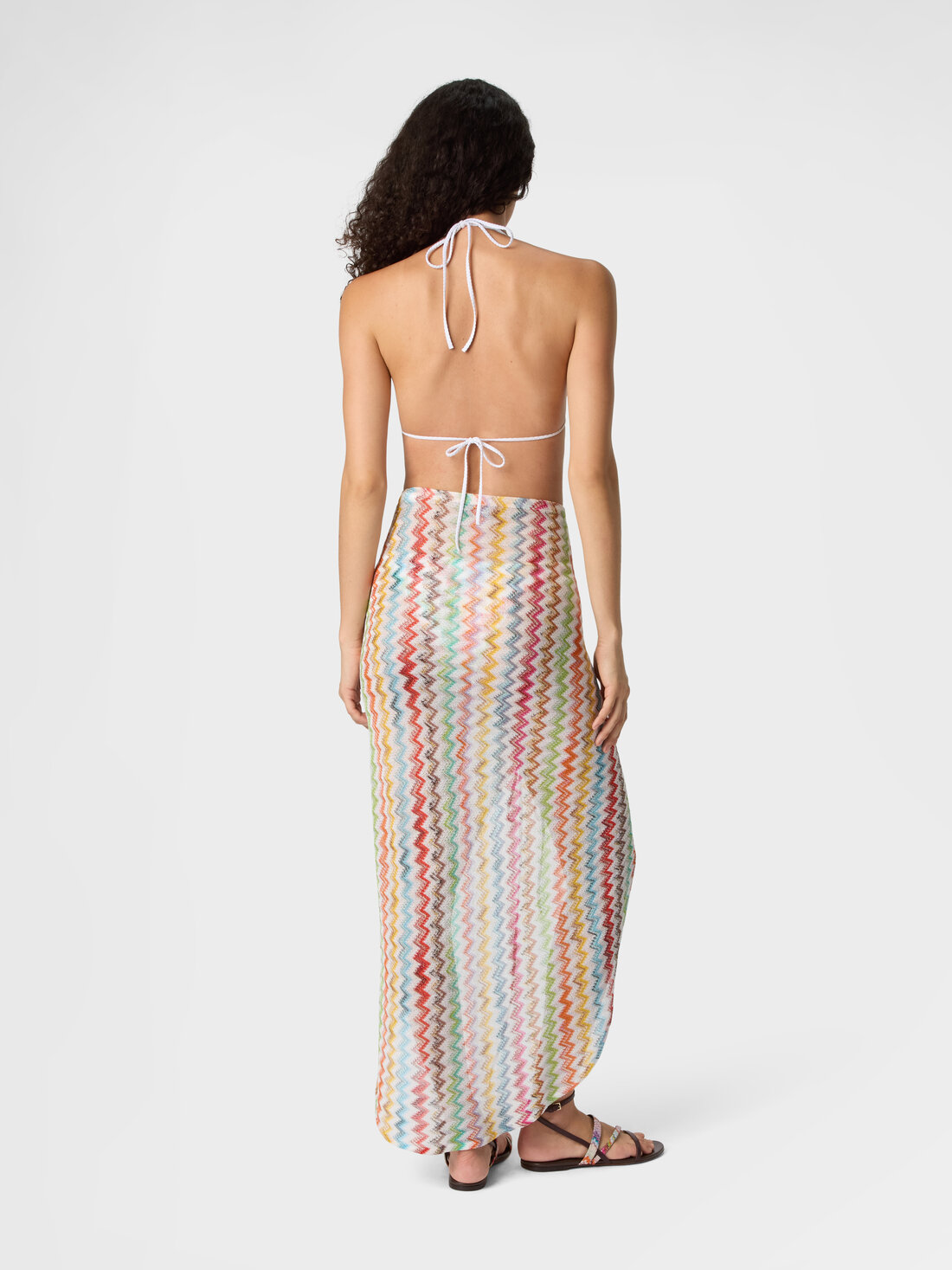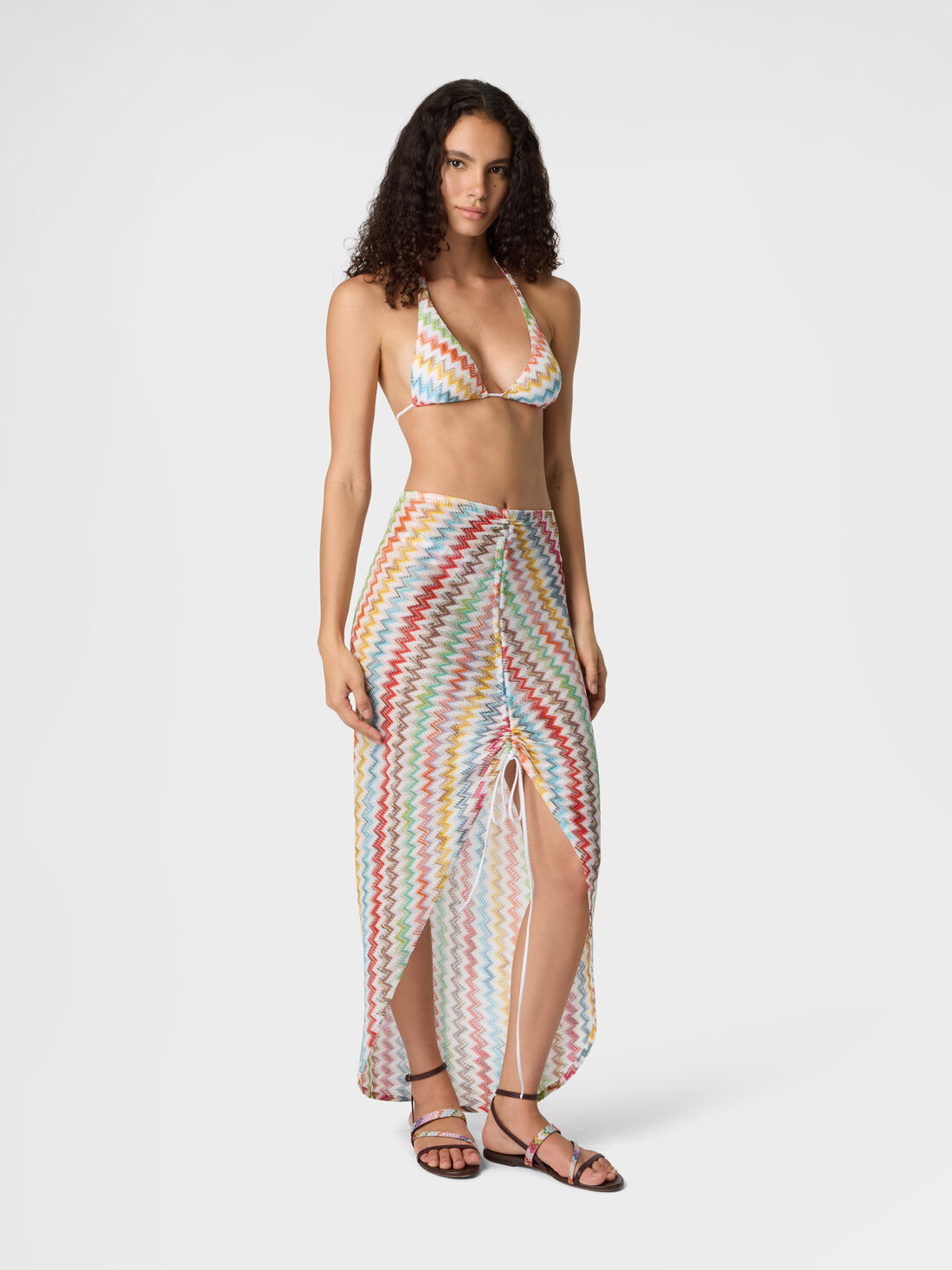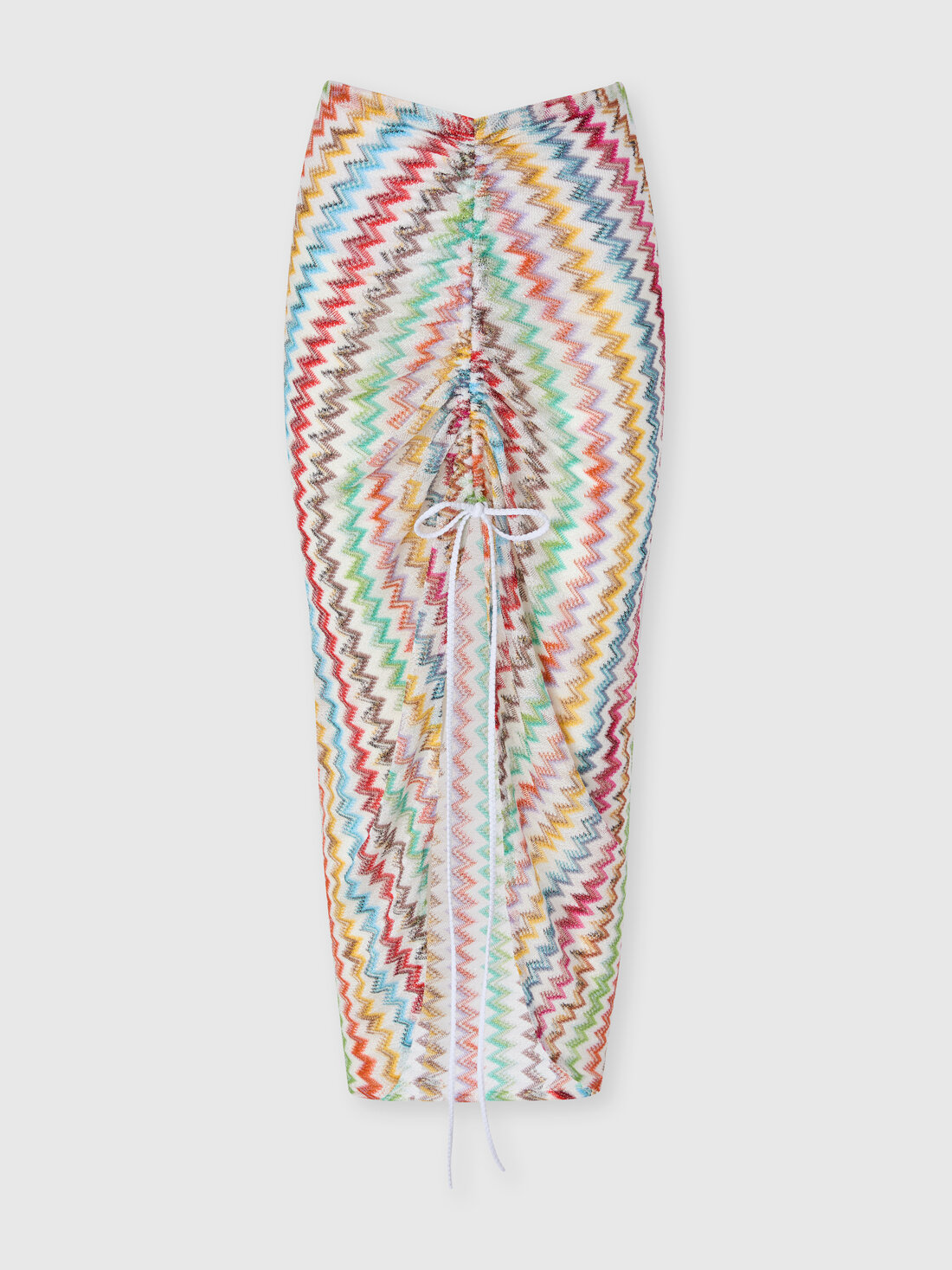 Tra riflessi e trasparenze, questa gonna da donna lunga arricciata in viscosa lamé con lavorazione raschel e motivo micro zig zag avvolge la silhouette con eleganza fluida.