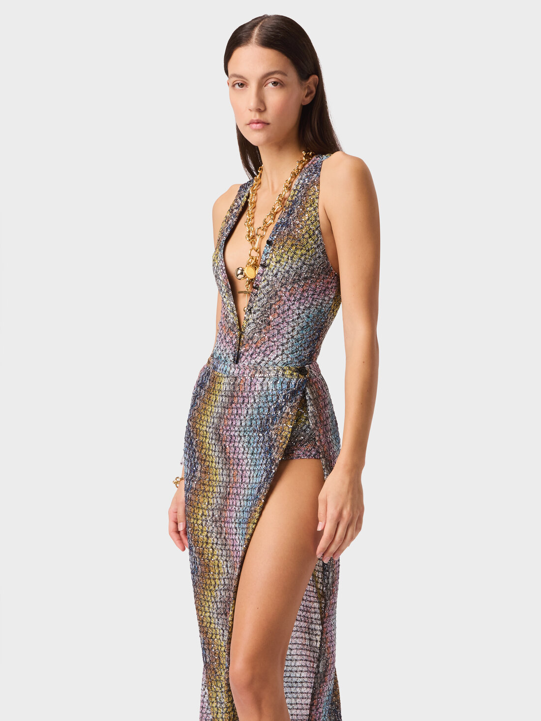 Questa gonna pareo lunga da donna esprime la maestria artigianale della maison attraverso la lavorazione a telaio Caperdoni, che valorizza il motivo zig zag in misto viscosa lamé. L’applicazione di paillettes illumina la superficie, definendo un capo fluido e distintivo, pensato per accompagnare il movimento con eleganza.