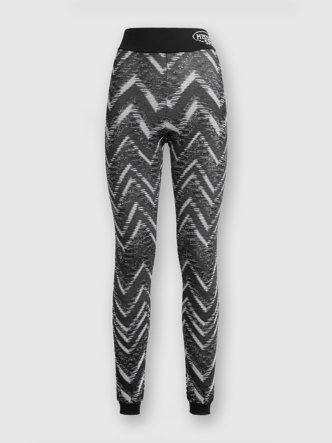 Un'accattivante nervatura in lurex percorre i leggings da donna in maglia tecnica stretch. Impreziosito dal motivo zig zag, il modello è completato dalla fascia in vita personalizzata a contrasto.