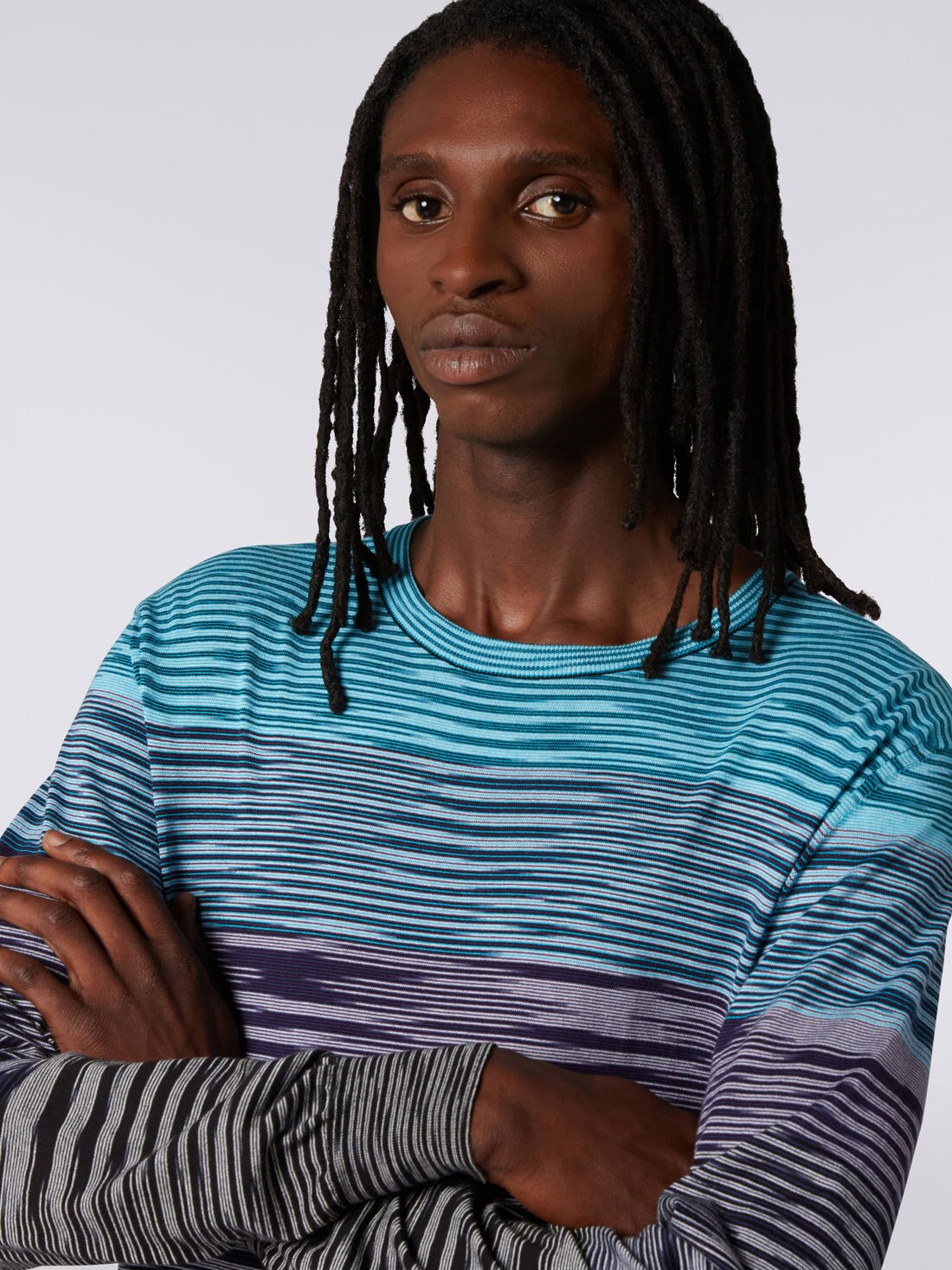 Il motivo fiammato, che tanto ha contribuito alla riconoscibilità di Missoni, è il protagonista assoluto del pullover girocollo da uomo. Realizzato in maglia di misto cotone, il modello sfrutta il potere del colore per animarsi di righe dégradé che lo percorrono orizzontalmente.