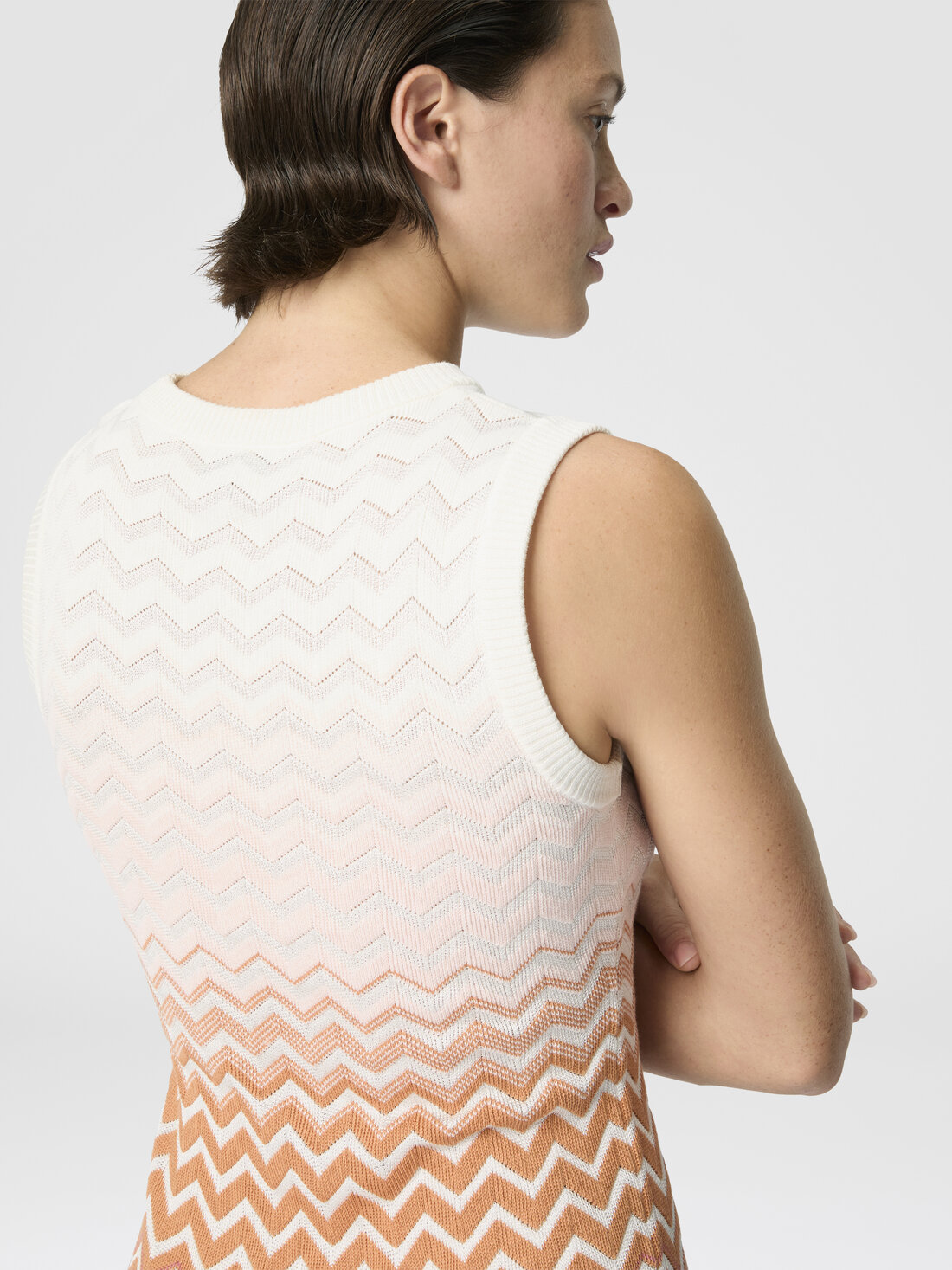 Questo mini-abito da donna senza maniche in cotone e viscosa si distingue per il motivo chevron dégradé e il girocollo pulito. Un modello luminoso e versatile che racchiude l’eleganza inconfondibile di Missoni.