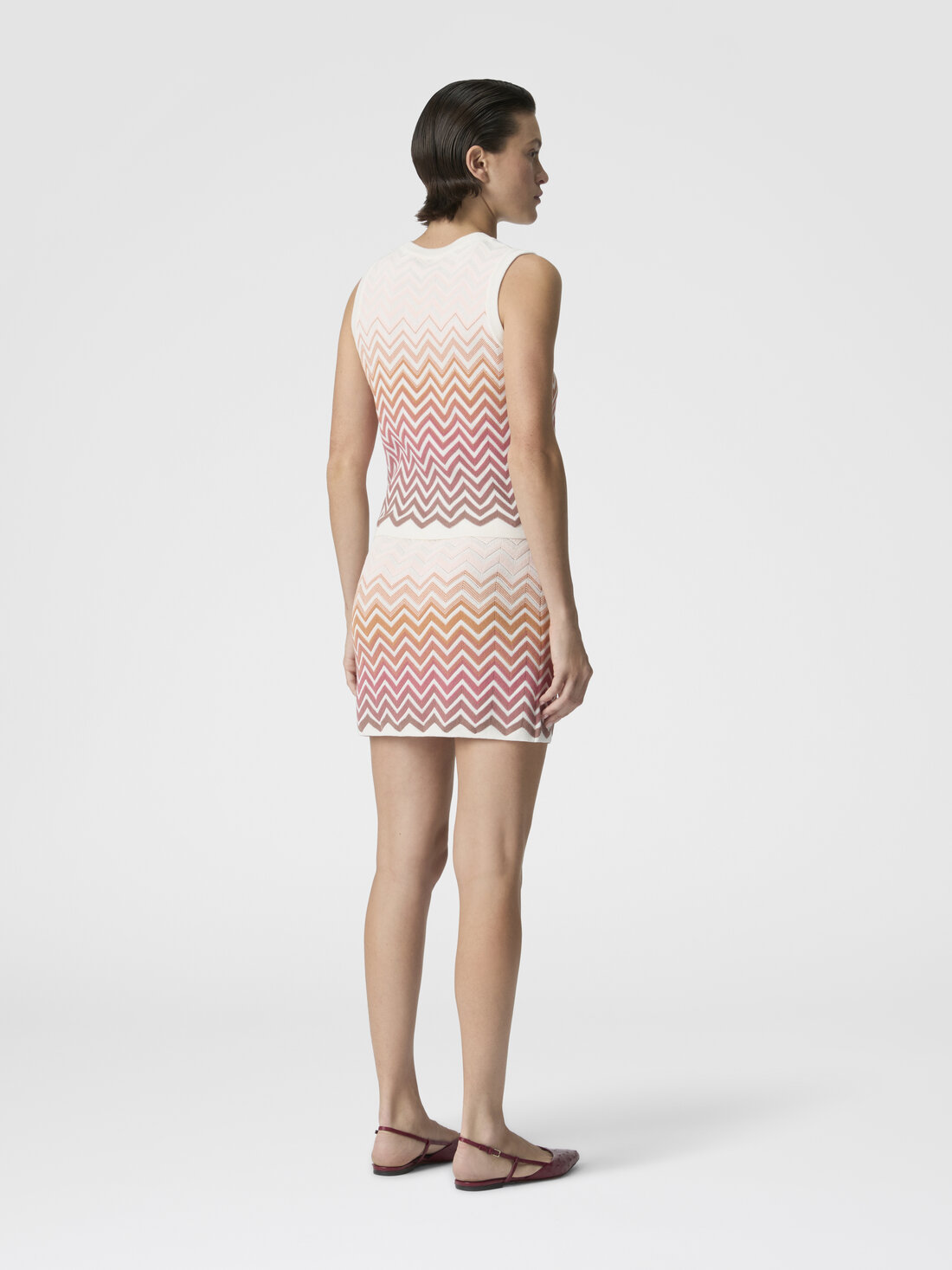 Lo chevron caratteristico della maison anima questa minigonna da donna in cotone e viscosa dégradé, creando un gioco di sfumature e profondità.