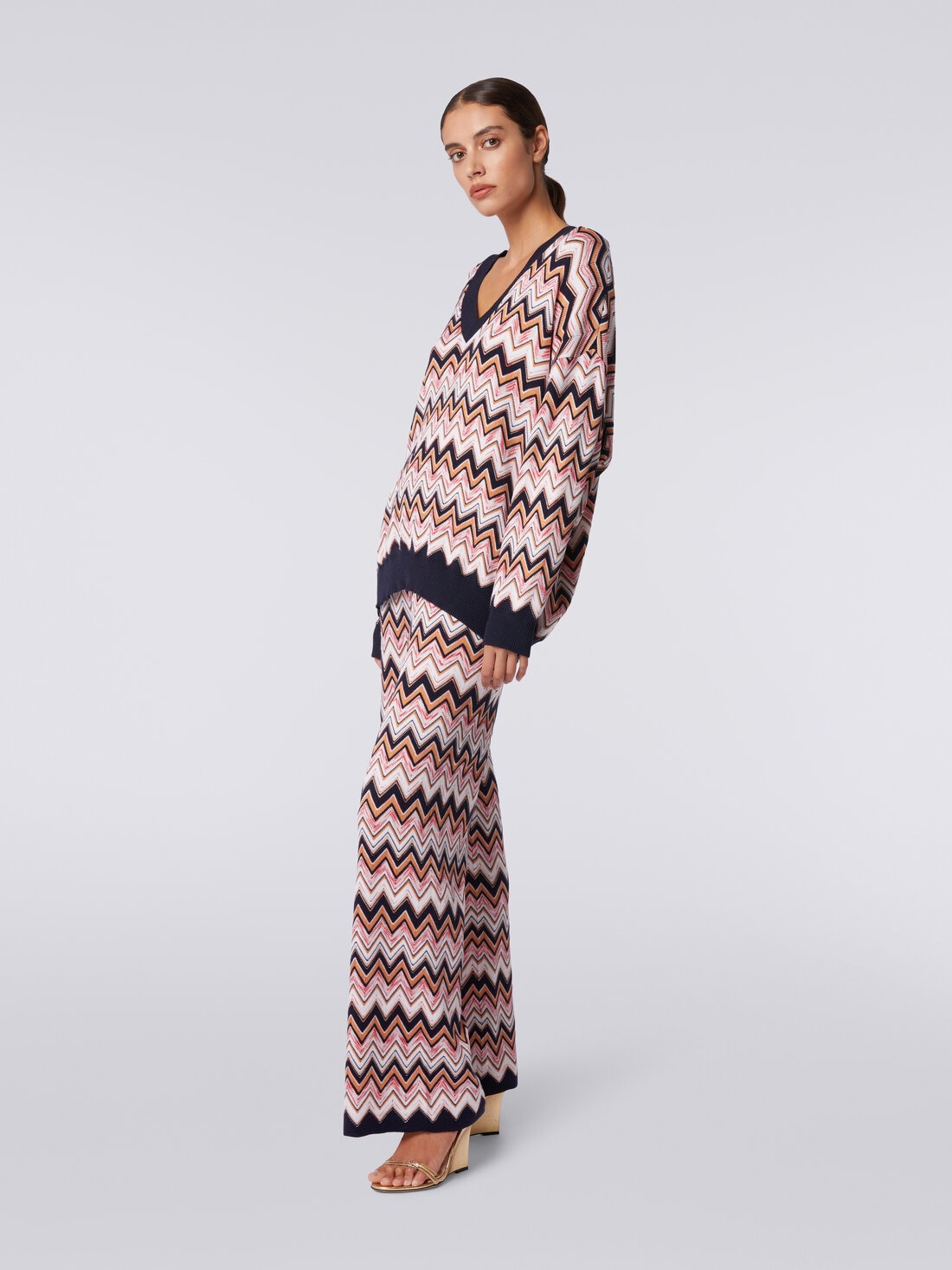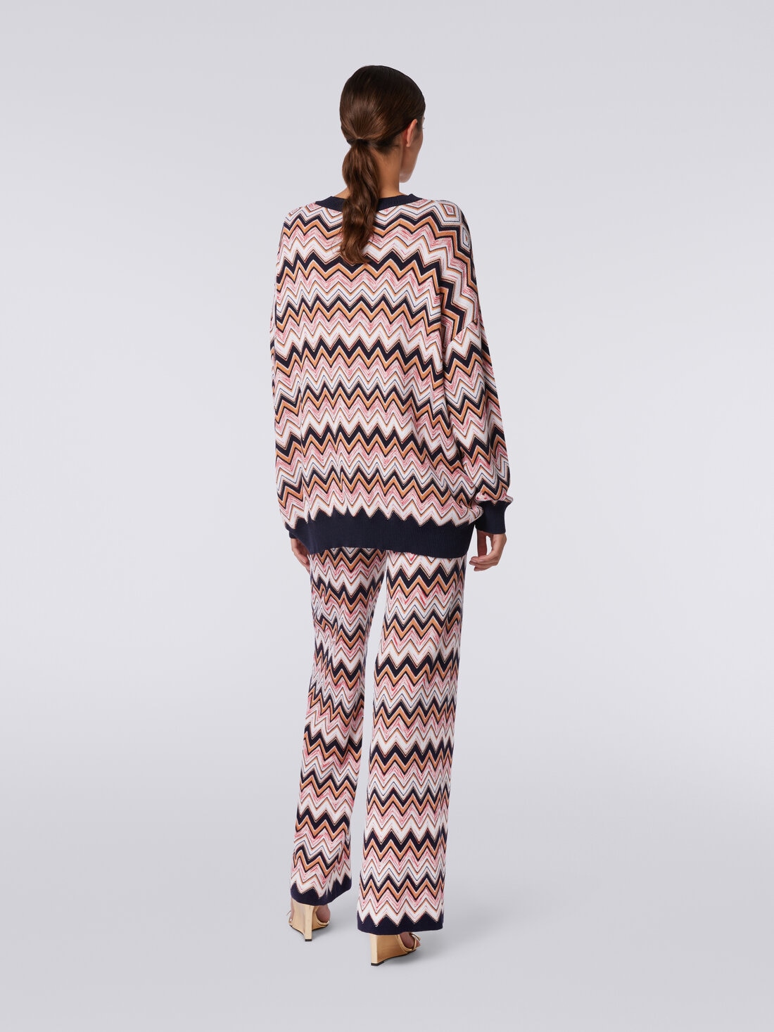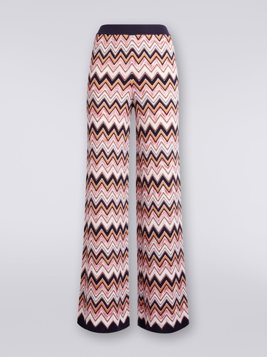 Quello firmato da Missoni è un paio di pantaloni a palazzo da donna realizzati in pregiata maglia di viscosa e lana. Perfetti per realizzare il tuo outfit, il modello unisce la lavorazione a costa inglese con l'iconico motivo zig zag della Maison.