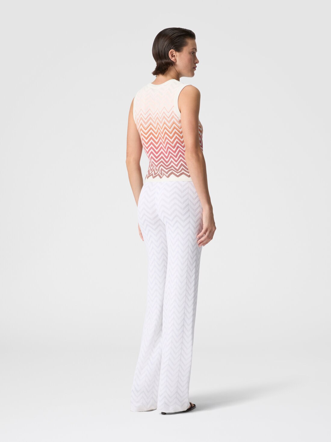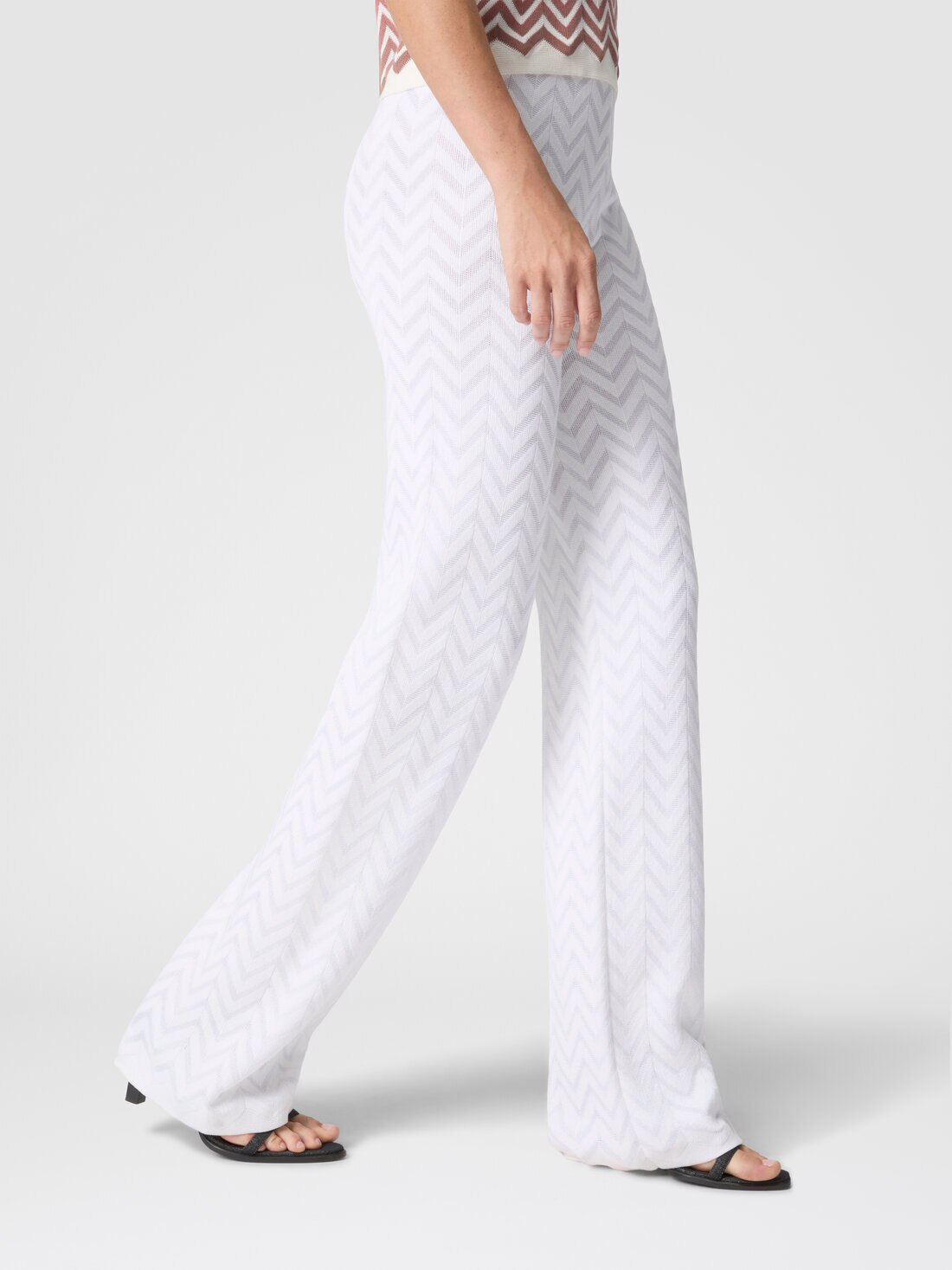 Questi pantaloni stretch da donna a taglio dritto in misto cotone e viscosa celebrano l’heritage Missoni attraverso il raffinato motivo chevron in tinta unita. La punto vita elasticizzato dona comfort e praticità, mentre la gamba ampia regala fluidità e movimento. Un capo che unisce funzionalità quotidiana e l’eleganza intramontabile della maison.