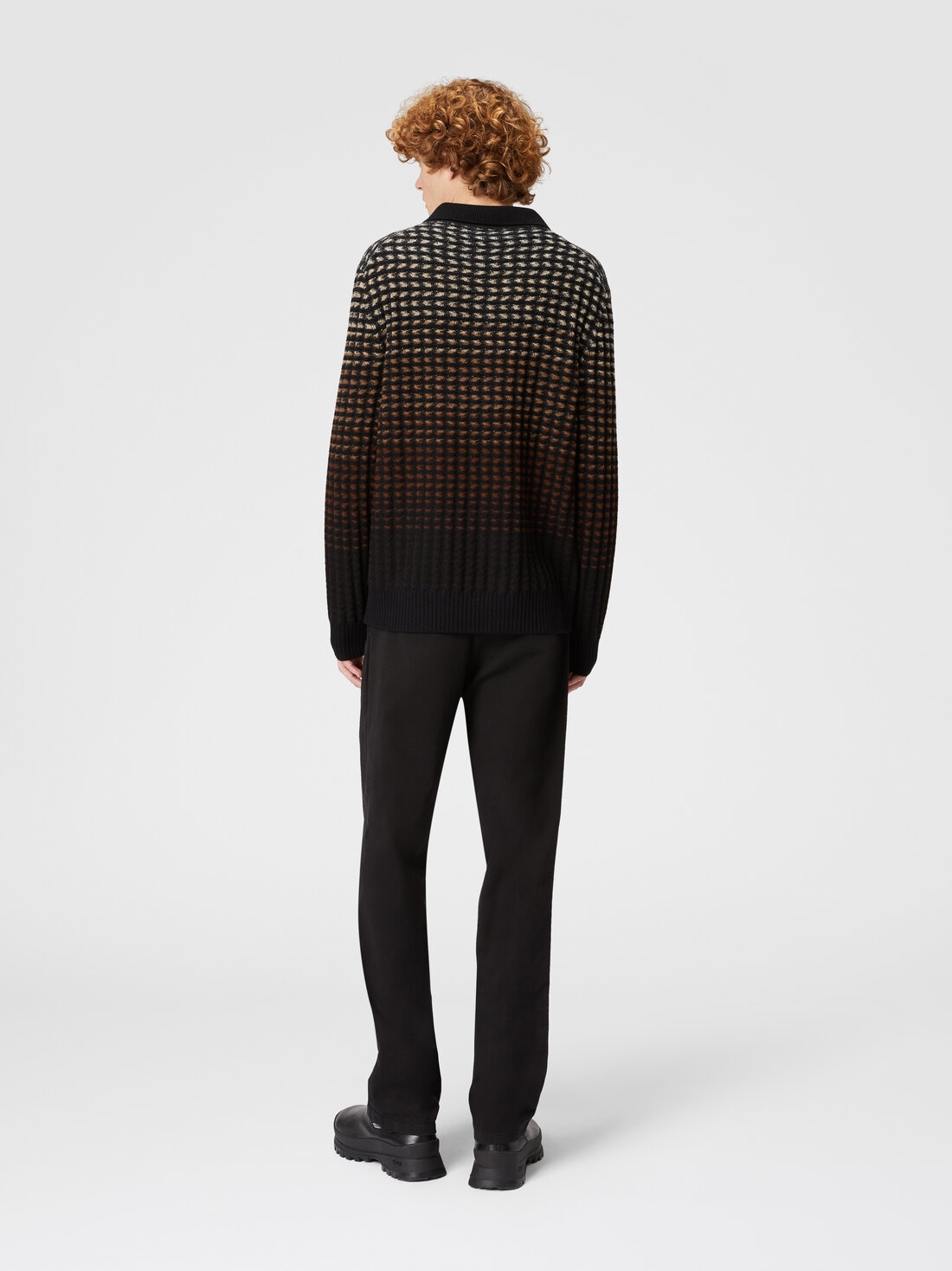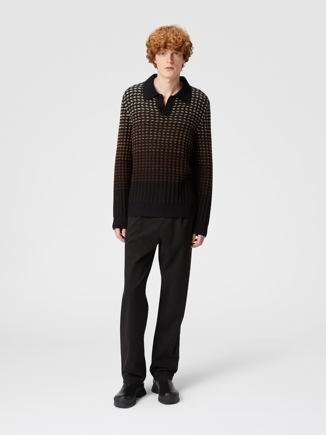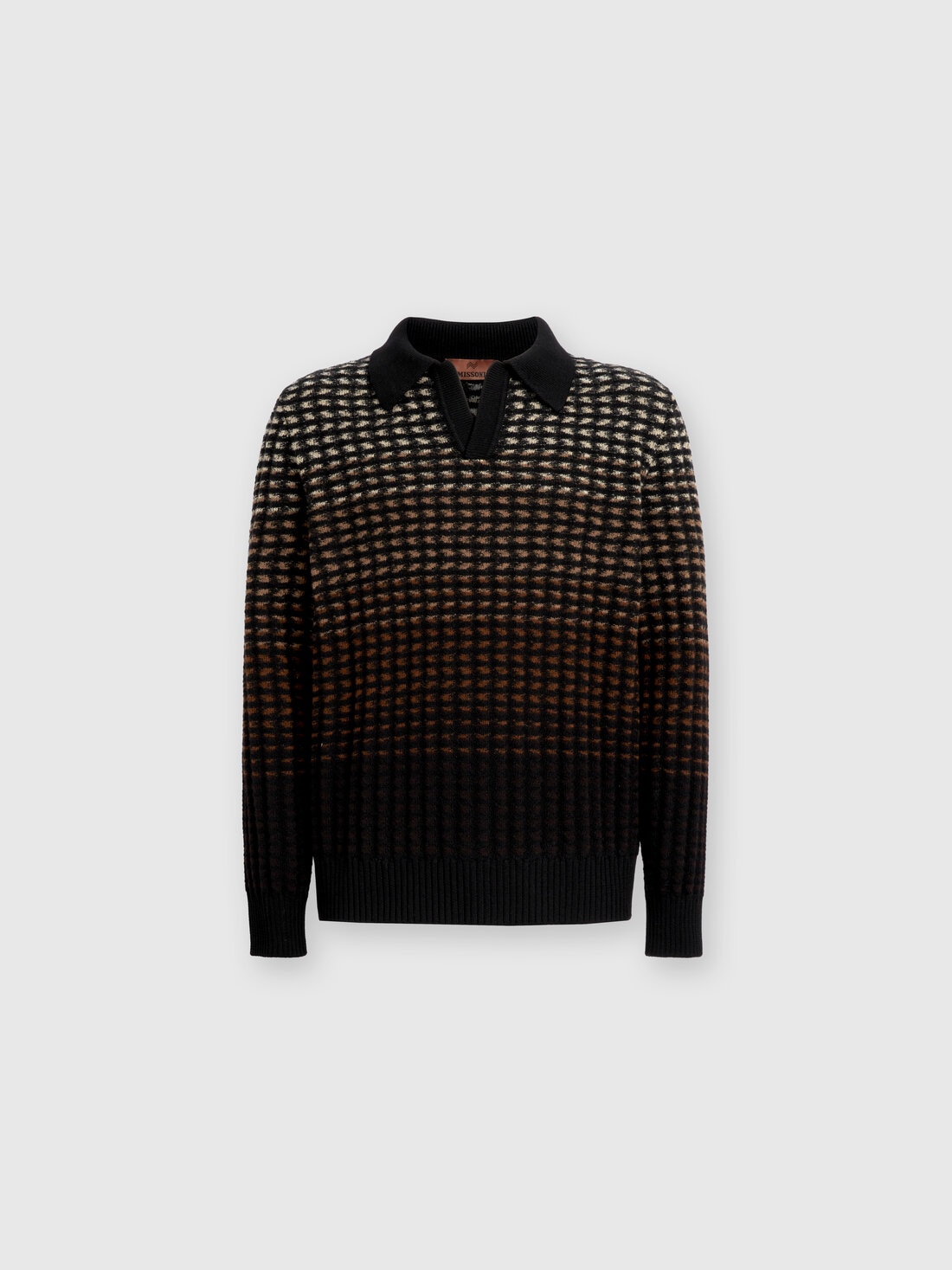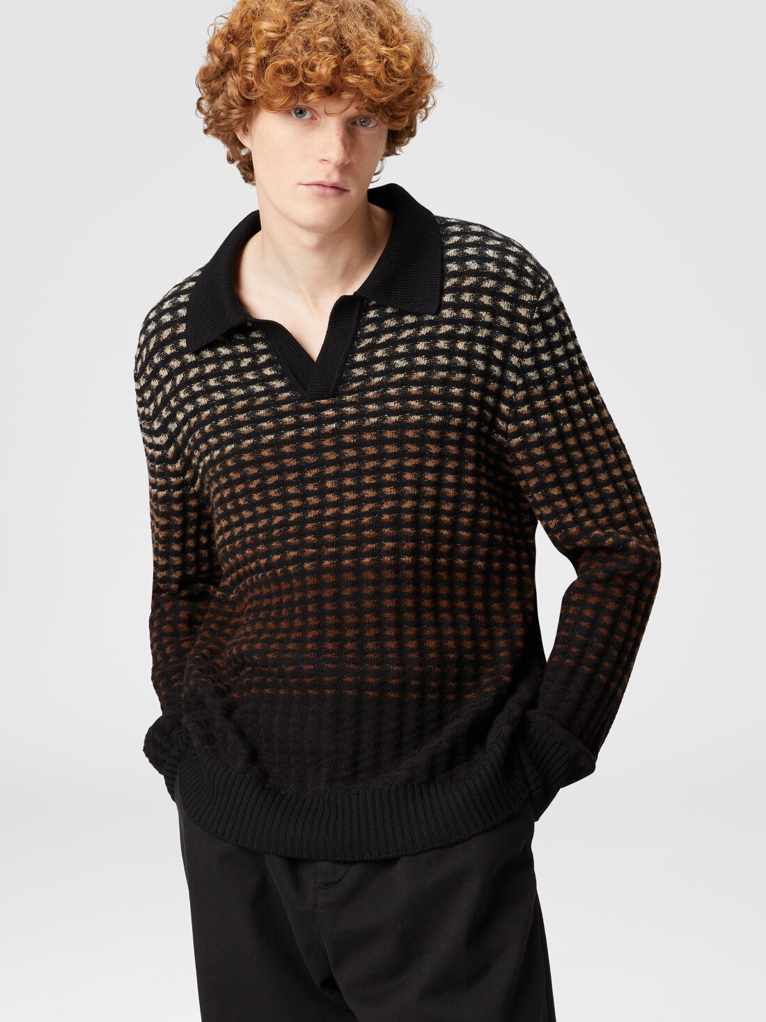Si colloca a metà fra una polo a maniche lunghe e un pullover con colletto a camicia il capo in maglia di pura lana vergine. Impreziosito dal punto operato con effetto sfumato, il modello è tanto versatile quanto inconfondibile.