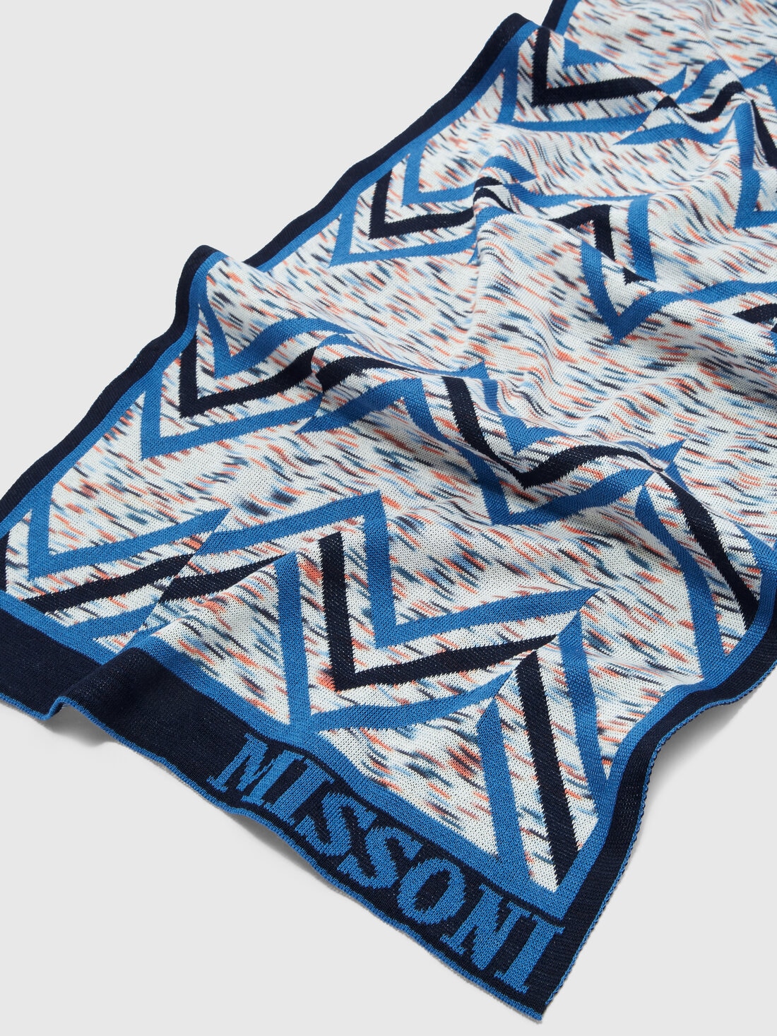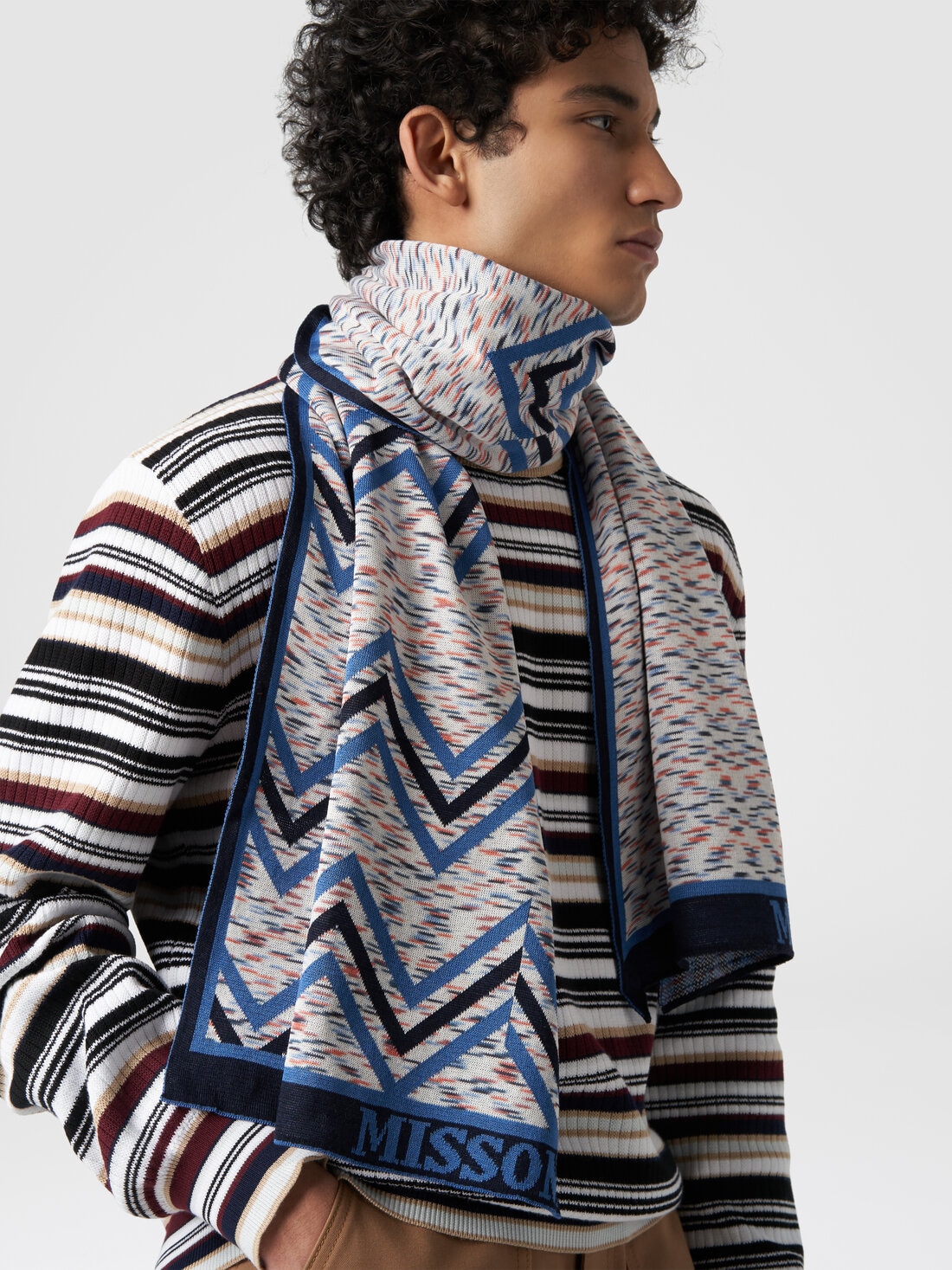 La sciarpa da uomo è un'opera d'arte tessile che cattura l'attenzione con la sua base fiammata e macro zig zag a contrasto. I bordi a tinta unita, impreziositi dal lettering logo Missoni, aggiungono un tocco di raffinatezza. Con dimensioni di 35x180 cm, la sciarpa avvolge con eleganza e stile, diventando un accessorio chic e versatile per qualsiasi occasione.