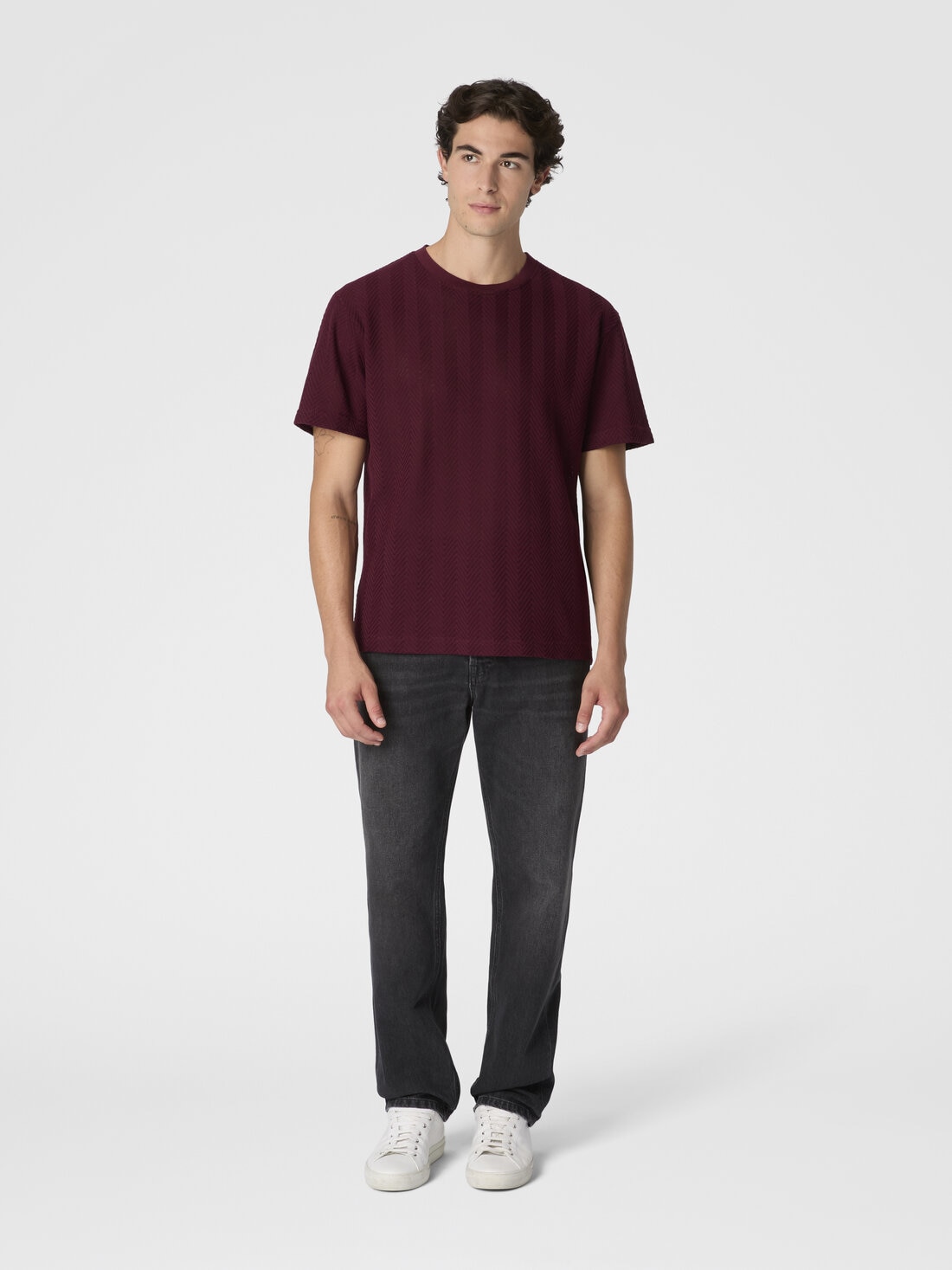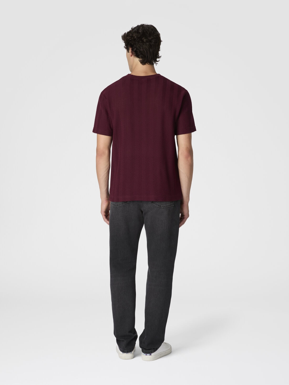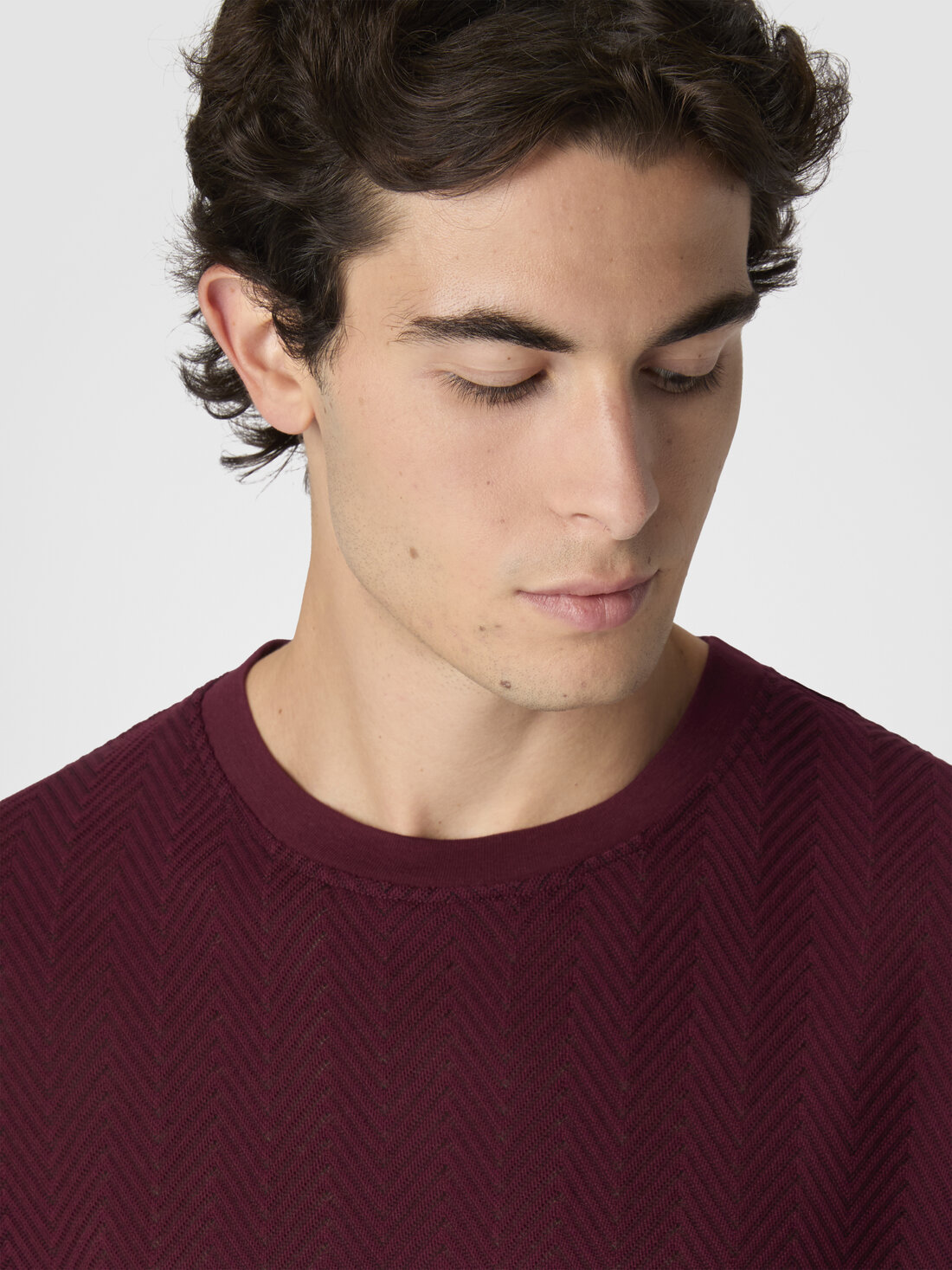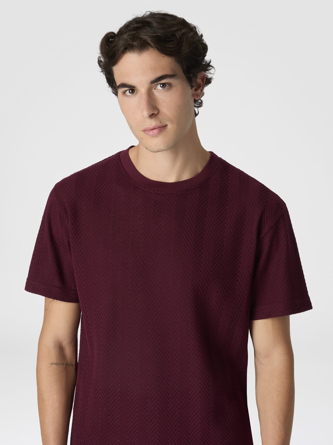 Una raffinata maglia di cotone e viscosa per la t-shirt girocollo da uomo a maniche corte. La lavorazione raschel con zig zag tono su tono caratterizza il modello dal fit rilassato.