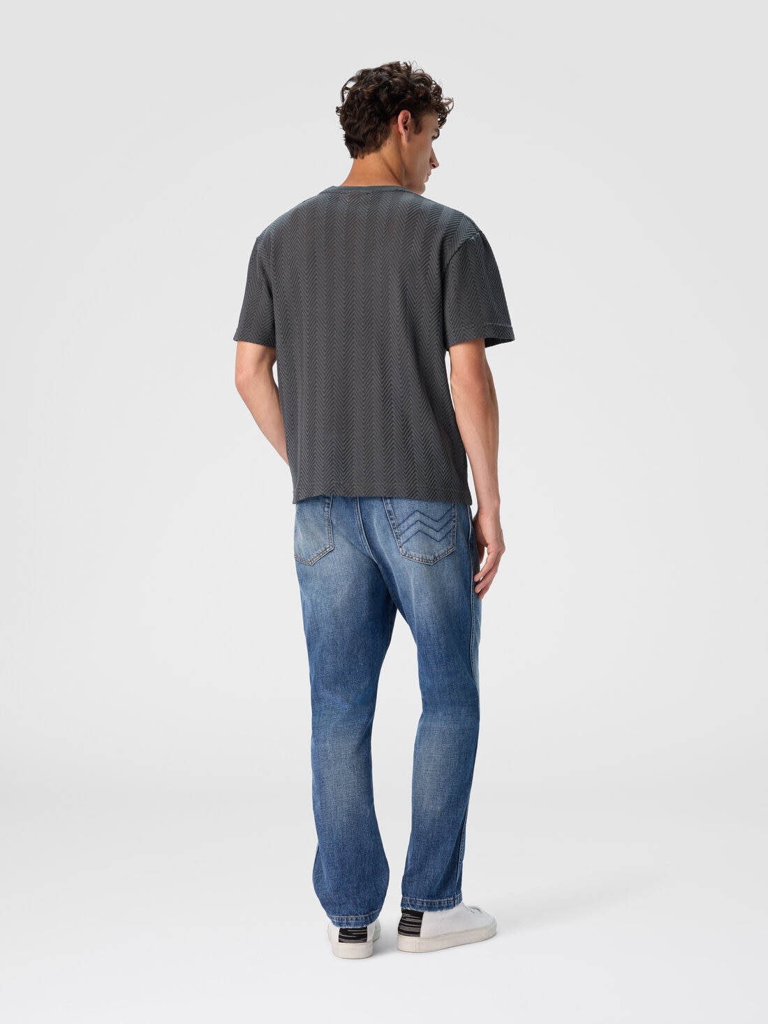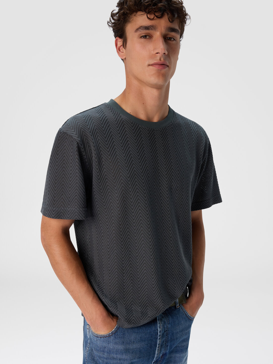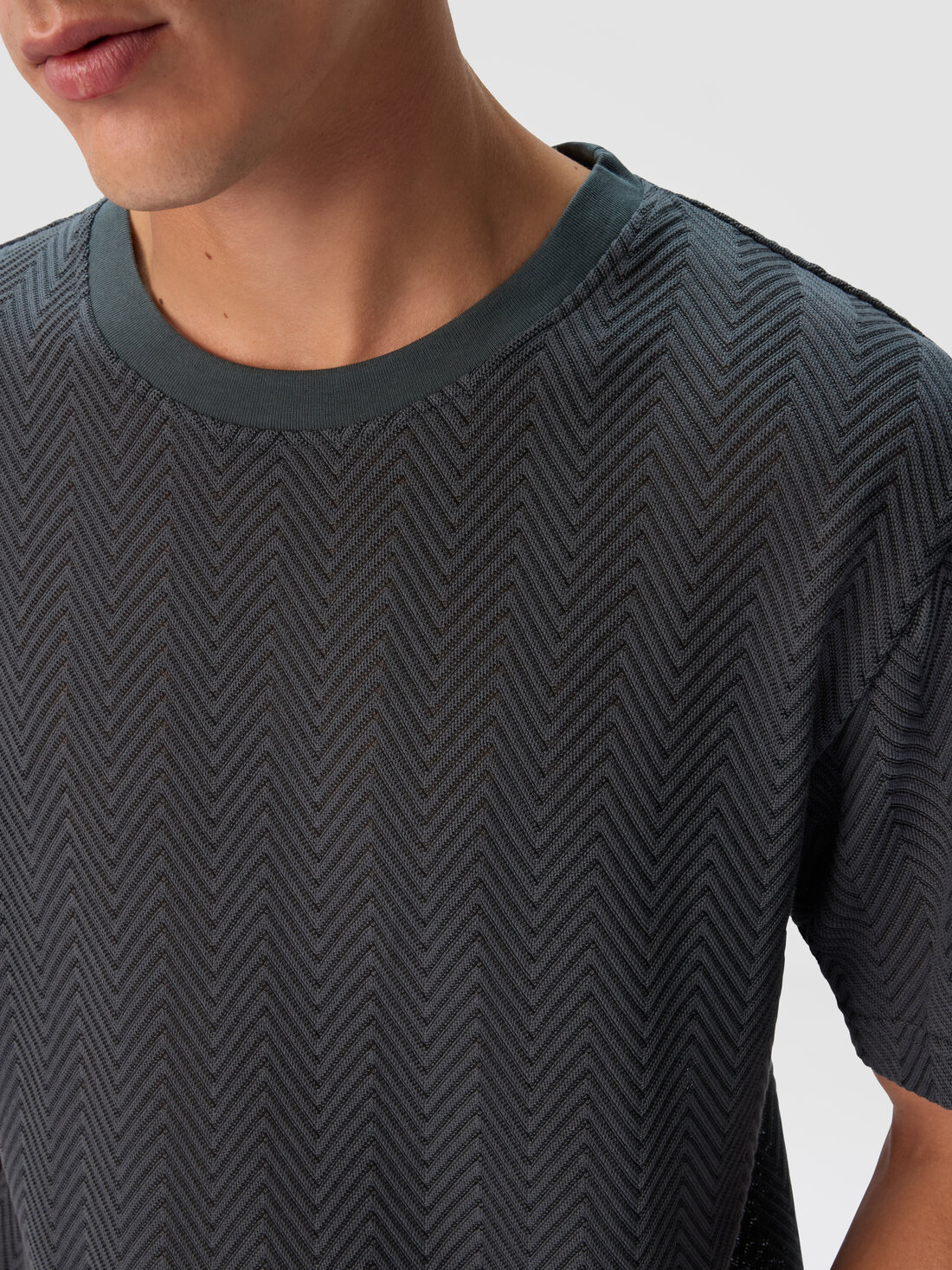 Una raffinata maglia di cotone e viscosa per la t-shirt girocollo da uomo a maniche corte. La lavorazione raschel con zig zag tono su tono caratterizza il modello dal fit rilassato.