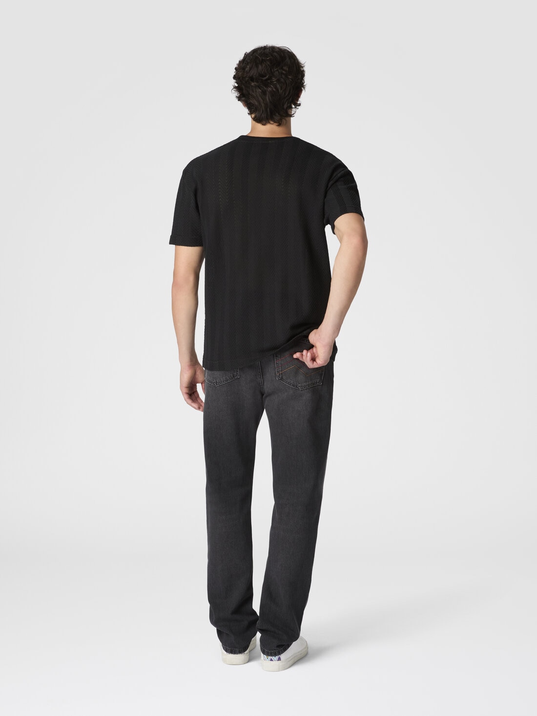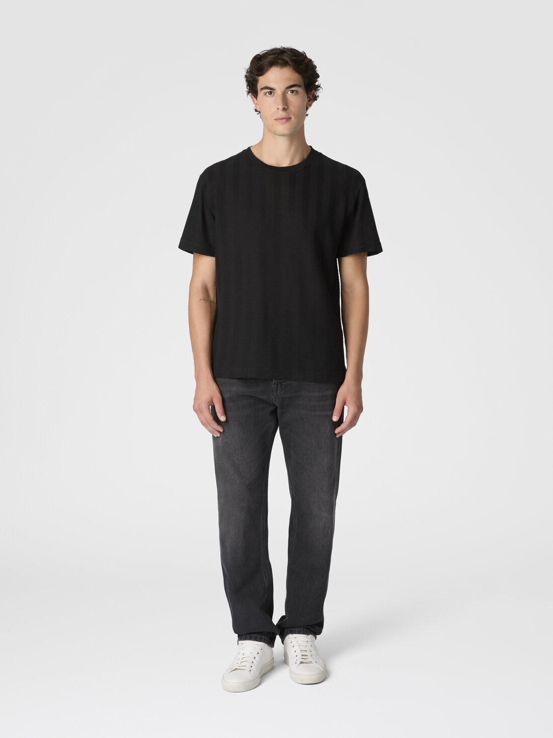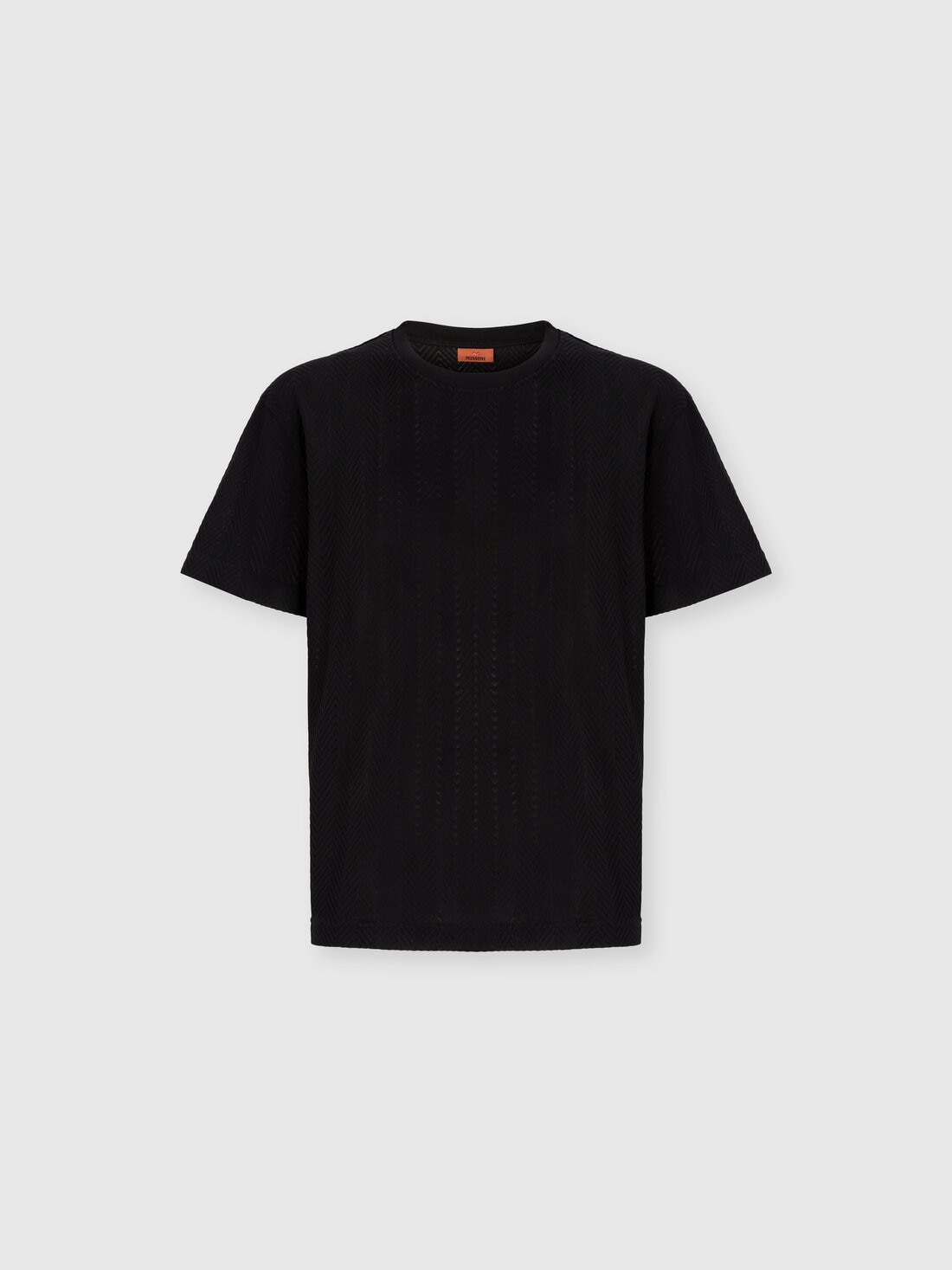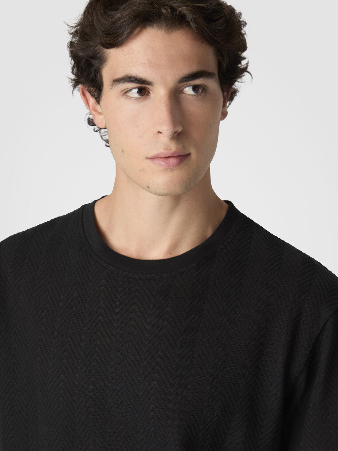 Una raffinata maglia di cotone e viscosa per la t-shirt girocollo da uomo a maniche corte. La lavorazione raschel con zig zag tono su tono caratterizza il modello dal fit rilassato.
