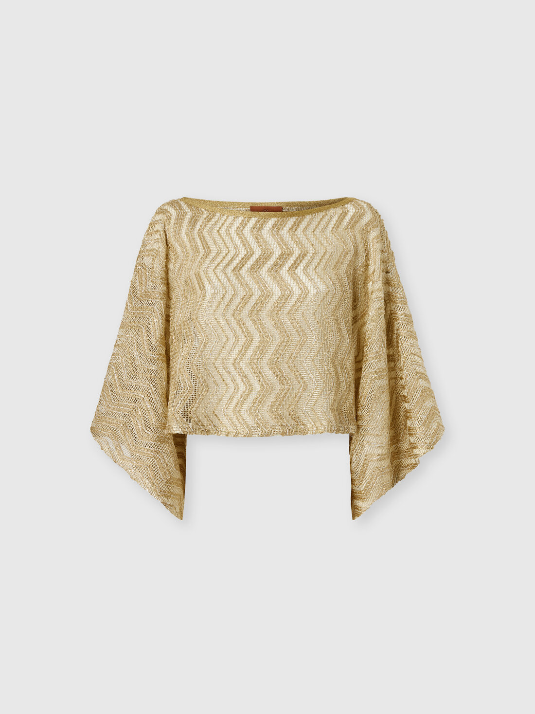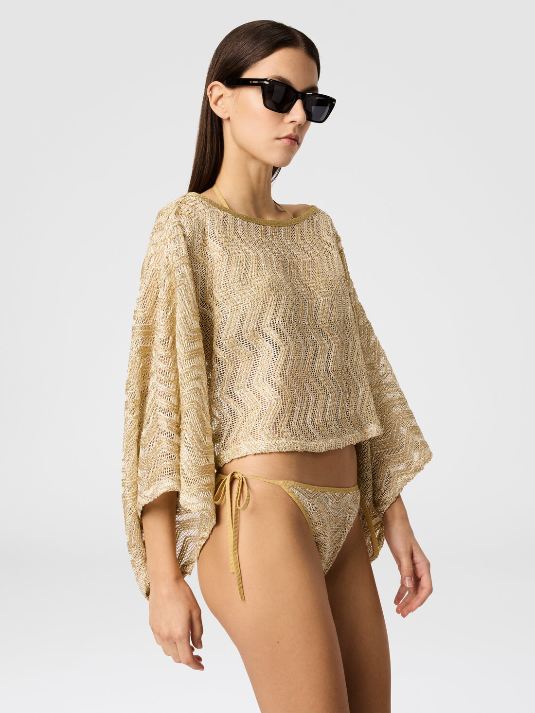 Trasparenze e dettagli luminosi definiscono questo top da donna a rete con motivo zig zag e paillettes, caratterizzato da maniche ampie e da un gioco di riflessi che esalta la leggerezza del tessuto.
