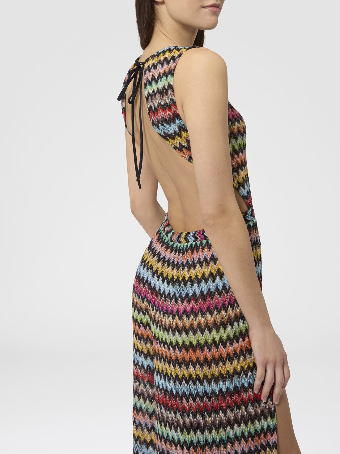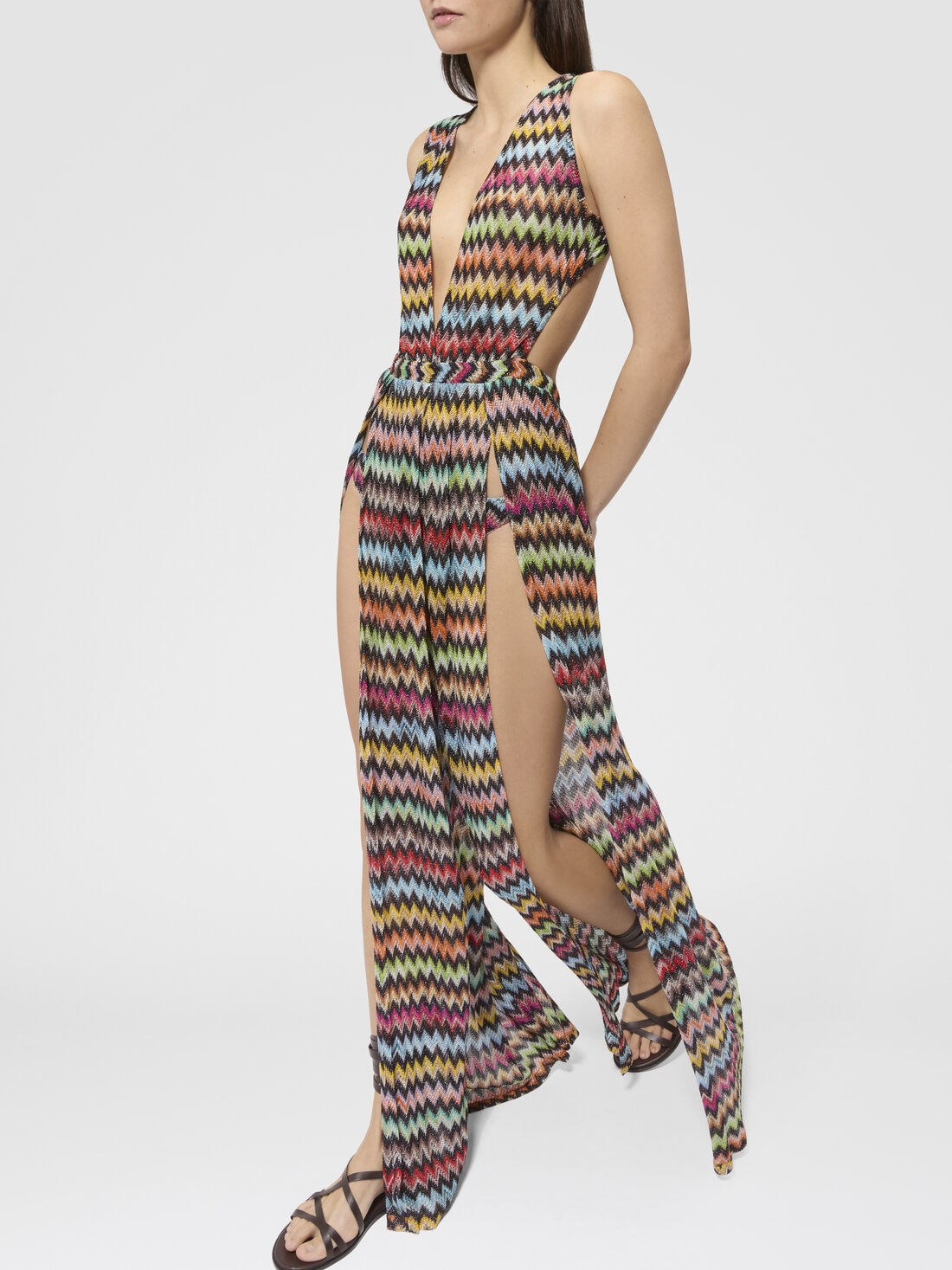 Questa tuta da donna in viscosa lamé è definita dal motivo micro zig zag. Il modello presenta una scollatura a V e spacchi laterali che donano dinamismo e leggerezza alla silhouette. La finitura luminosa del filato esalta la precisione grafica della trama, creando un'estetica sofisticata e contemporanea.
