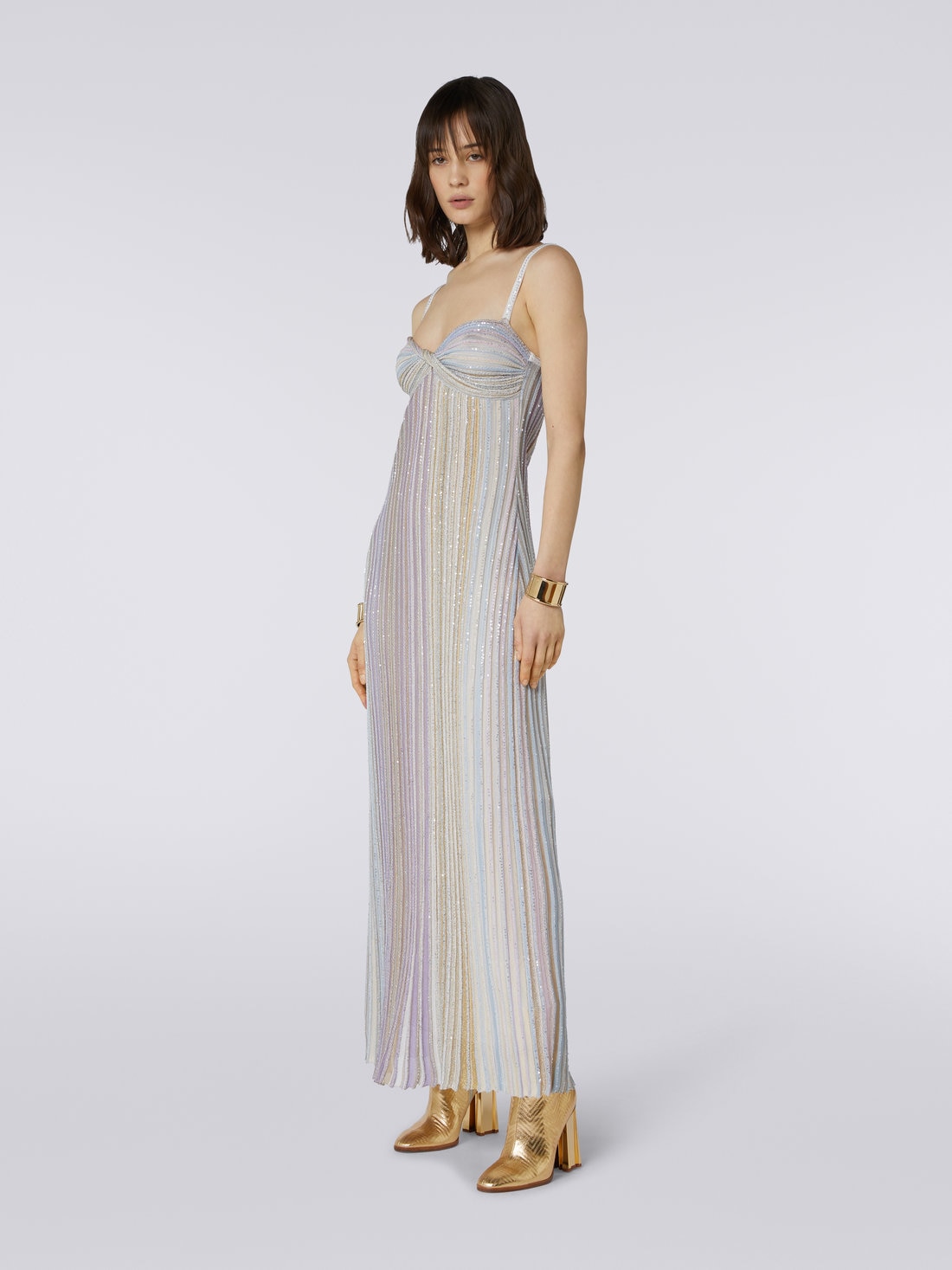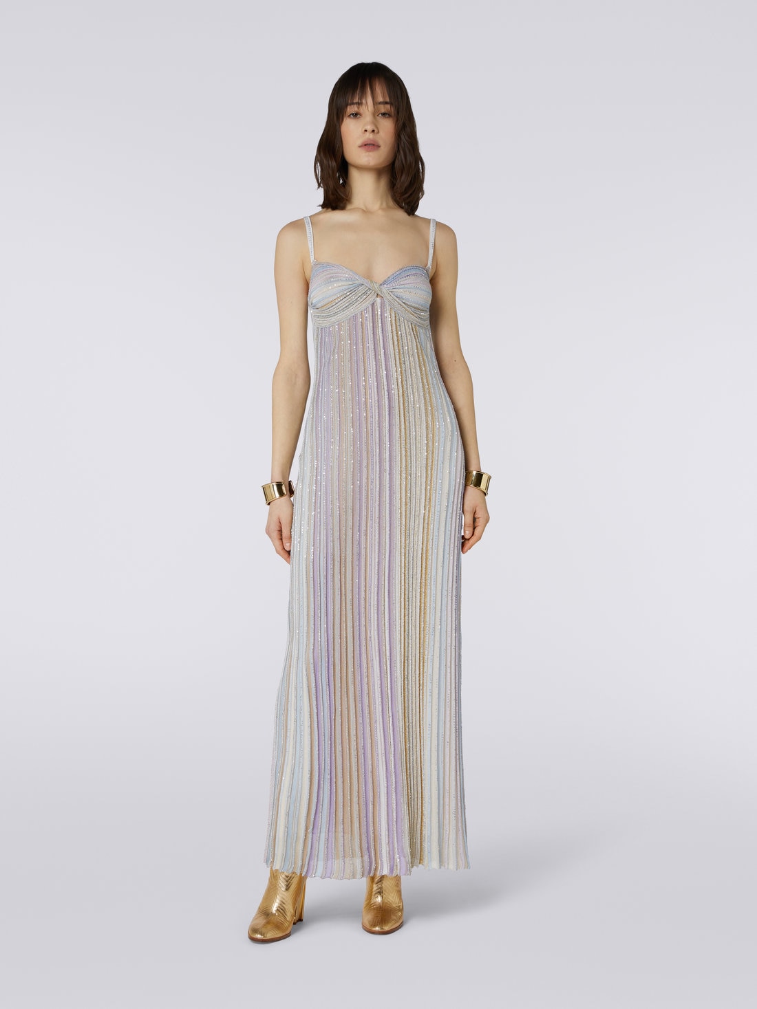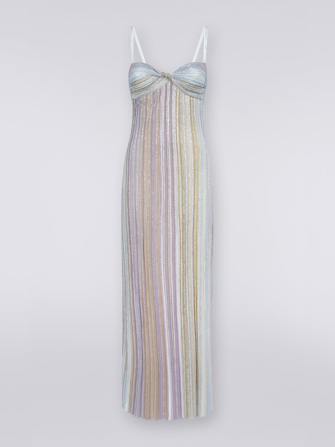Raffinatezza e grazia allo stato puro per l'abito lungo da donna Missoni. Interamente istoriate di paillettes, le righe verticali che si susseguono animano la fine maglia in misto viscosa del capo. Caratterizzato da fini spalline a tinta unita e da una particolare scollatura a fiocco, l'abito esprime con successo l'inconfondibile DNA Missoni.