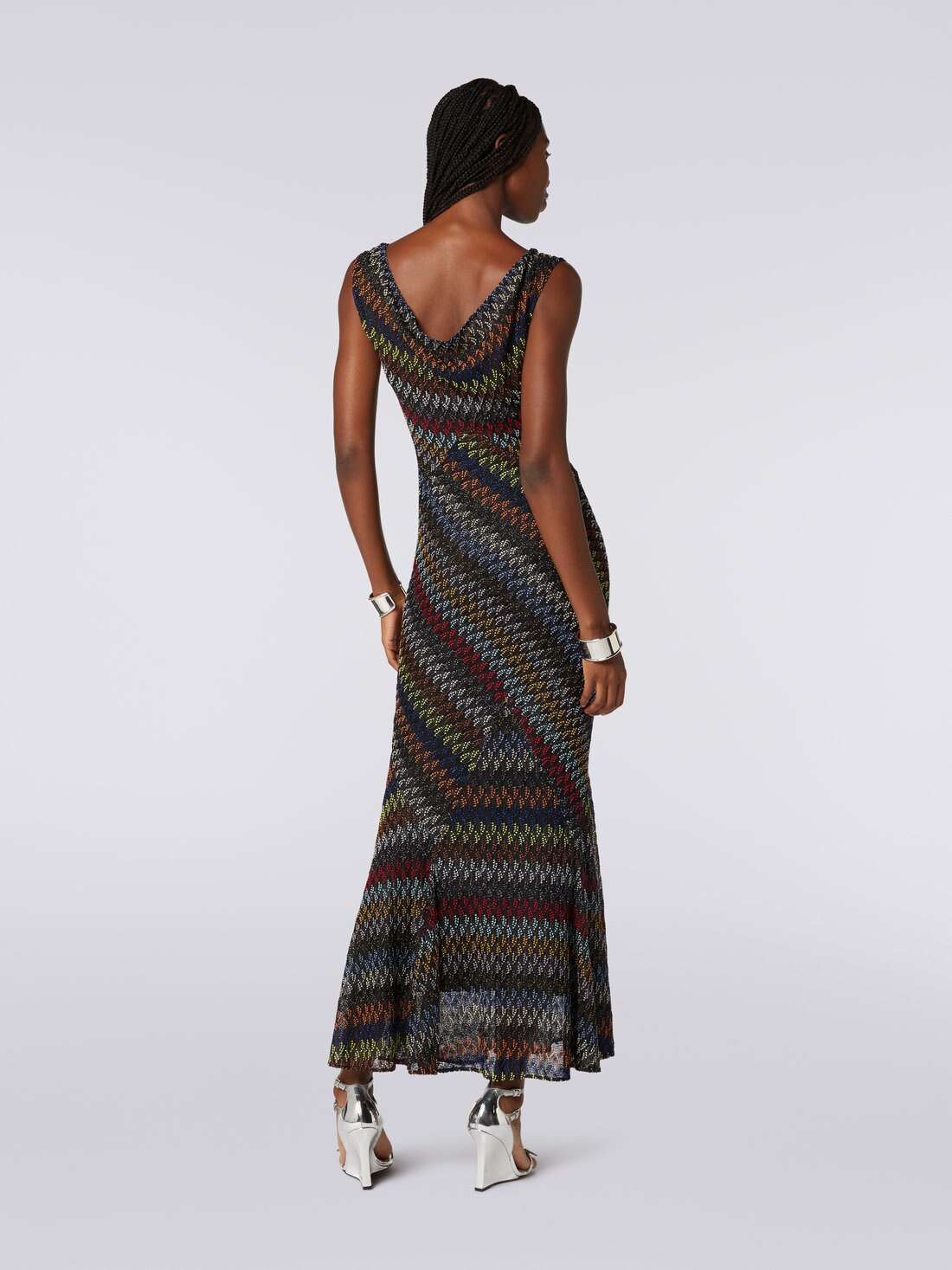 Opera d'arte di eleganza e originalità, l'abito lungo da donna senza maniche cattura lo sguardo con la sua trama intricata e vibrante. Realizzato con una sofisticata lavorazione Raschel multicolore, il modello esibisce scollatura a V anteriore e posteriore e presenta un finale svasato che aggiunge un tocco di grazia al capo.