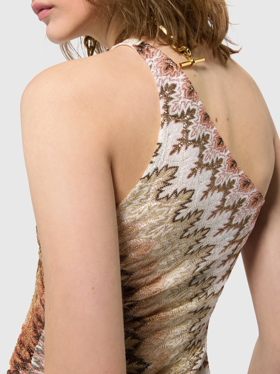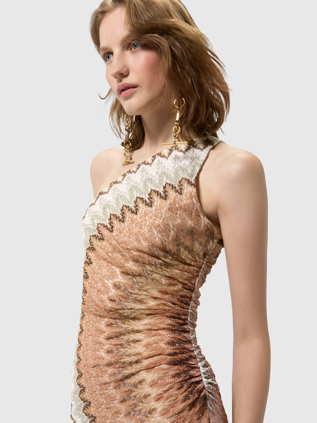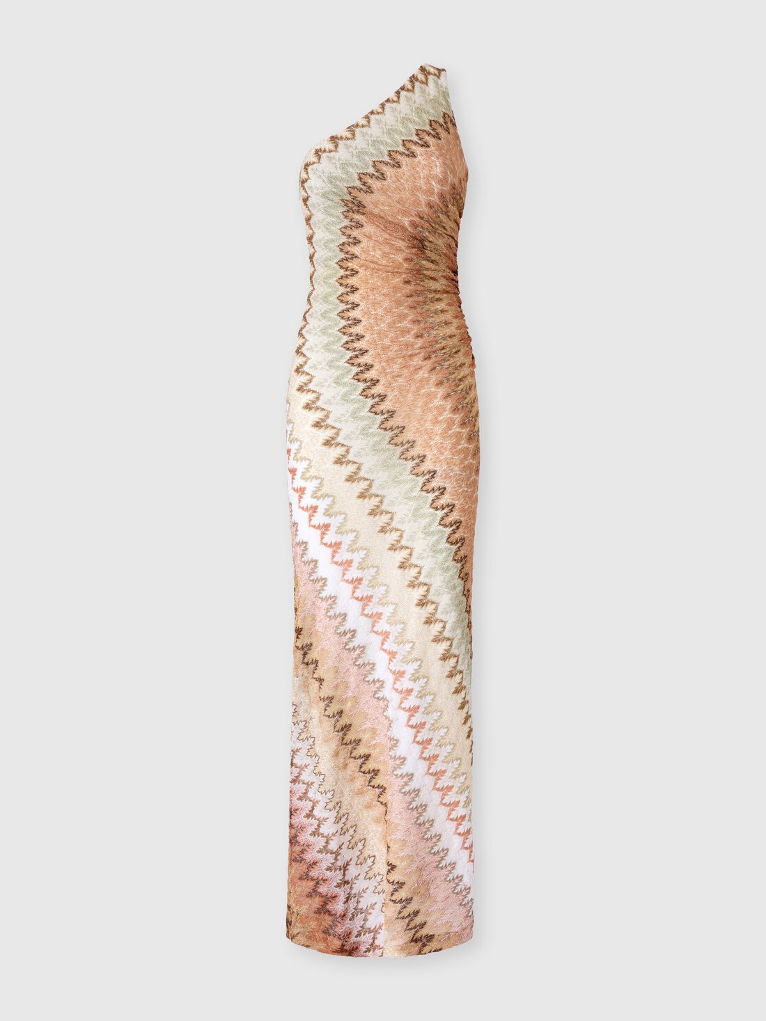 L’abito lungo da donna monospalla con lavorazione raschel in pizzo zig zag, proposto dalla maison in una preziosa versione in misto viscosa lamé, è una dichiarazione di eleganza contemporanea. La texture illuminata dal lamé avvolge la silhouette con sofisticata fluidità, mentre l’arricciatura e la spalla scoperta aggiungono un tocco di raffinata audacia.