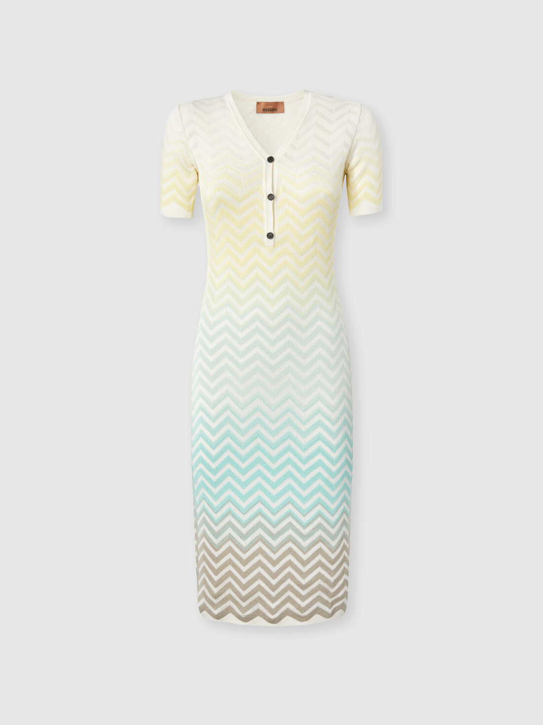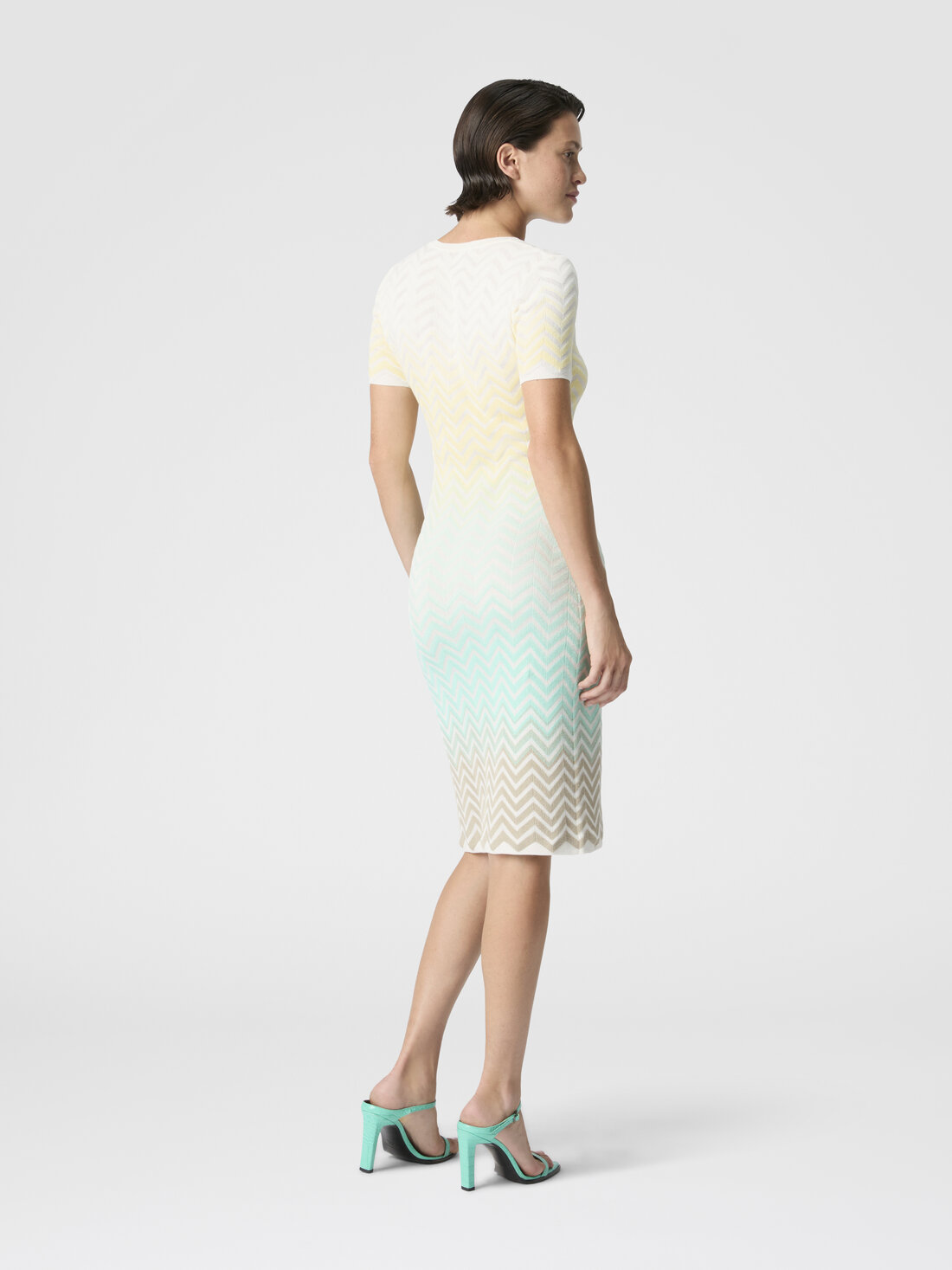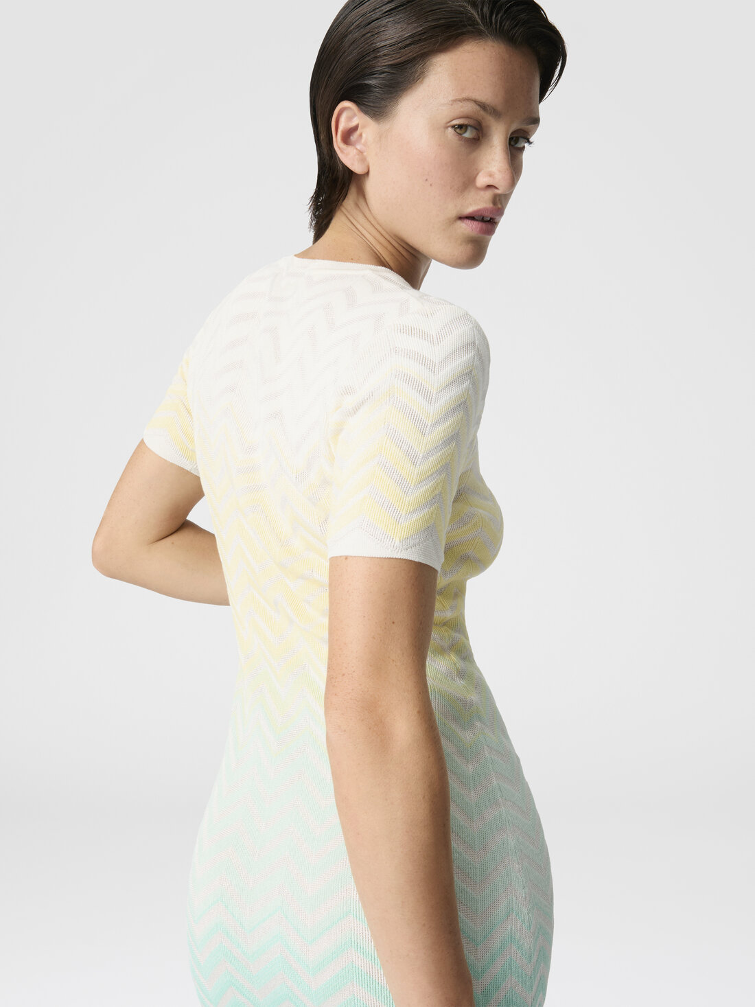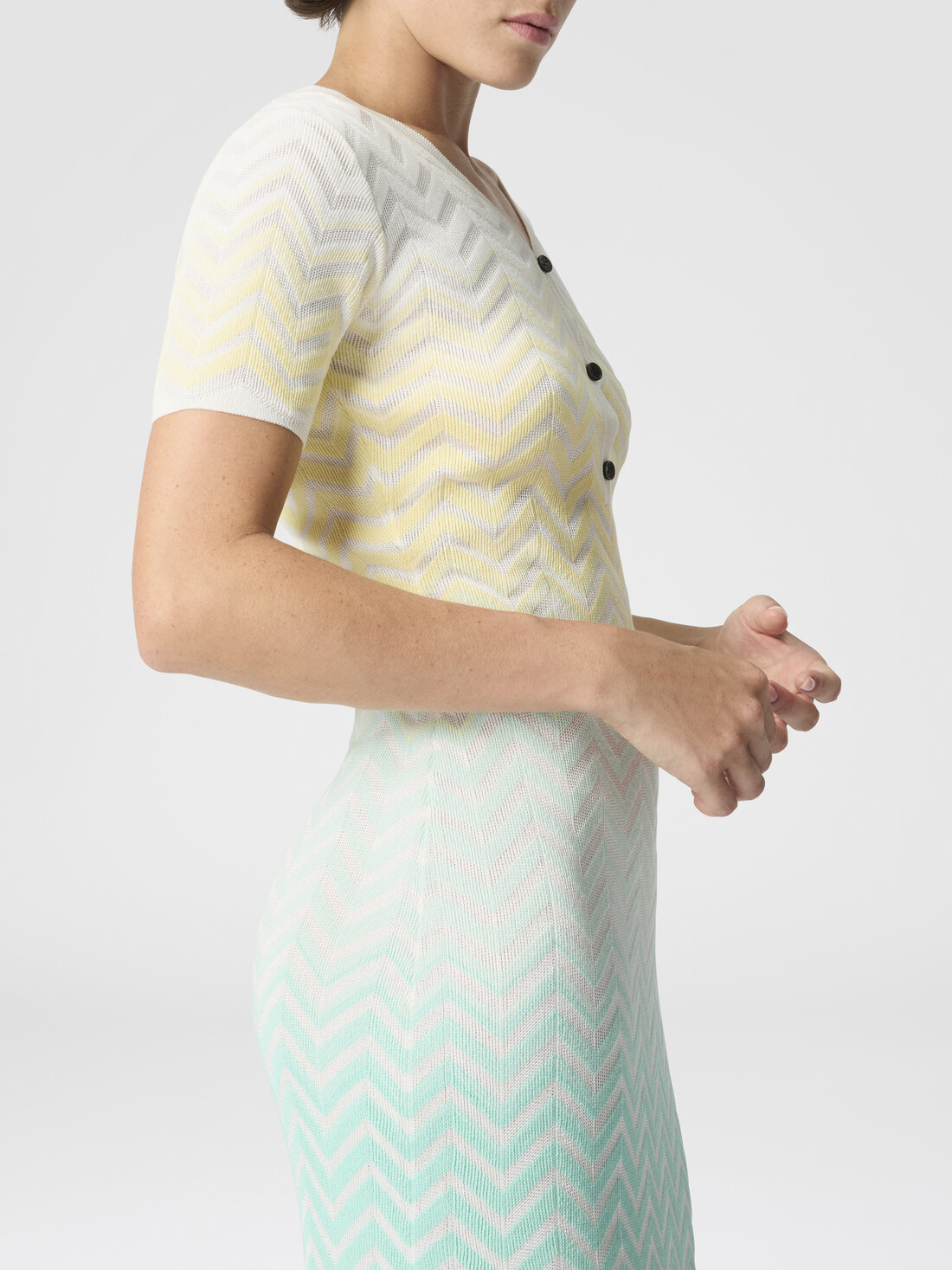 Un esempio di eleganza sofisticata firmata Missoni, questo abito midi da donna in cotone e viscosa con profonda scollatura a V è impreziosito da un motivo chevron dégradé. Le sfumature delicate e la texture raffinata esprimono la maestria artigianale della maison.