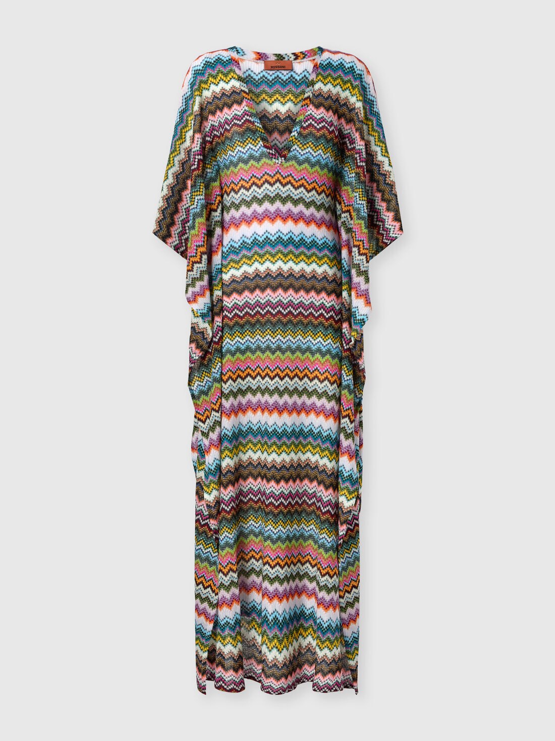 Per completare gli outfit da spiaggia con il design inconfondibile della maison, il caftano copricostume lungo da donna in lavorazione raschel con motivo a micro zig zag effetto pixel si distingue per la texture ricercata e il carattere sofisticato.